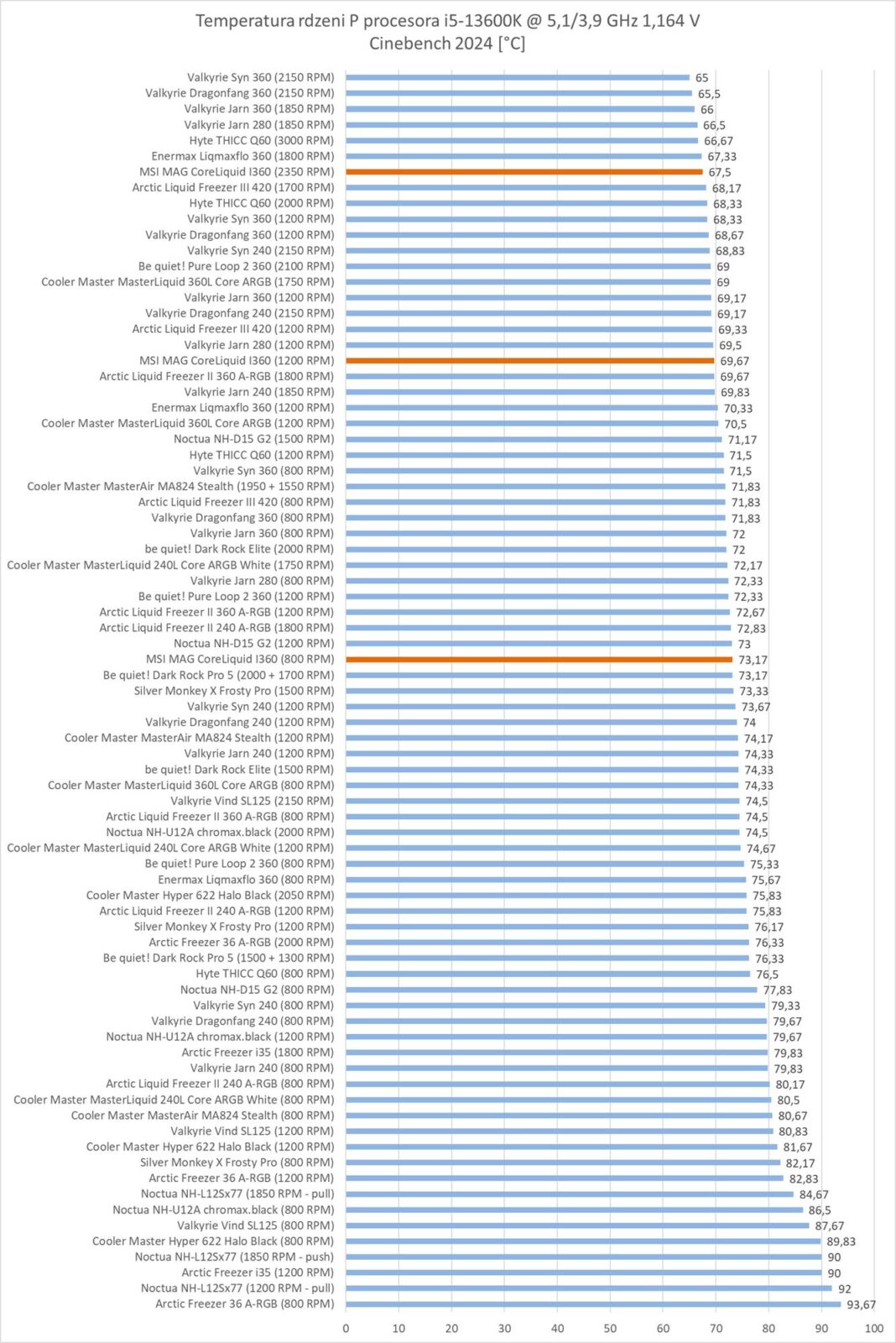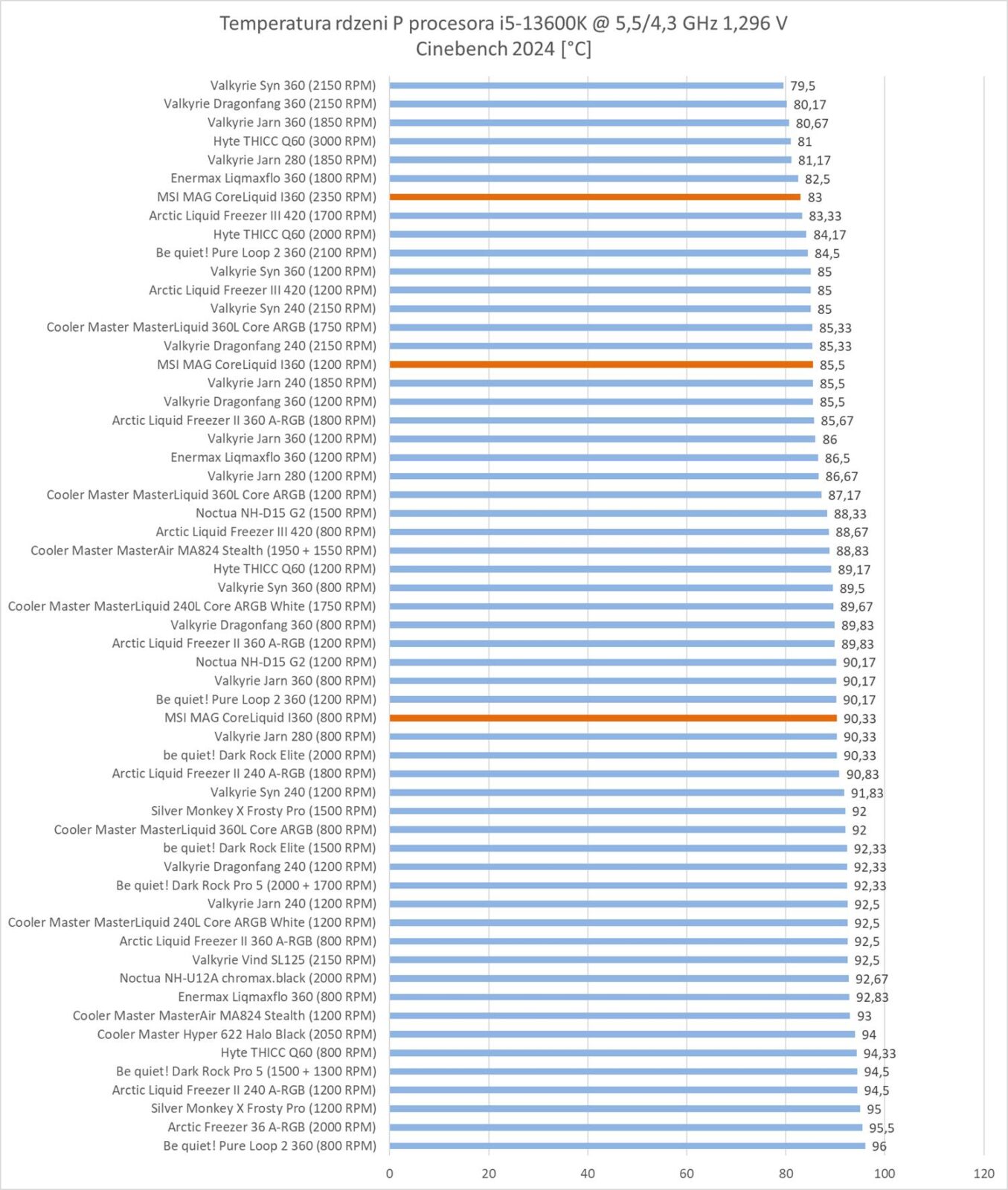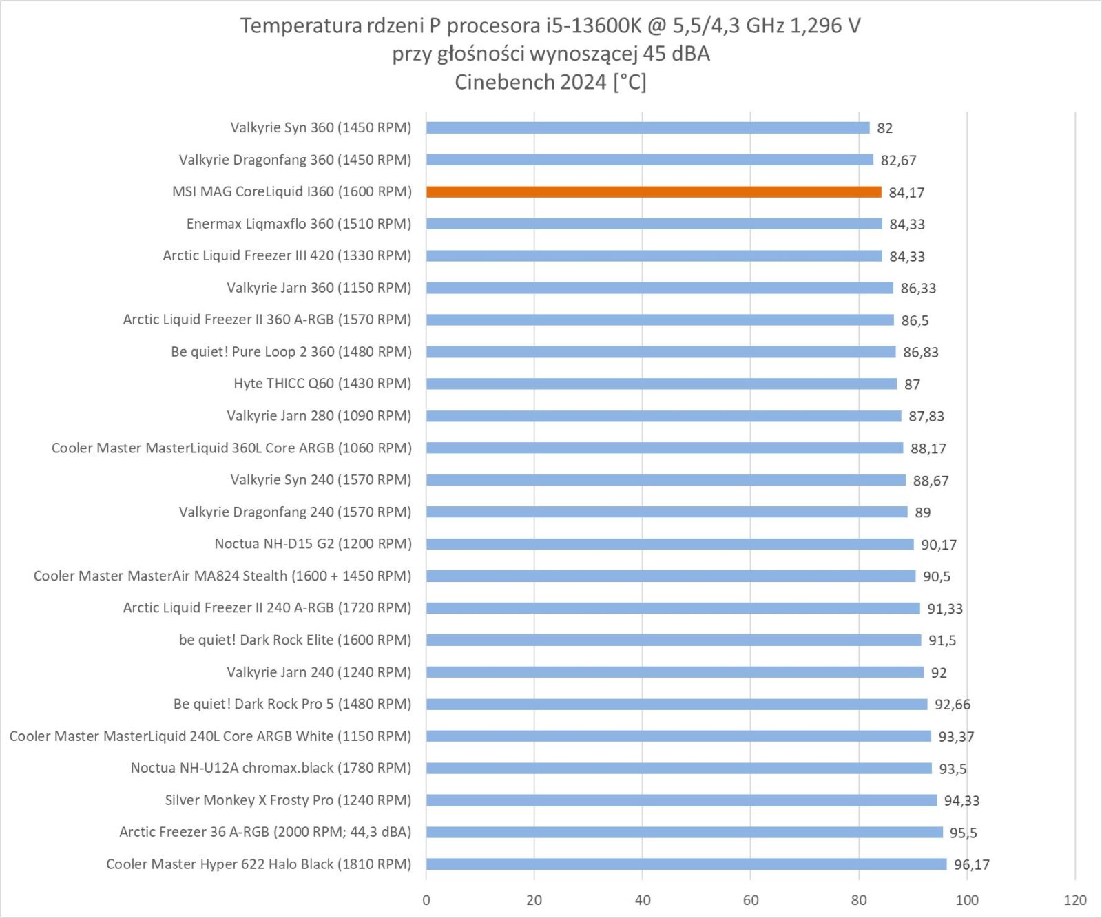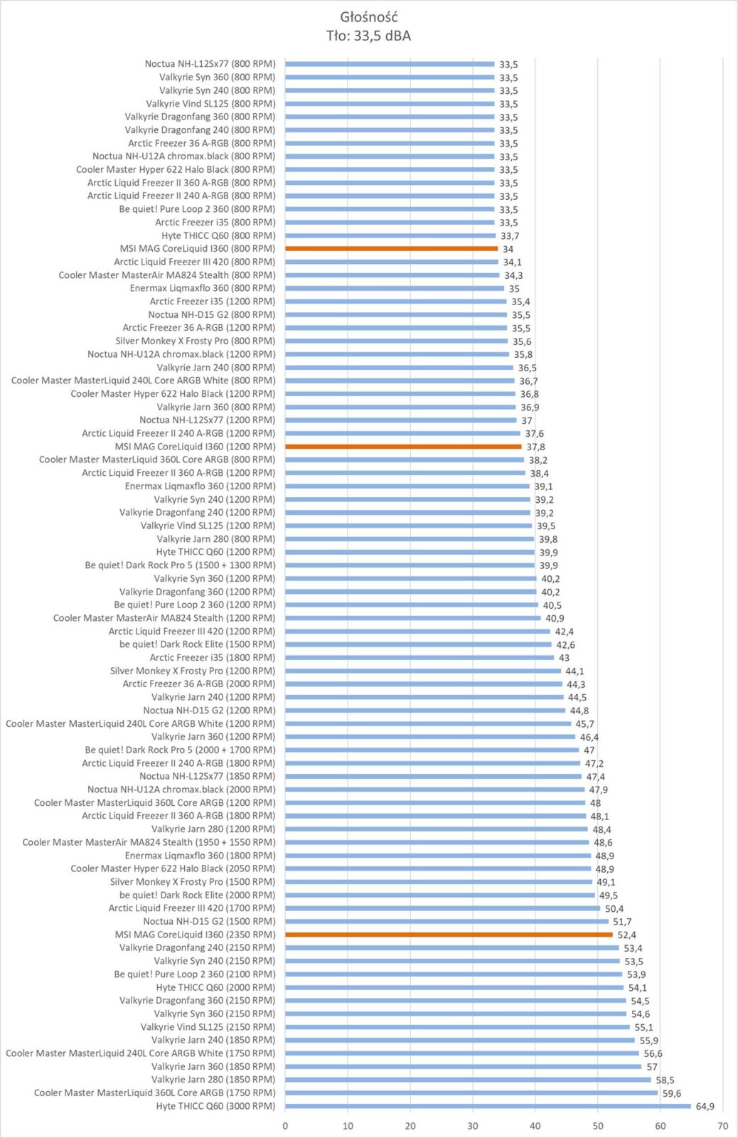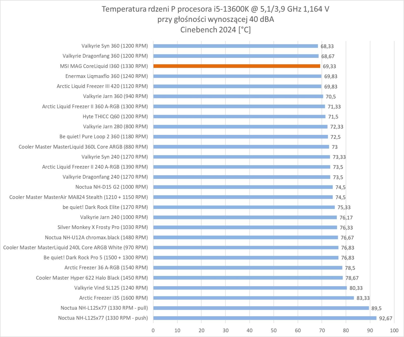 MSI MAG CORELIQUID I360 wypada za to bardzo dobrze przy normalizacji głośności. Wynik plasuje go na 3 miejscu i chłodzenie przegrywa tylko z konstrukcjami Valkyrie.