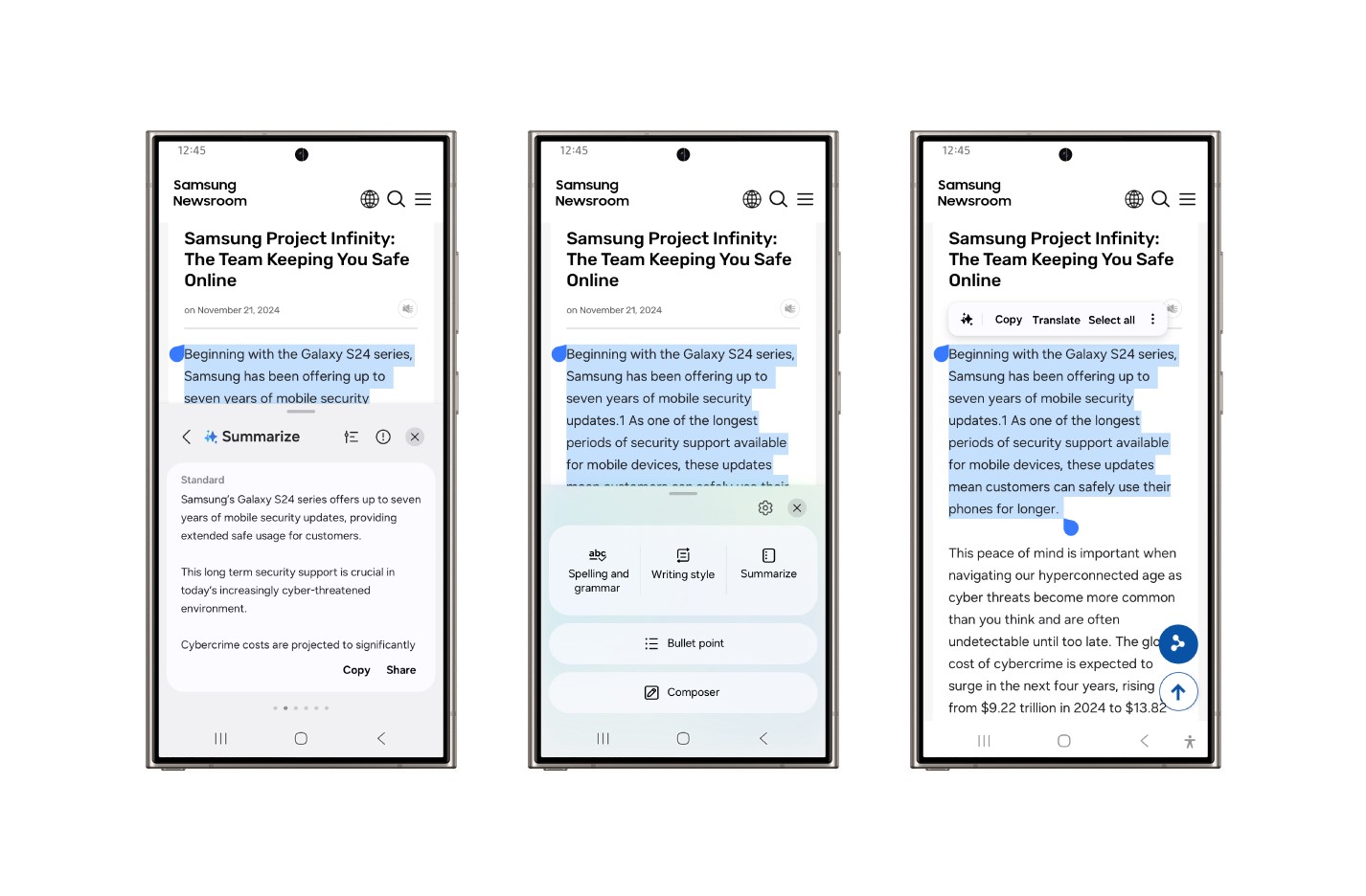 Z racji, że w tym roku Samsung, tak samo jak inni producenci, stawia na sztuczną inteligencję, to takich zmian również nie mogło tutaj zabraknąć. One UI 7 wprowadzi kolejne zaawansowane funkcje Galaxy AI, takie jak zwiększające produktywność, wszechstronne narzędzia wspomagające pisanie. Dzięki integracji z systemem operacyjnym AI OS użytkownicy mogą na przykład zaznaczać teksty bez potrzeby przełączania aplikacji. Nowość uzupełnia istniejące już narzędzia, takie jak podsumowywanie treści, sprawdzanie pisowni i gramatyczki czy automatyczne formatowanie notatek.