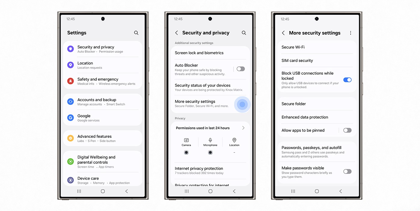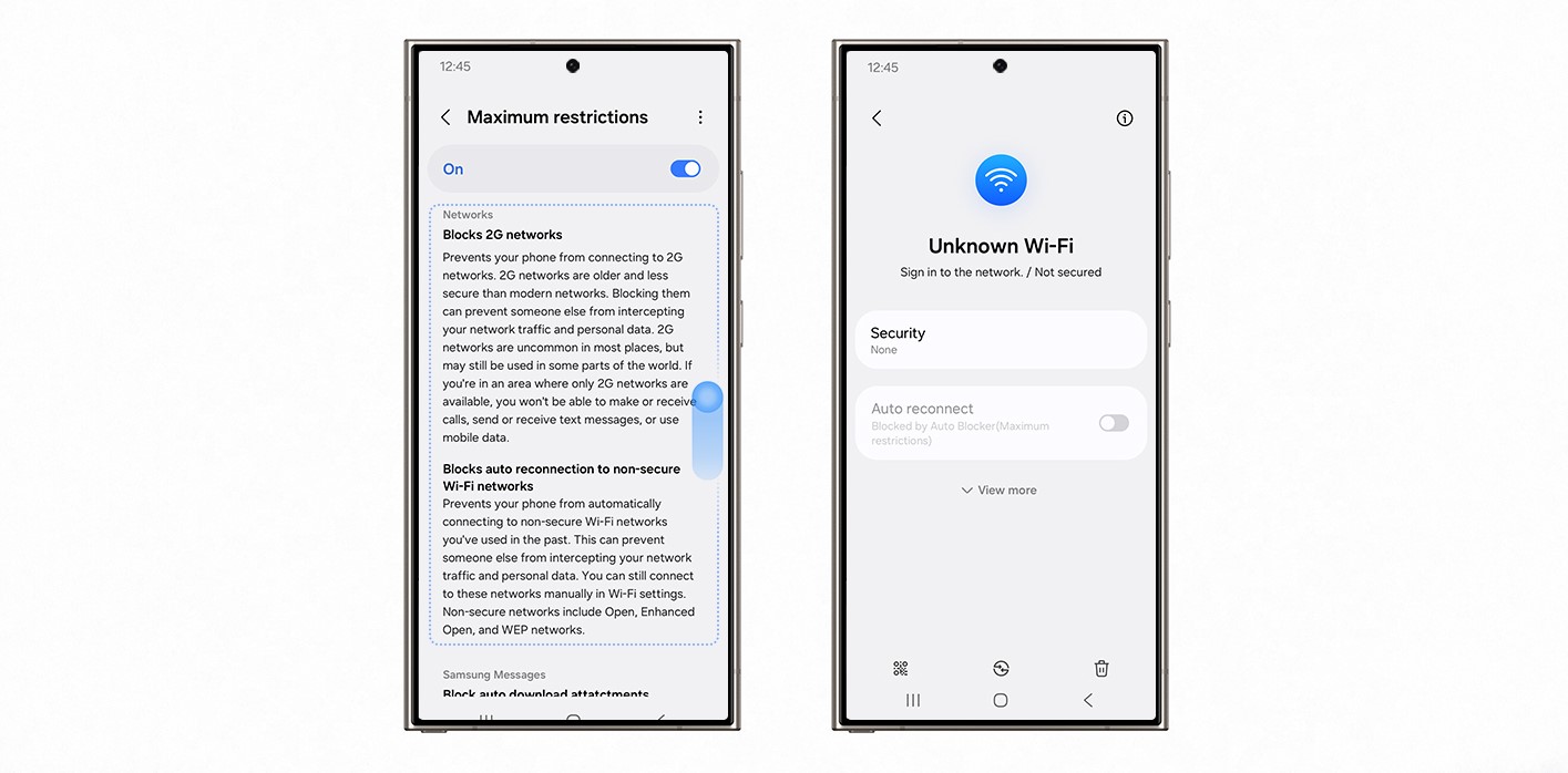 Kolejną formą ochrony będzie ulepszona opcja maksymalnych ograniczeń, która już teraz pozwala zabezpieczyć się przed cyber zagrożeniami. Samsung doda do niej nowe funkcje, takie jak dodatkowa kontrola połączeń sieciowych – możemy zablokować usługi 2G i zapobiec przechwytywaniu danych w przypadku połączenia z potencjalnie niebezpiecznymi sieciami. Pozwoli to również na uniknięcie niezamierzonego automatycznego połączenia się z niektórymi sieciami Wi-Fi, choć wciąż w razie potrzeby będzie można uzyskać takie połączenie ręcznie.