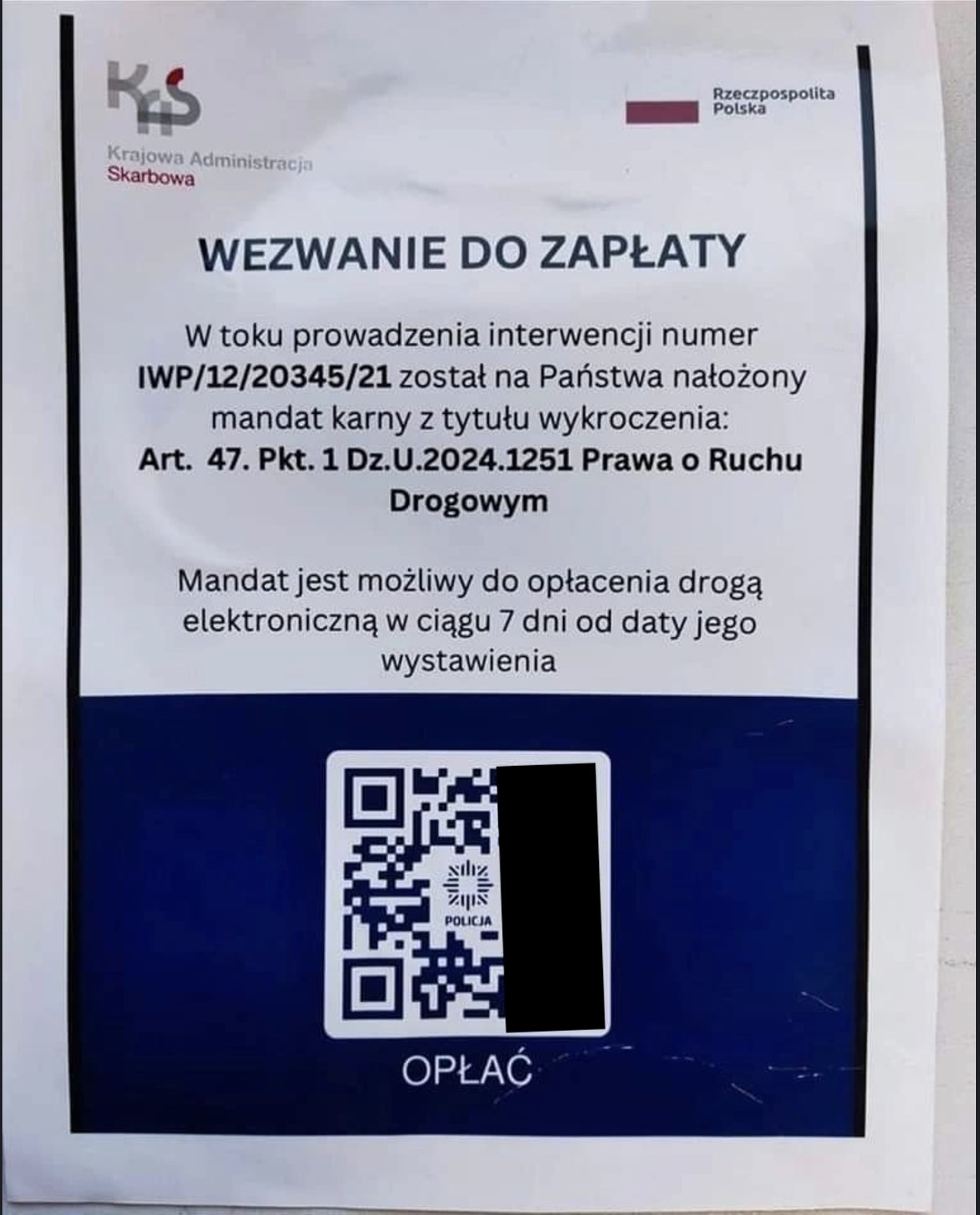 O sprawie donosi facebookowy profil serwisu Sekurak.pl, za sprawą jednego z czytelników, który nadesłał zgłoszenie z Wrześni w okolicach Poznania. To tam za wycieraczkami aut kierowcy zaczęli znajdować pozornie wyglądające na oficjalne wezwania do zapłaty z tytułu rzekomego naruszenia Prawa o Ruchu Drogowym. Widnieje na nich logo Krajowej Administracji Skarbowej mające uwiarygadniać dokument, a nawet konkretny artykuł stanowiący przedmiot naruszenia. Na samym spodzie widnieje też kod QR (z napisem Policja), który miałby pozwolić kierowcy na błyskawiczne opłacenie mandatu. Przekierowuje on na specjalnie spreparowaną stronę, gdzie oczywiście trzeba podać dane karty płatniczej.