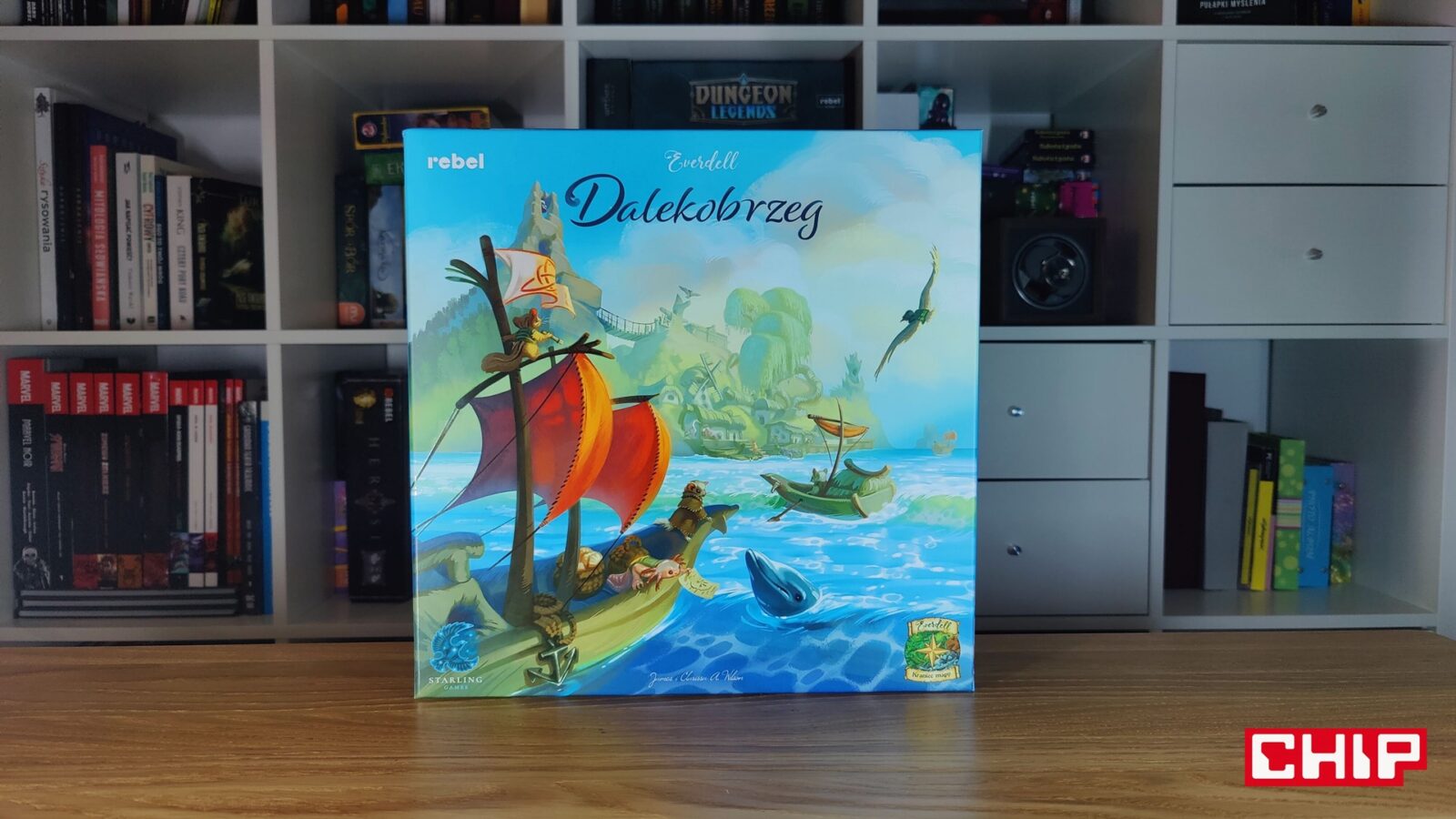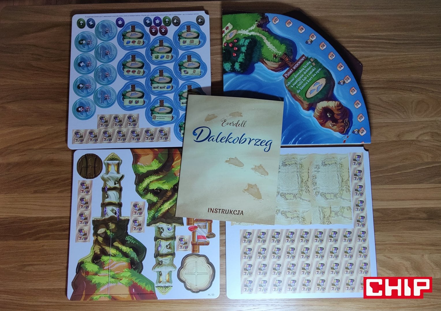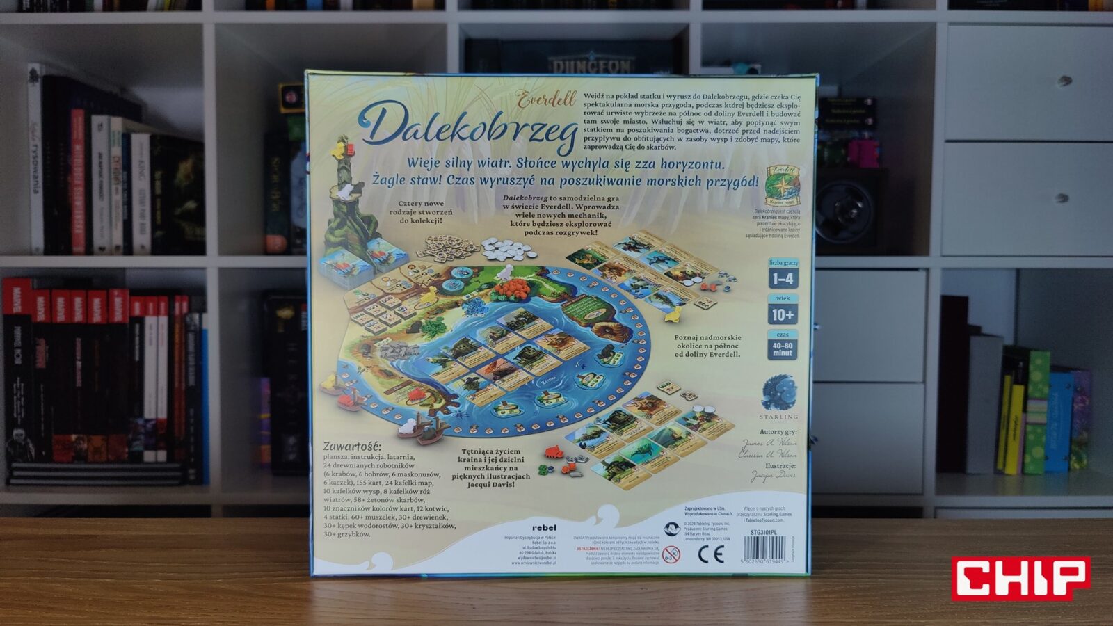 Everdell: Dalekobrzeg to w pełni samodzielna odsłona serii, która stawia przed nami dokładnie to samo wyzwanie – zbudowanie w ograniczonym czasie możliwie najlepiej prosperującego miasta, ale tym razem nie w leśnej, a wyspiarskiej scenerii. W pudełku znajdziemy przede wszystkim zestaw elementów dla czterech graczy (drewniane figurki różnego koloru, plastikowe statki z tekturowymi żaglami i metalowe kotwice), 155 kart, dziesiątki żetonów skarbów z twardej tektury, surowce (drewniane kłody, plastikowe muszelki i kryształki, gumowe grzybki oraz wodorosty) oraz tekturowe kafelki map, wysp i róż wiatrów. Producent postarał się też o komponenty do gry jednoosobowej, które wprowadzają do gry przeciwnika oraz karty pogody, nadające rozgrywce nieco nieprzewidywalny charakter.