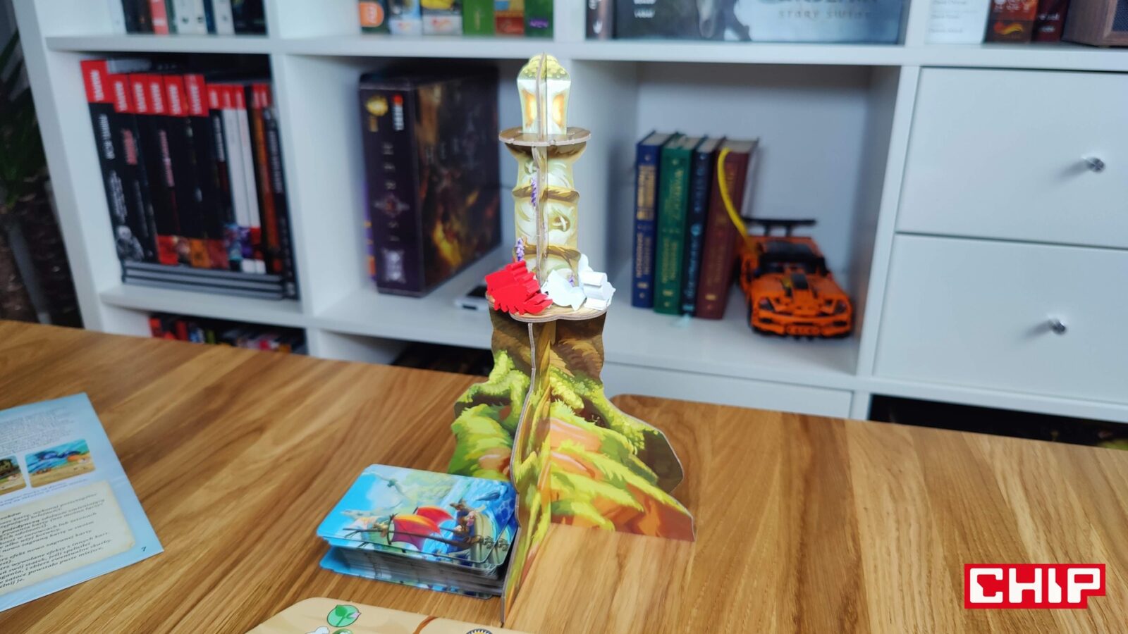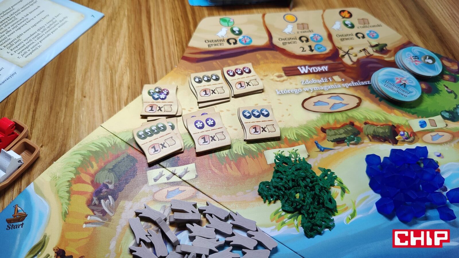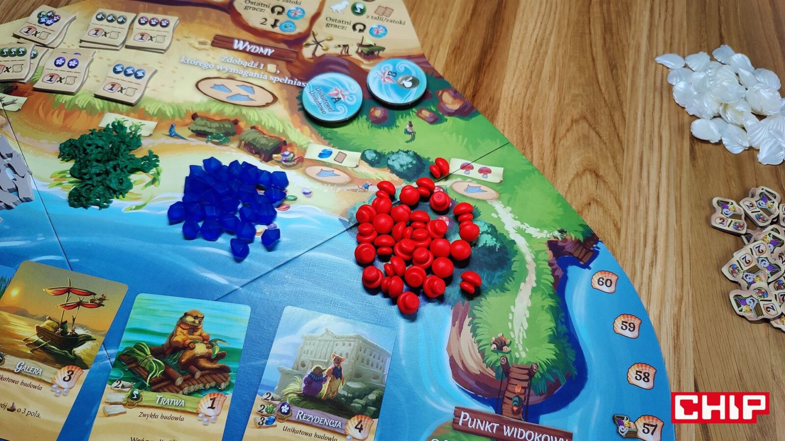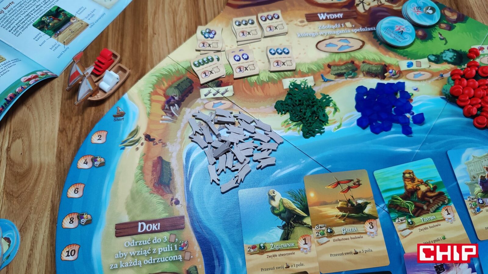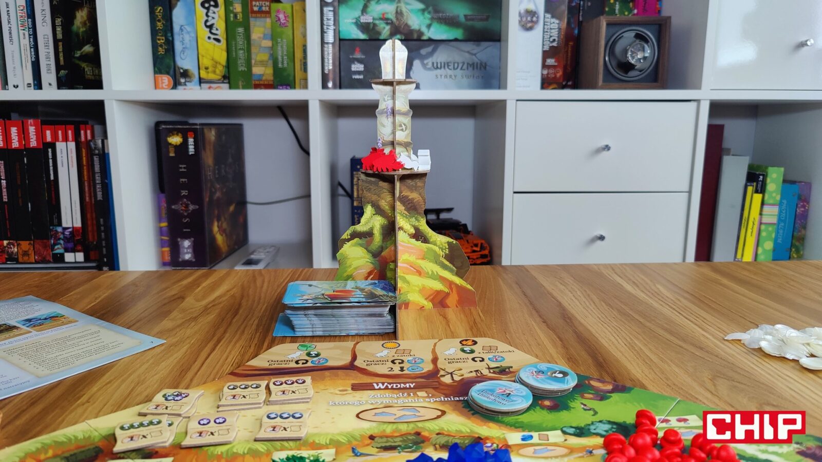 Z perspektywy praktycznej lepiej byłoby, gdyby producent zamienił tę planszę na pojemniki na surowce, prosty tor punktowy i kilka dodatkowych żetonów informujących o akcjach. Jestem jednak przekonany, że twórcy po prostu chcieli uczynić z Everdell: Dalekobrzeg pewnego rodzaju wizualną ucztę i przygodę, a nie pusty wyścig na punkty. Widać to nie tylko po tekturowej planszy i latarni, które ewidentnie będą budzić wyobraźnię młodszych graczy, ale też po statkach, bo te również można schować do pudełka i poruszać się wyłącznie pionkami, które wskazują konkretne pola znacznie precyzyjniej. Szczytem niskiej praktyczności jest jednak składana z czterech części tekturowa latarnia, na której podstawkach trudno umieścić sześć, a co dopiero dwanaście figurek robotników.