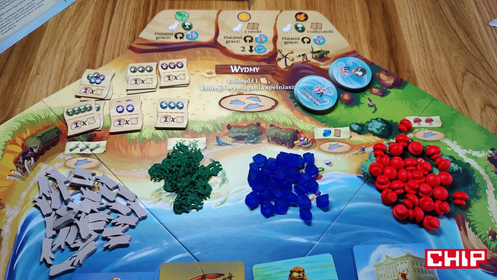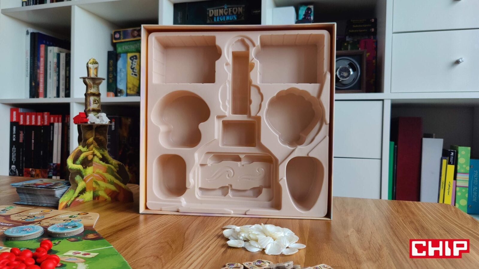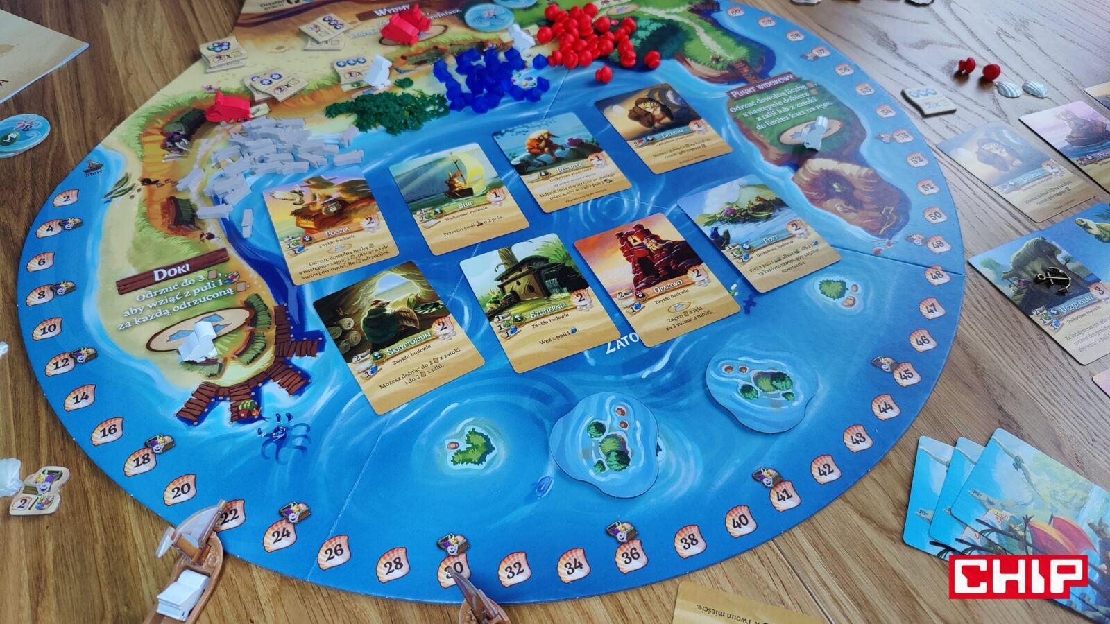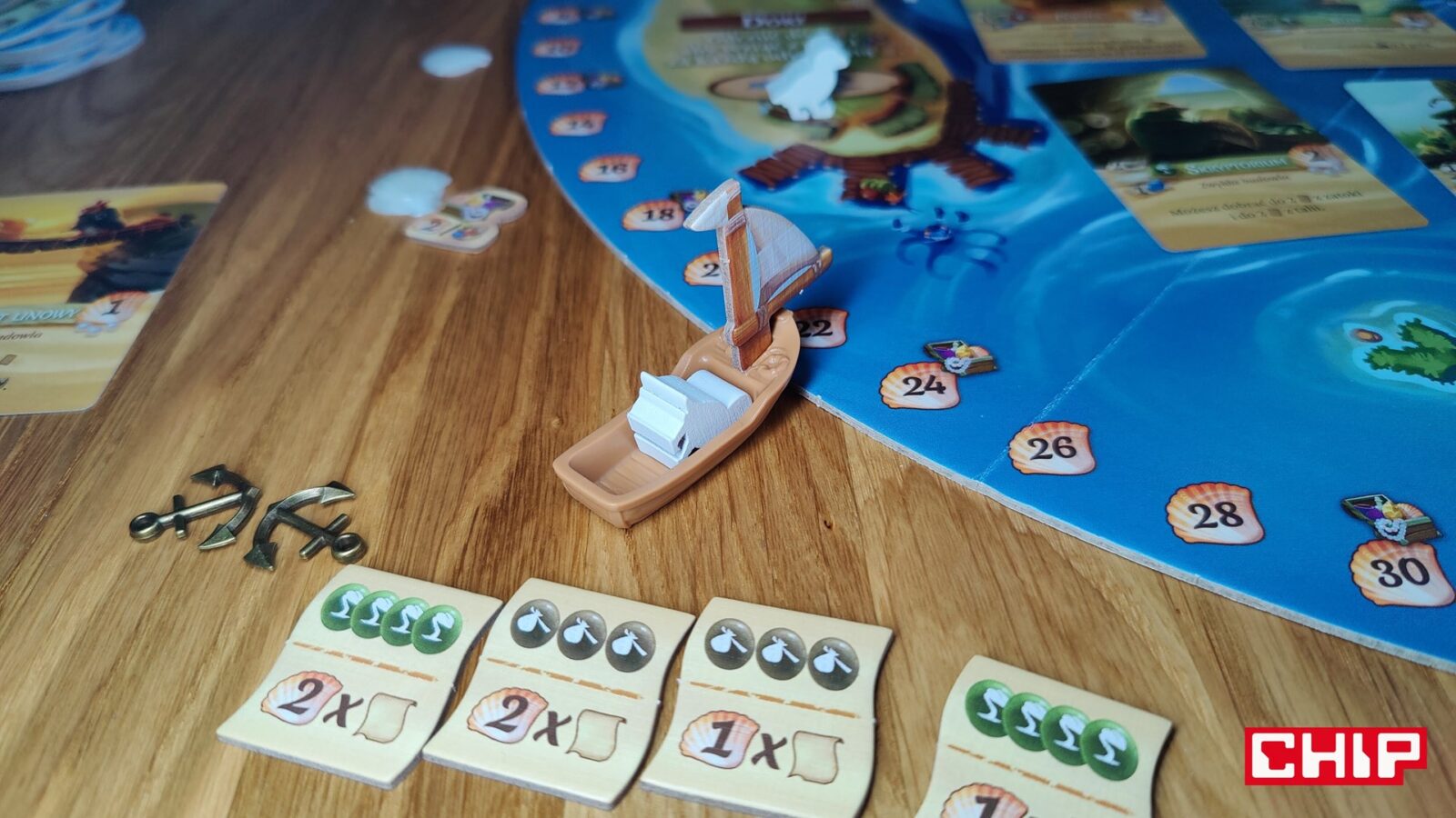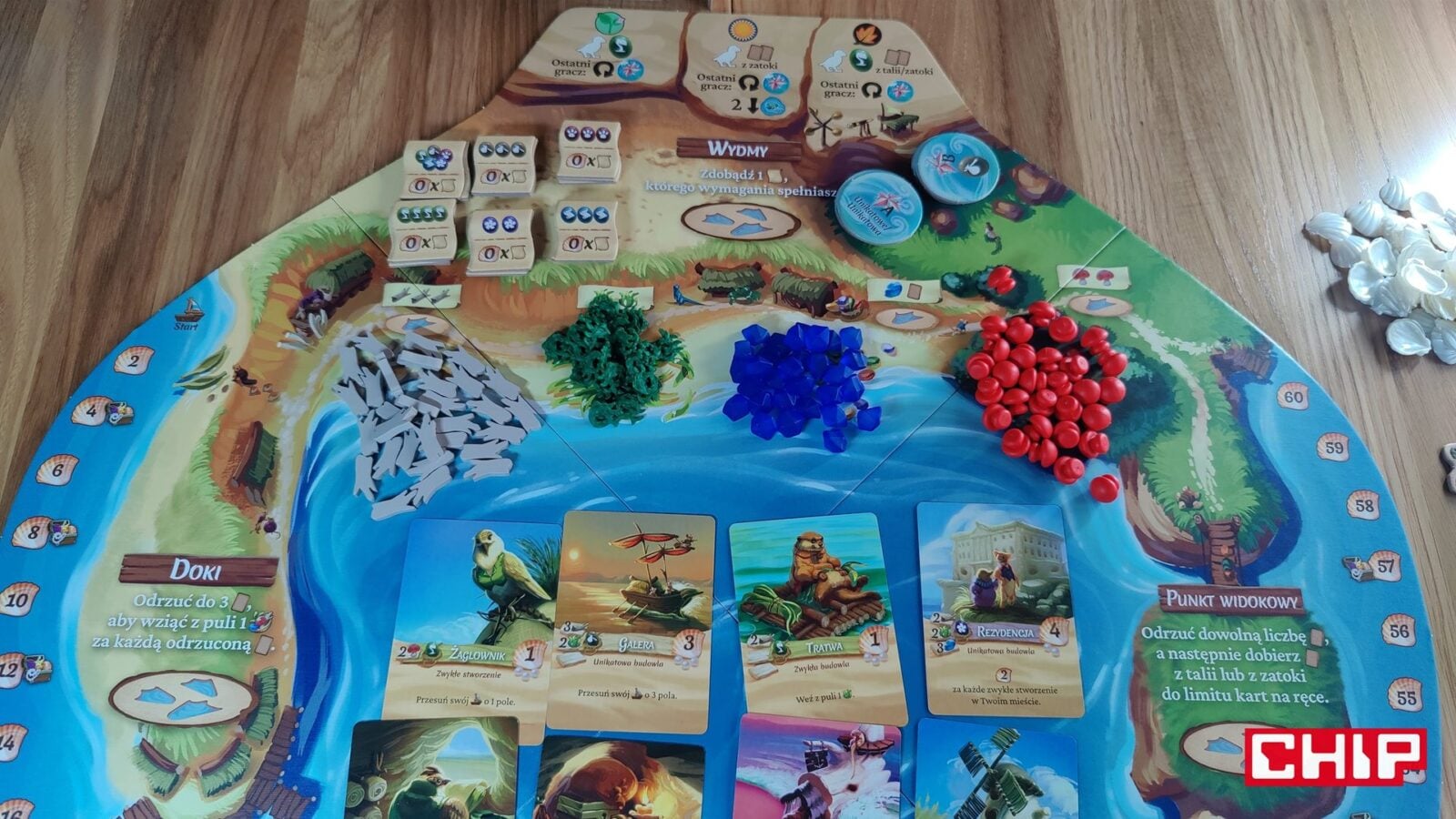 Z perspektywy praktycznej lepiej byłoby, gdyby producent zamienił tę planszę na pojemniki na surowce, prosty tor punktowy i kilka dodatkowych żetonów informujących o akcjach. Jestem jednak przekonany, że twórcy po prostu chcieli uczynić z Everdell: Dalekobrzeg pewnego rodzaju wizualną ucztę i przygodę, a nie pusty wyścig na punkty. Widać to nie tylko po tekturowej planszy i latarni, które ewidentnie będą budzić wyobraźnię młodszych graczy, ale też po statkach, bo te również można schować do pudełka i poruszać się wyłącznie pionkami, które wskazują konkretne pola znacznie precyzyjniej. Szczytem niskiej praktyczności jest jednak składana z czterech części tekturowa latarnia, na której podstawkach trudno umieścić sześć, a co dopiero dwanaście figurek robotników.