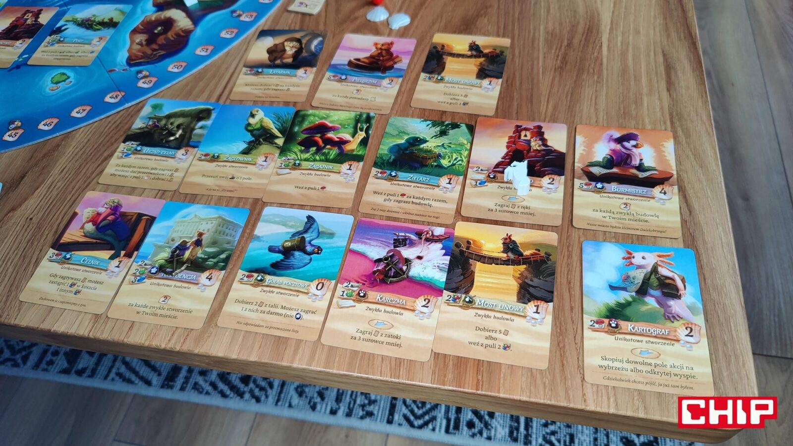 O wysoką regrywalność dbają nie tylko losowo dobierane karty na rękę i do zatoki, ale też ustawiane na początku róże wiatru oraz kafelki wysp, ale każda rozgrywka polega na tym samym – zdobyciu największej liczby punktów. Osiągamy to poprzez rozwijanie miasta, podkradanie najlepszych map z globalnej puli oraz zbieranie skarbów (te pełnią też funkcje surowcowego jokera) i muszelek. W ogólnym więc rozrachunku możemy wybrać kilka dróg do zwycięstwa i modyfikować swoją strategię zależnie od tego, co dzieje się w miastach innych graczy, jak i na planszy. Nie możemy zresztą wpatrywać się wyłącznie w nasze karty, bo w każdej porze roku (gra dzieli się na cztery etapy – zimę, wiosnę, lato i jesień) niektóre pola przyjmują wyłącznie jednego robotnika, co pozwala graczom na kontrowanie się nawzajem, choć akurat negatywnej interakcji nie ma w Everdell: Dalekobrzeg za dużo… a szkoda. Tor muszelek ze skarbami aż bowiem prosi się o dodatkowy rodzaj nagród, którego zgarniałby tylko pierwszy gracz, który dotrze na konkretne pole.