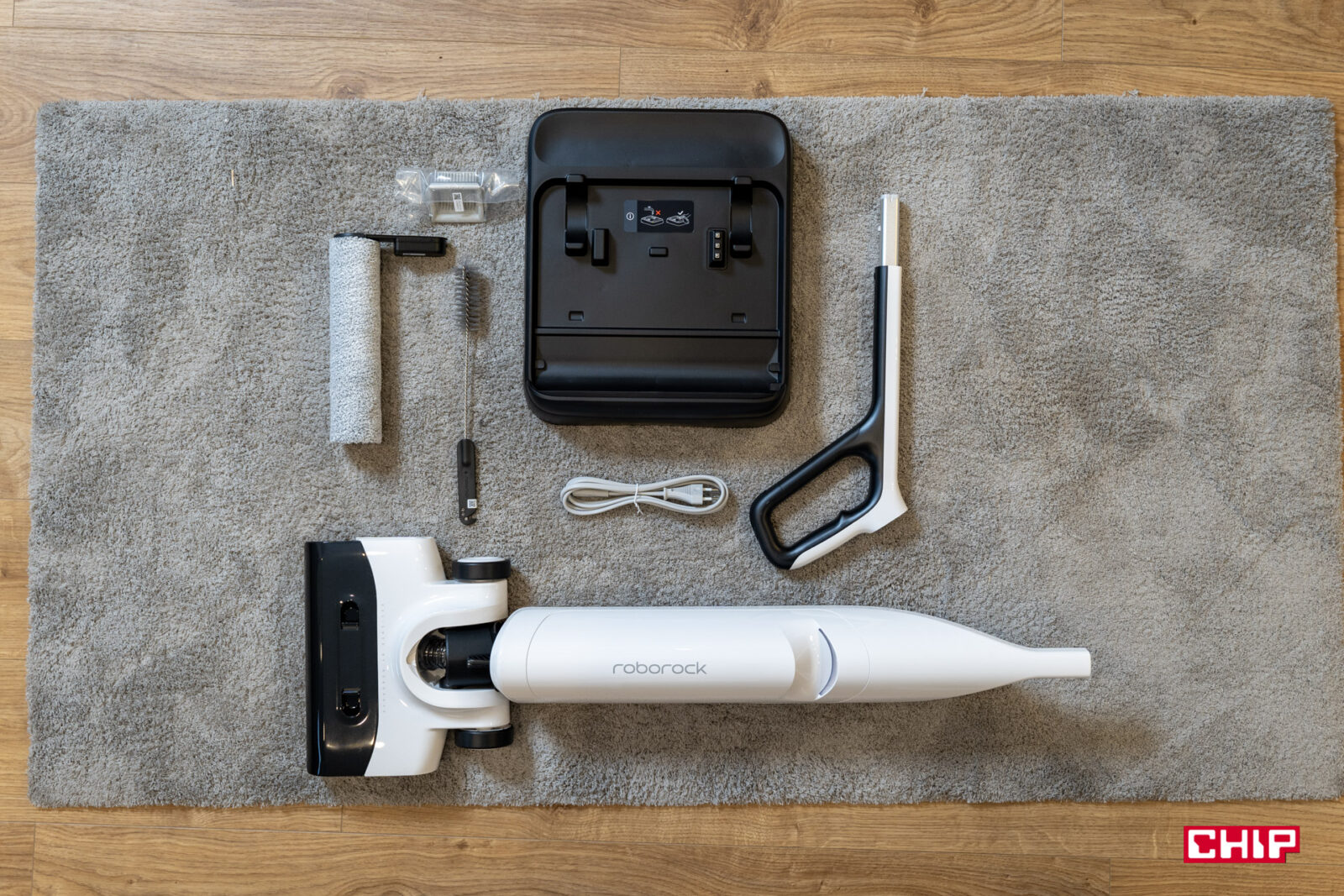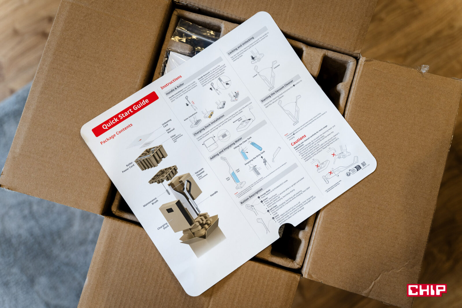 Zestaw jest bardzo prosty, bo składa się z dwóch części odkurzacza, rolki sprzątającej, wyciora do czyszczenia oraz zapasowego filtra HEPA. Wystarczy tylko złożyć wszystko w jedno i po dosłownie 15 sekundach sprzęt jest prawie gotowy do pracy. Prawie, bo zostaje nam jeszcze dolanie wody do pojemnika oraz opcjonalnie dodanie do niej detergentu.
