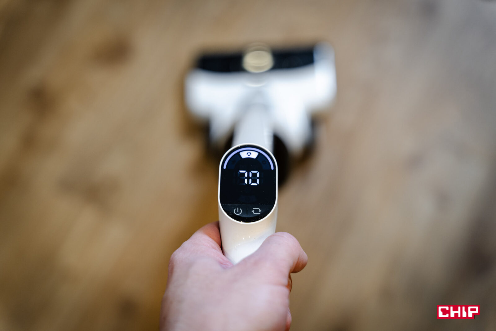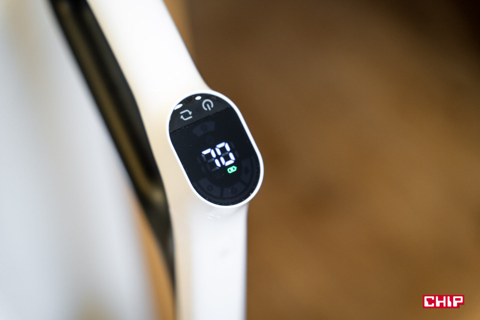 Na górze widzimy nieduży, bardzo czytelny ekran i to kolejny element, który pokazuje jak bardzo dopracowanym sprzętem jest Roborock Flexi Lite. W trakcie ładowania treści są wyświetlane tak, abyśmy widzieli stan naładowania stojąc na wprost, ale już w trakcie sprzątania orientacja zmienia się o 180 stopni, dzięki czemu jest cały czas zwrócony w naszym kierunku.