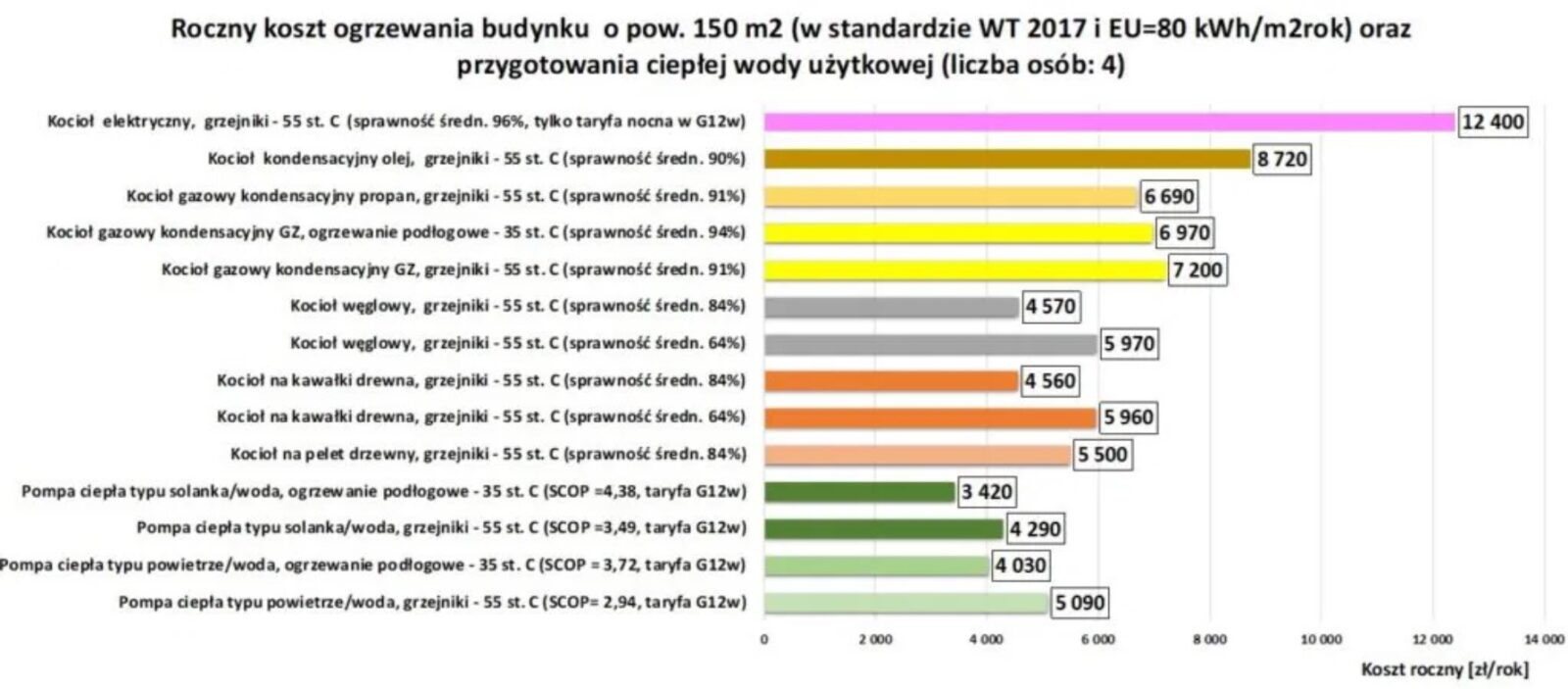 Jeśli z kolei idzie o konkrety, według danych PORT PC z czwartego kwartału 2024 roku, koszty ogrzewania domów o powierzchni 150 m², generujących zapotrzebowanie na energię użytkową 80 kWh/m² rocznie, kształtują się następująco: