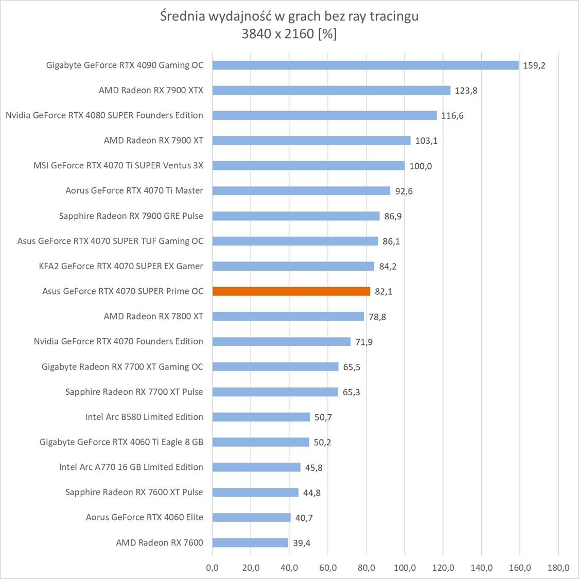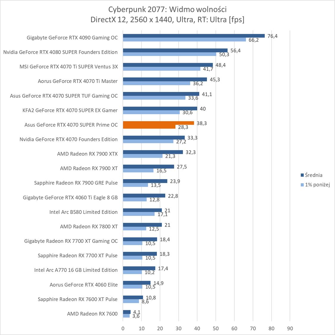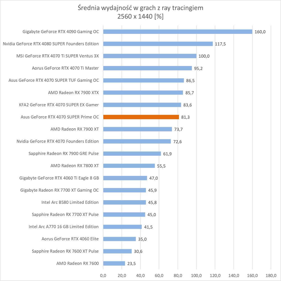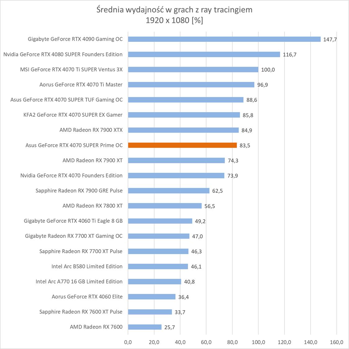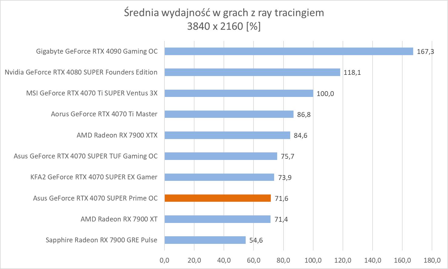 W przypadku gier z ray tracingiem jest bardzo dobrze i tutaj przewaga nad 7900 GRE jest widoczna i spora. Model Prime przegrywa z innymi wersjami RTX 4070 SUPER, ale ponownie nie jest źle. W przypadku porównania do 7900 XT jest we wszystkich rozdzielczościach wydajniej – odwrotnie niż w przypadku rasteryzacji. Choć trzeba przyznać, że w 3840 x 2160 grafiki praktycznie są takie same.
