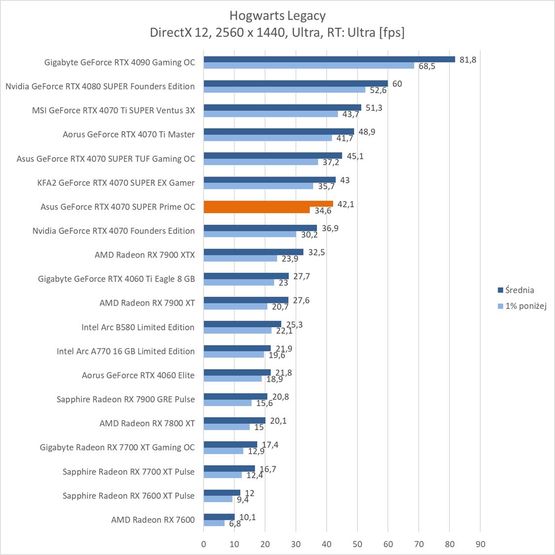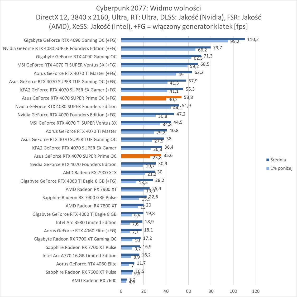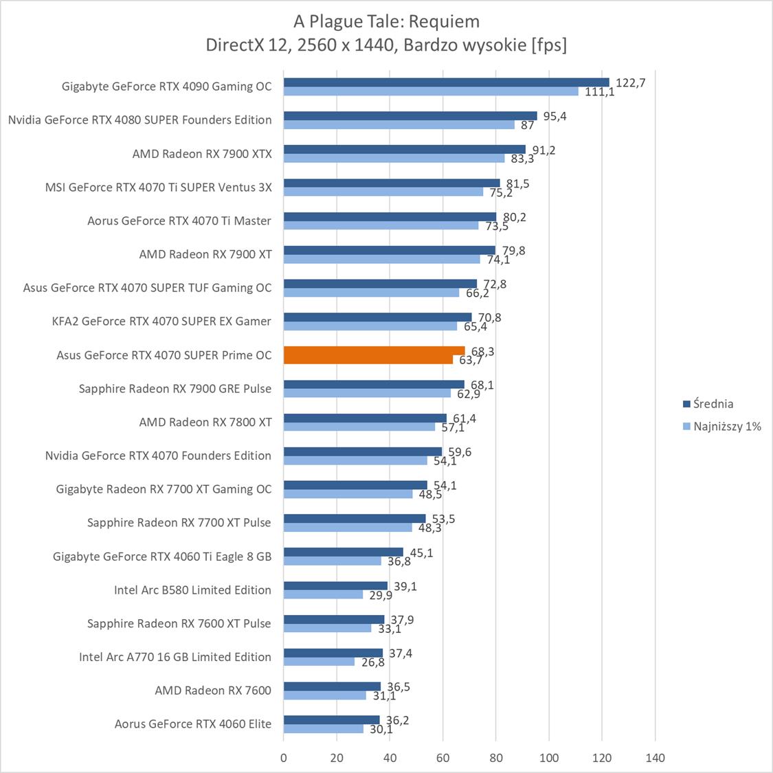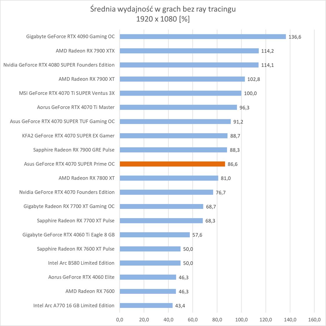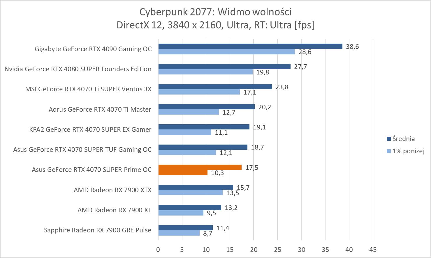 W przypadku gier z ray tracingiem jest bardzo dobrze i tutaj przewaga nad 7900 GRE jest widoczna i spora. Model Prime przegrywa z innymi wersjami RTX 4070 SUPER, ale ponownie nie jest źle. W przypadku porównania do 7900 XT jest we wszystkich rozdzielczościach wydajniej – odwrotnie niż w przypadku rasteryzacji. Choć trzeba przyznać, że w 3840 x 2160 grafiki praktycznie są takie same.