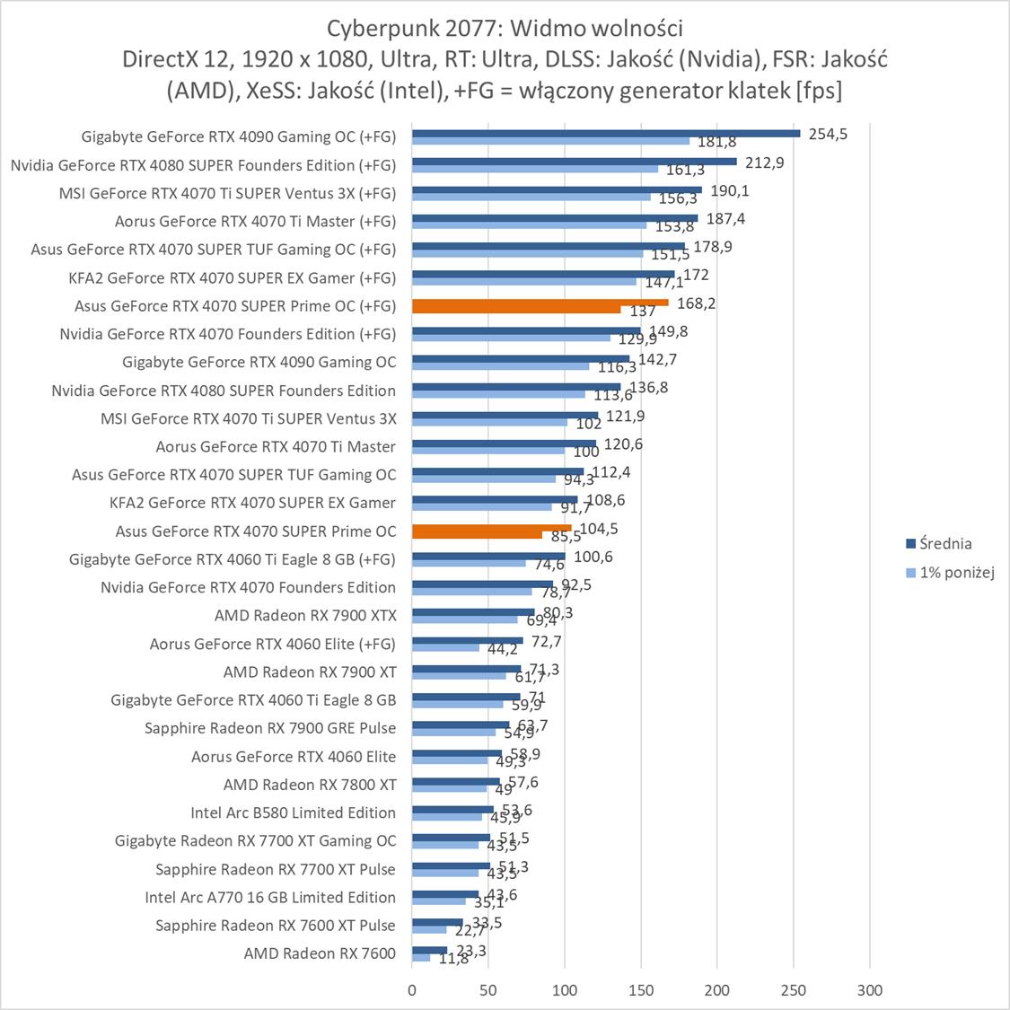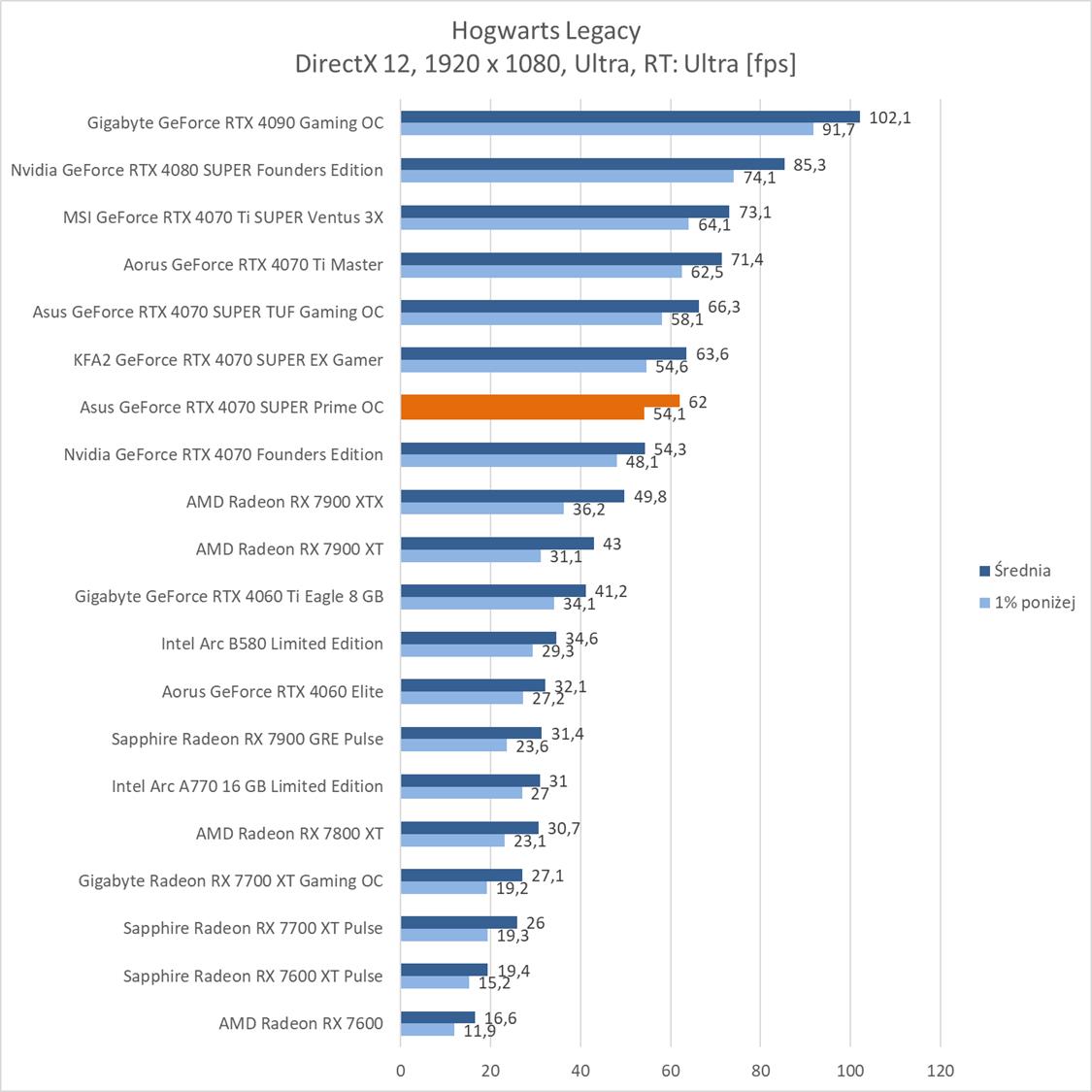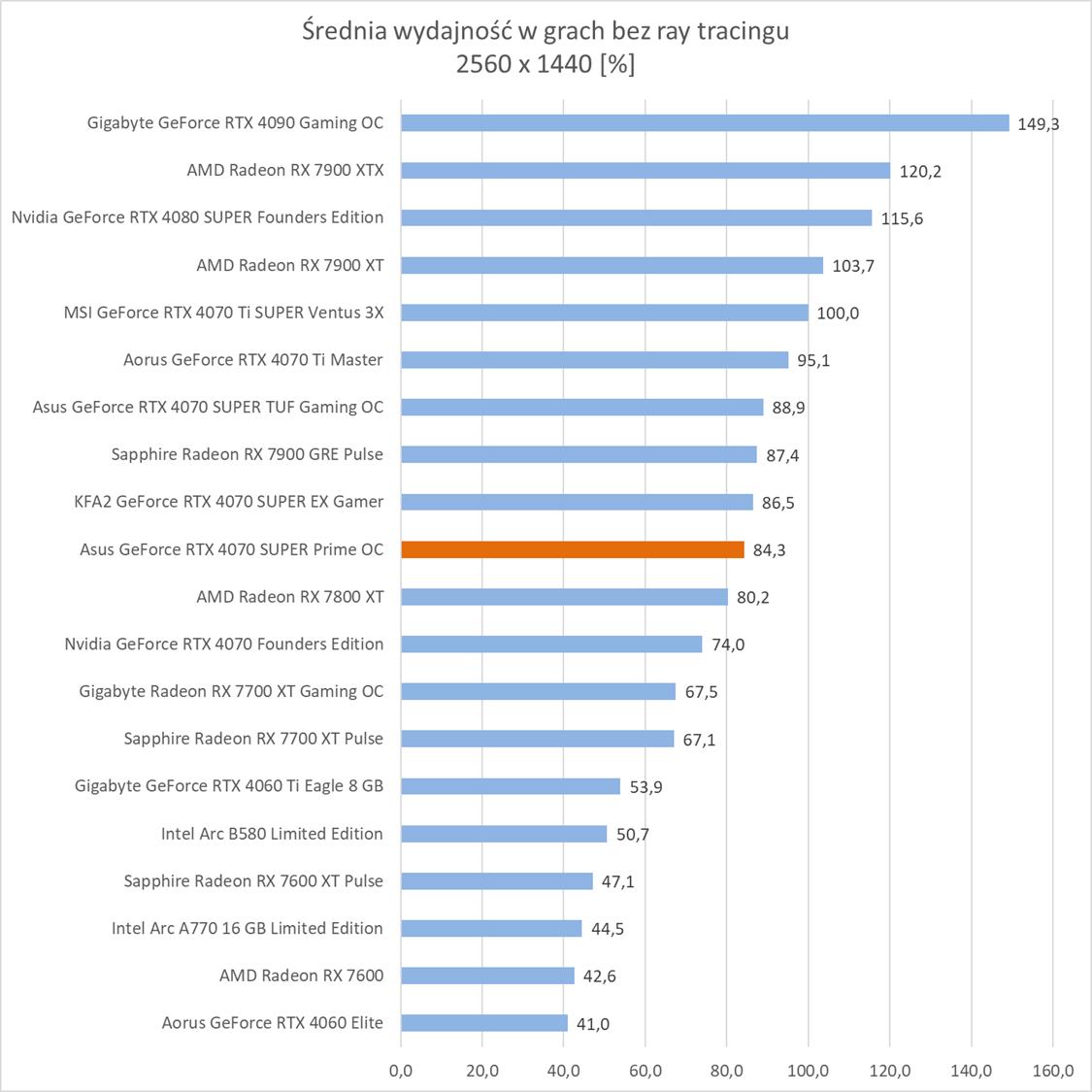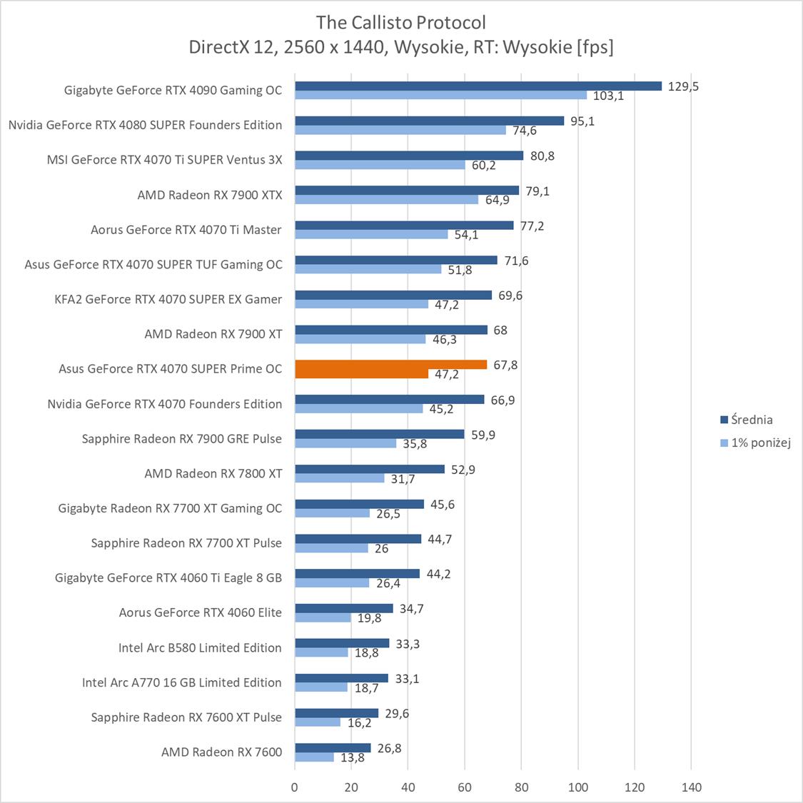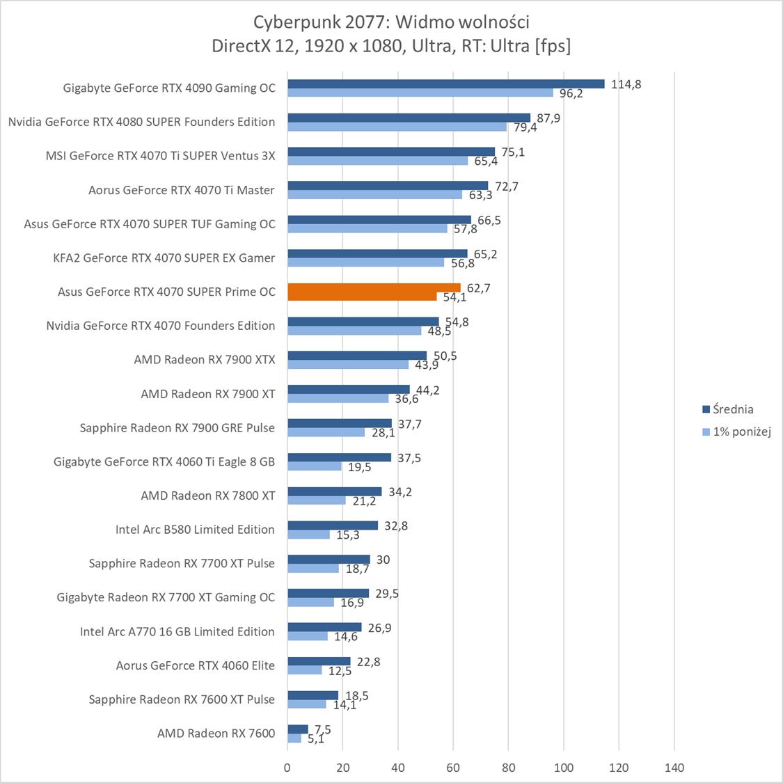 W przypadku gier z ray tracingiem jest bardzo dobrze i tutaj przewaga nad 7900 GRE jest widoczna i spora. Model Prime przegrywa z innymi wersjami RTX 4070 SUPER, ale ponownie nie jest źle. W przypadku porównania do 7900 XT jest we wszystkich rozdzielczościach wydajniej – odwrotnie niż w przypadku rasteryzacji. Choć trzeba przyznać, że w 3840 x 2160 grafiki praktycznie są takie same.