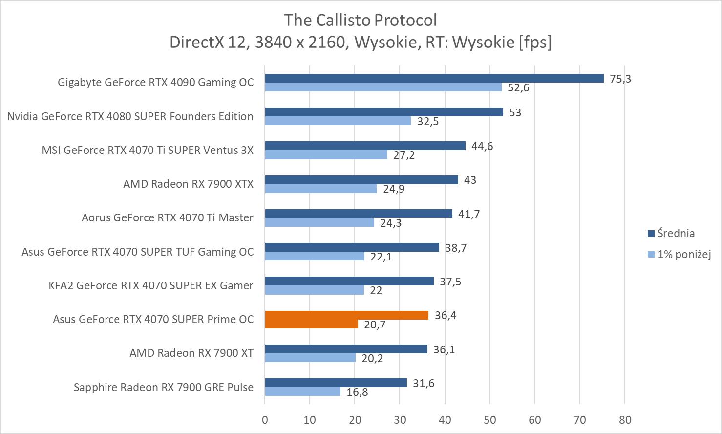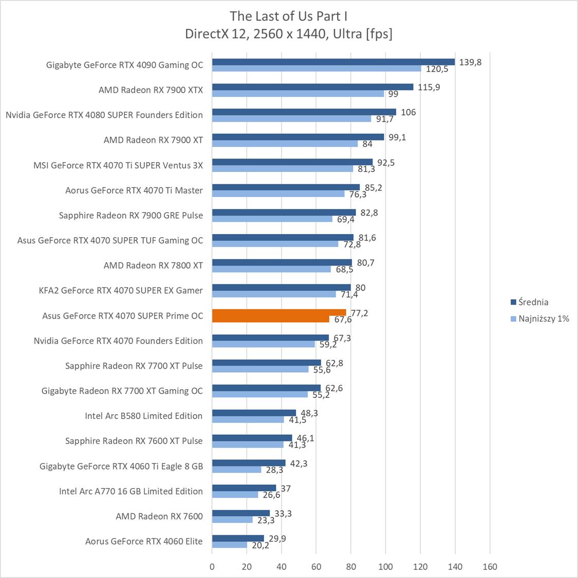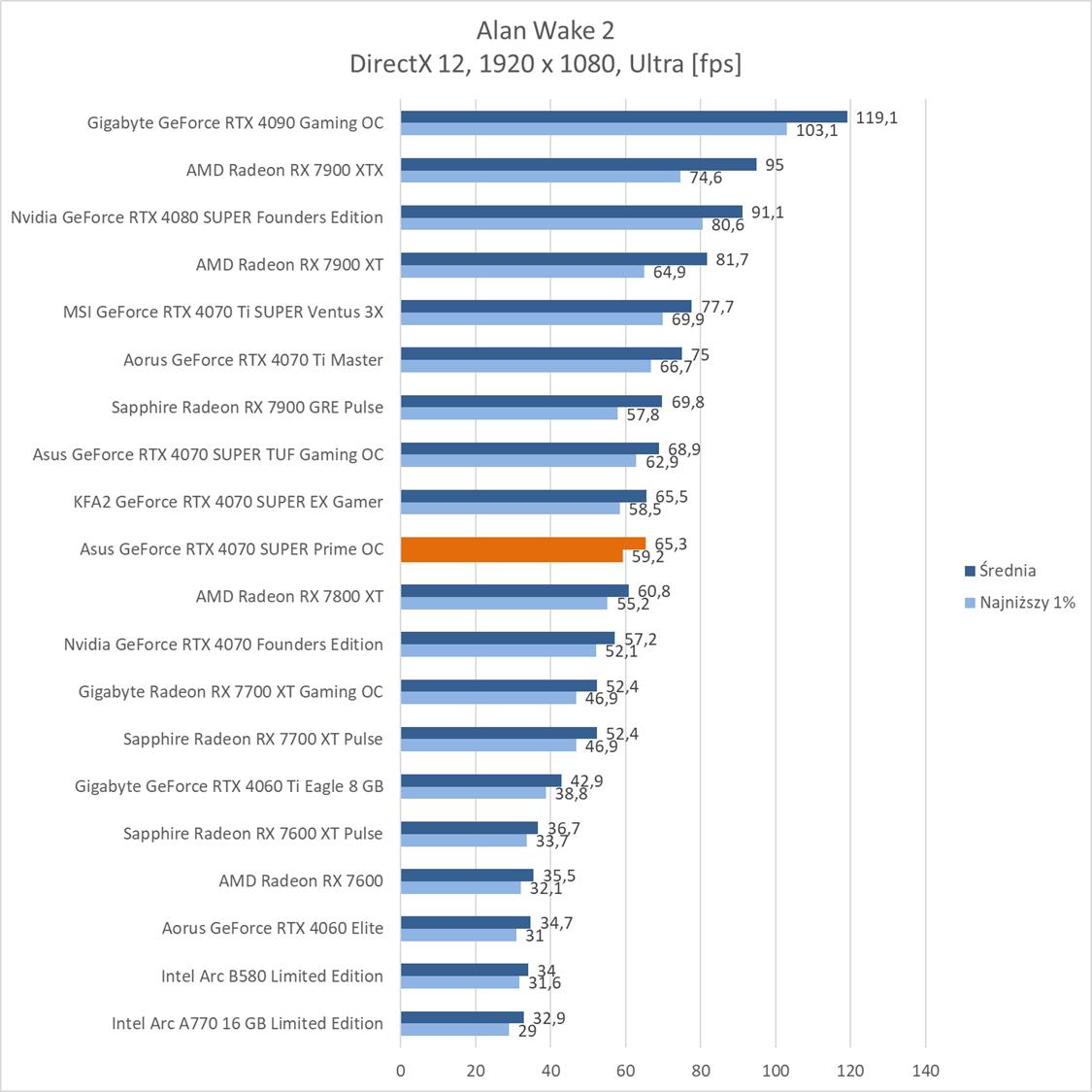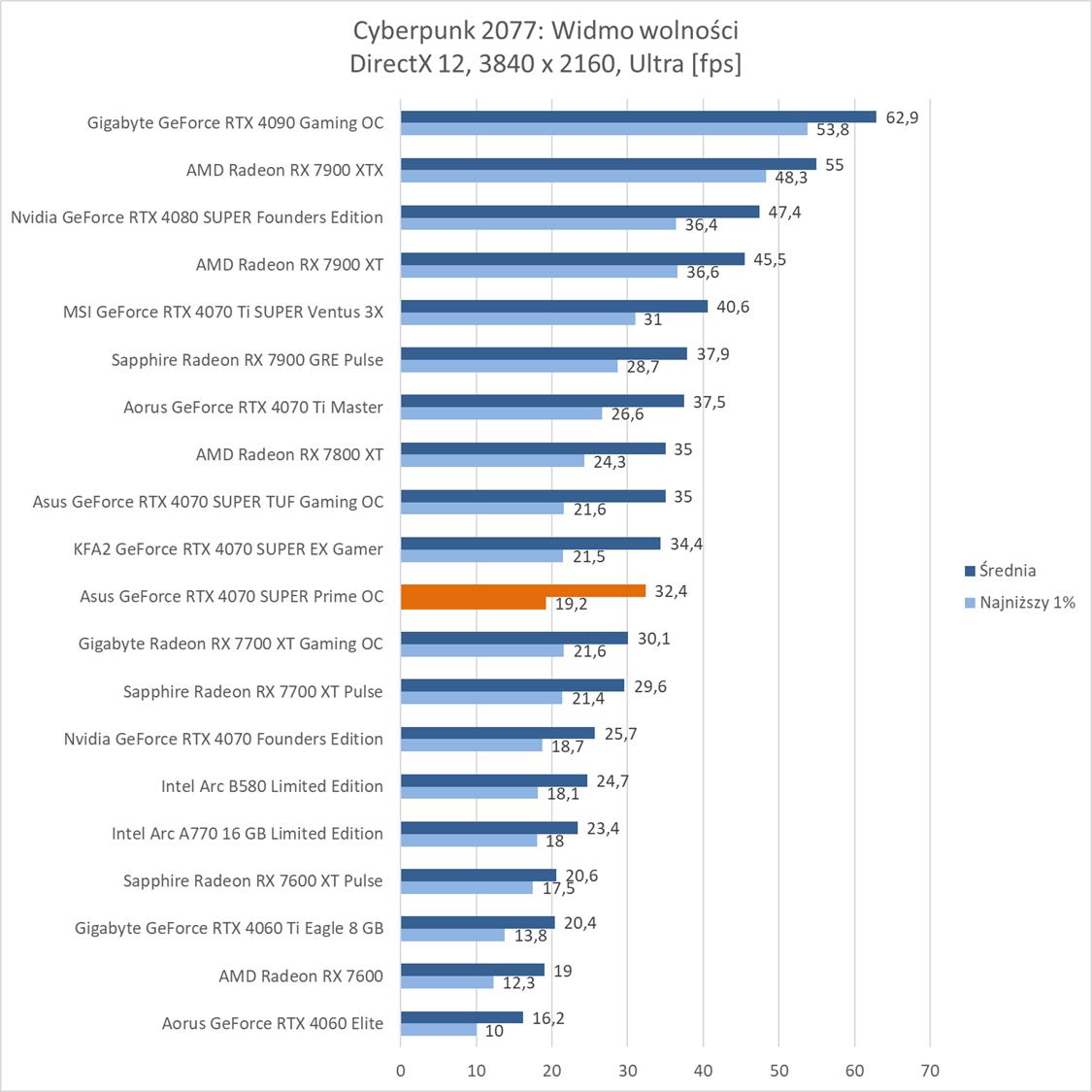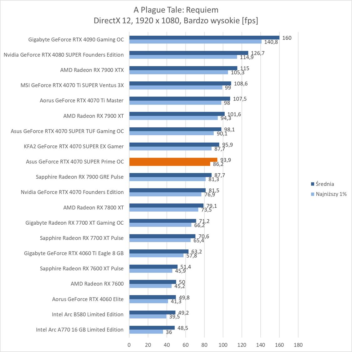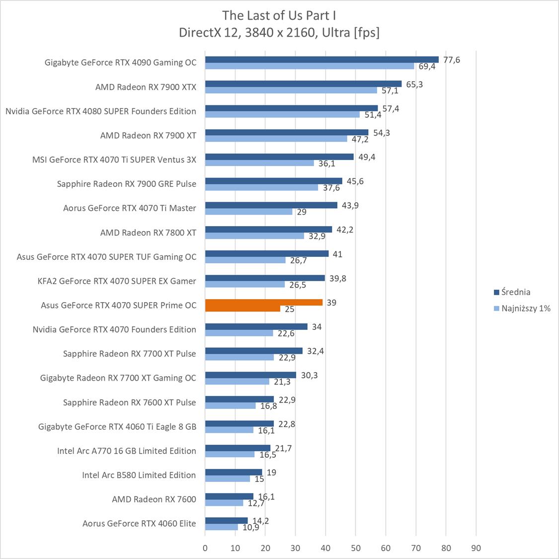 W przypadku gier z ray tracingiem jest bardzo dobrze i tutaj przewaga nad 7900 GRE jest widoczna i spora. Model Prime przegrywa z innymi wersjami RTX 4070 SUPER, ale ponownie nie jest źle. W przypadku porównania do 7900 XT jest we wszystkich rozdzielczościach wydajniej – odwrotnie niż w przypadku rasteryzacji. Choć trzeba przyznać, że w 3840 x 2160 grafiki praktycznie są takie same.