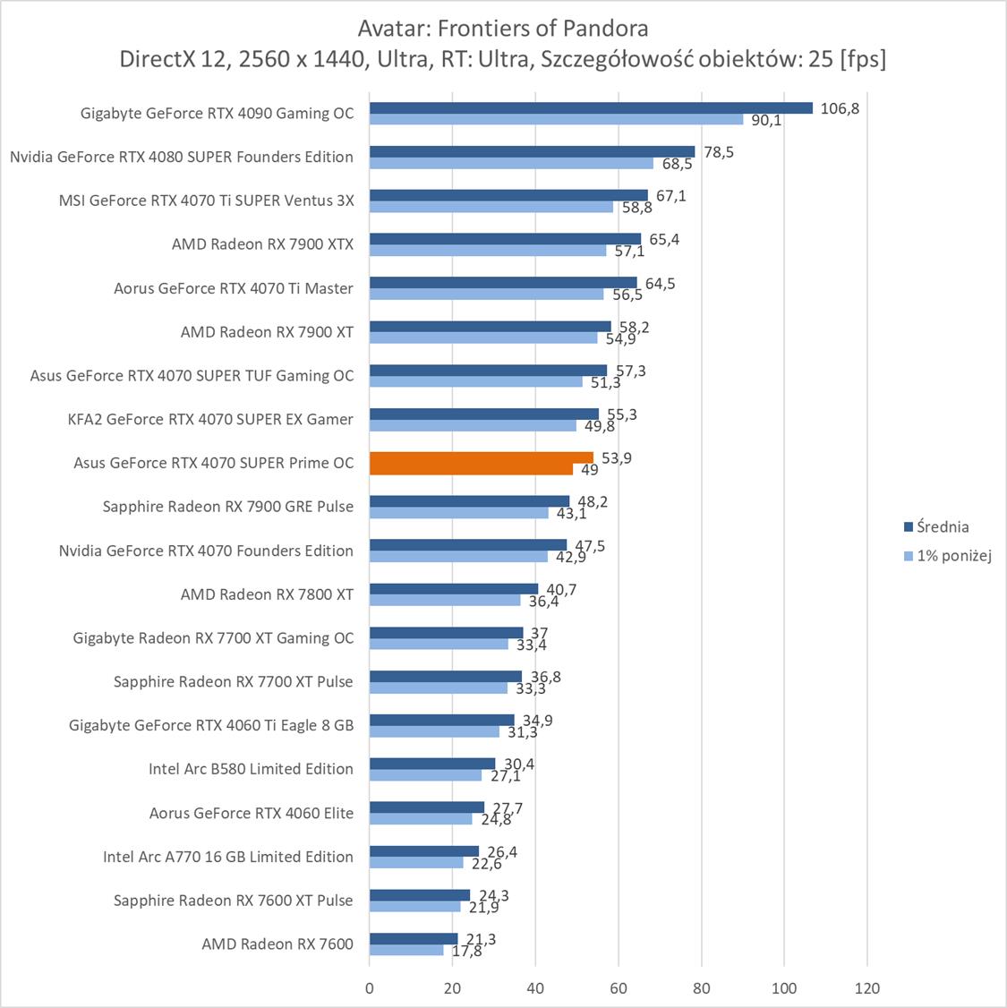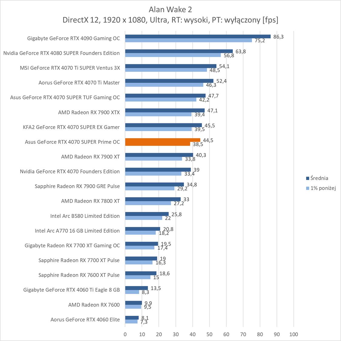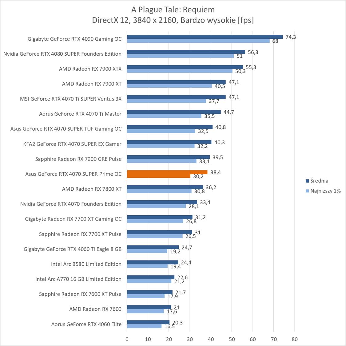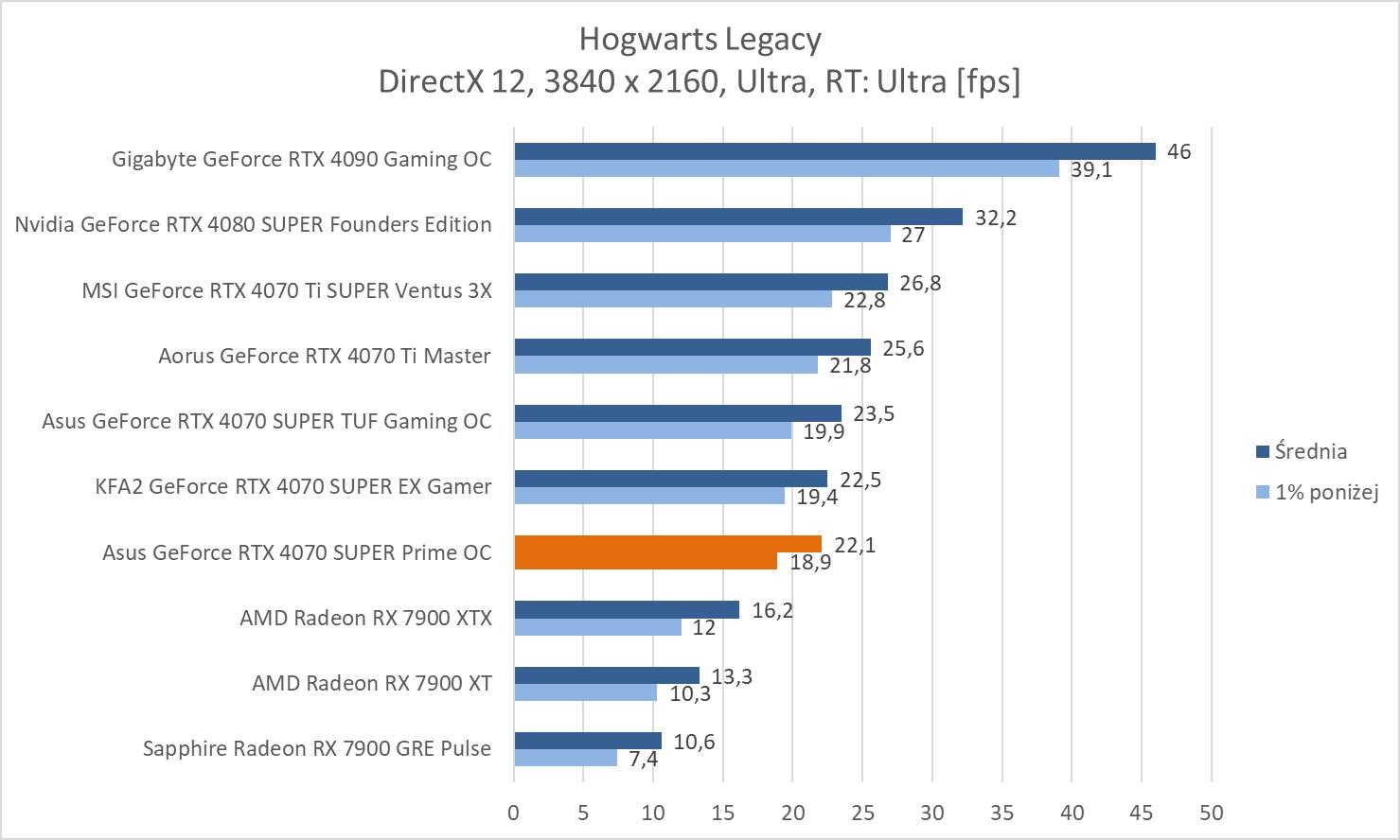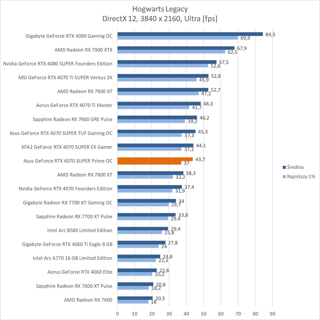 W przypadku gier z ray tracingiem jest bardzo dobrze i tutaj przewaga nad 7900 GRE jest widoczna i spora. Model Prime przegrywa z innymi wersjami RTX 4070 SUPER, ale ponownie nie jest źle. W przypadku porównania do 7900 XT jest we wszystkich rozdzielczościach wydajniej – odwrotnie niż w przypadku rasteryzacji. Choć trzeba przyznać, że w 3840 x 2160 grafiki praktycznie są takie same.