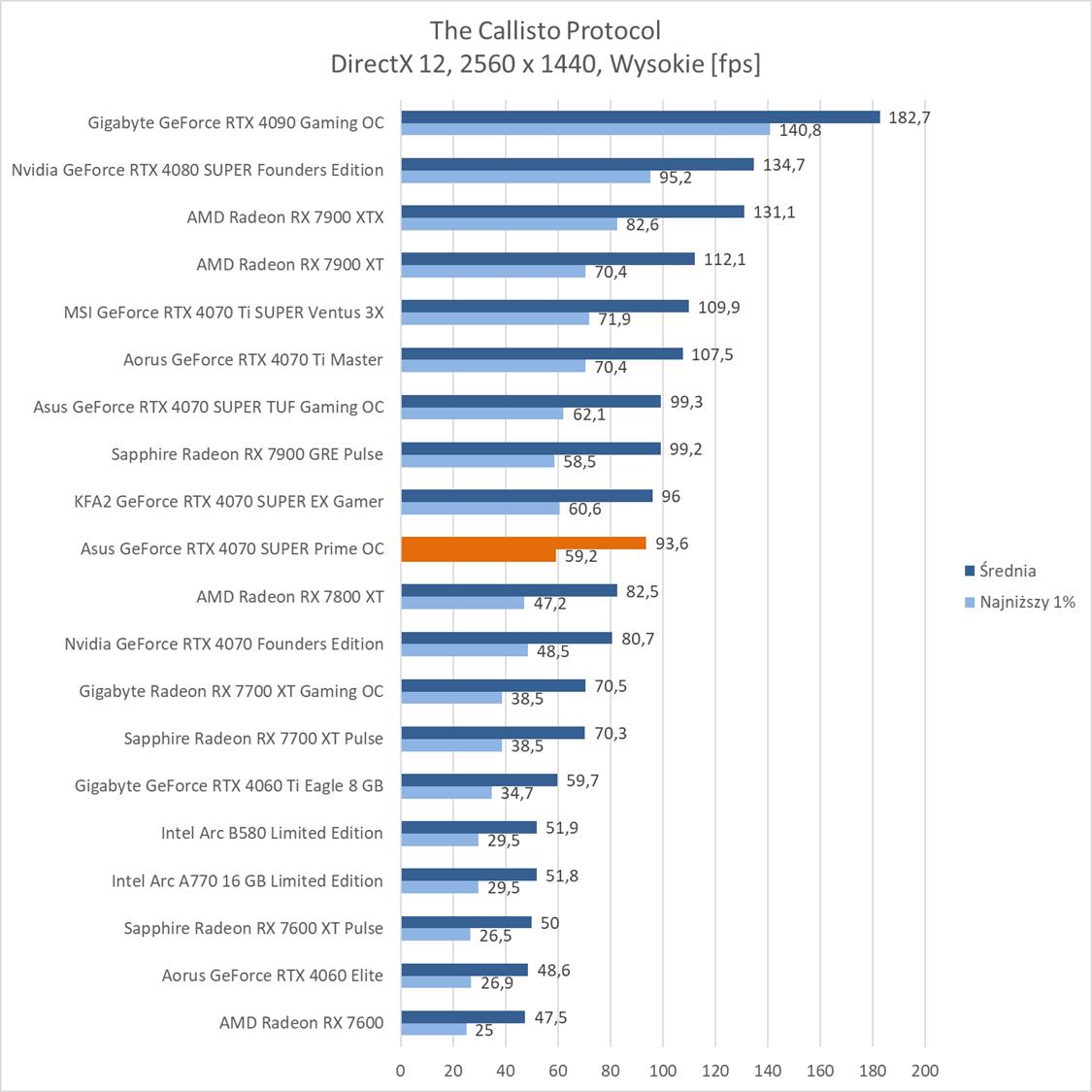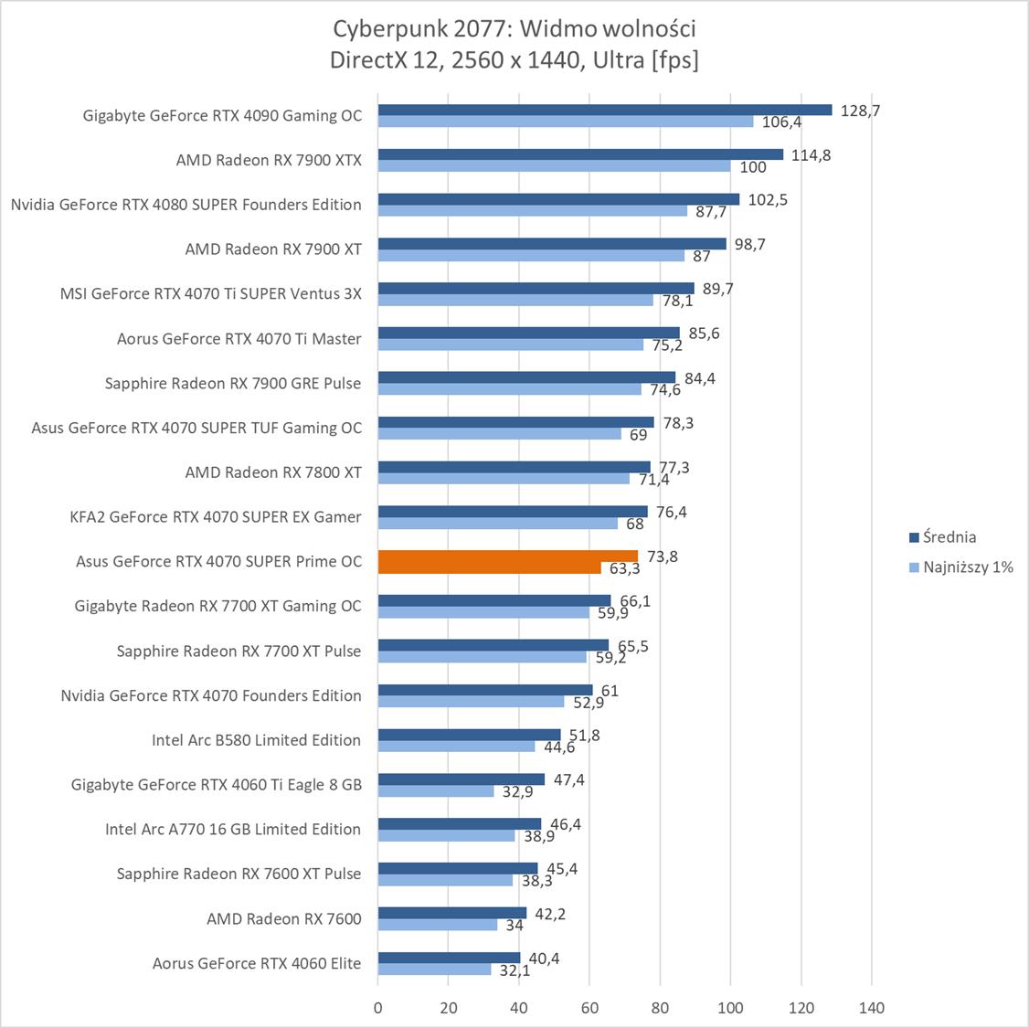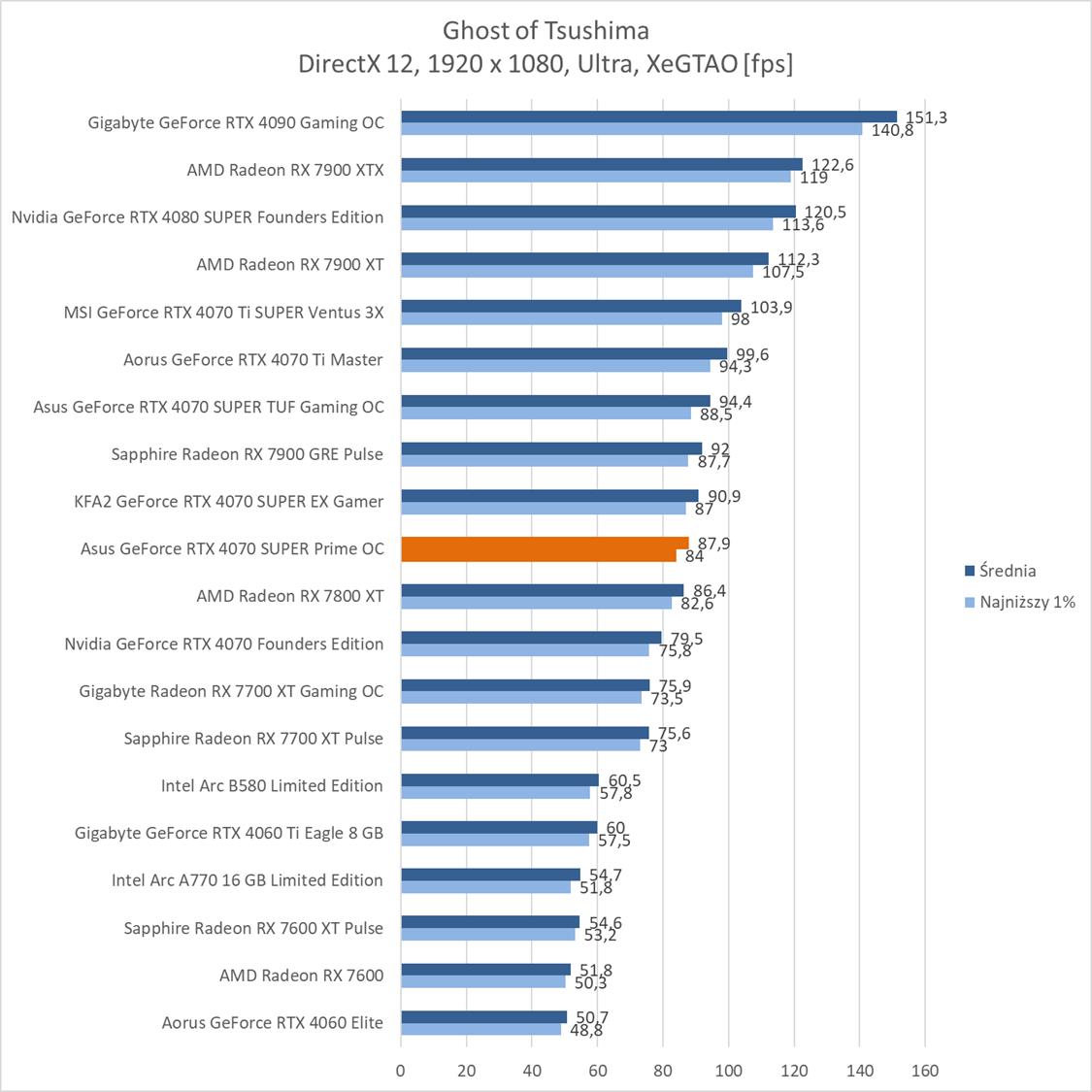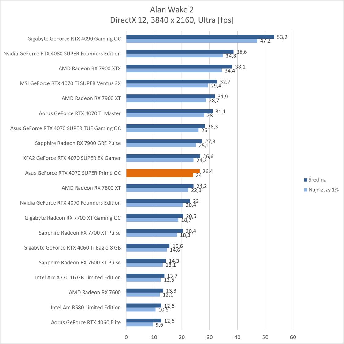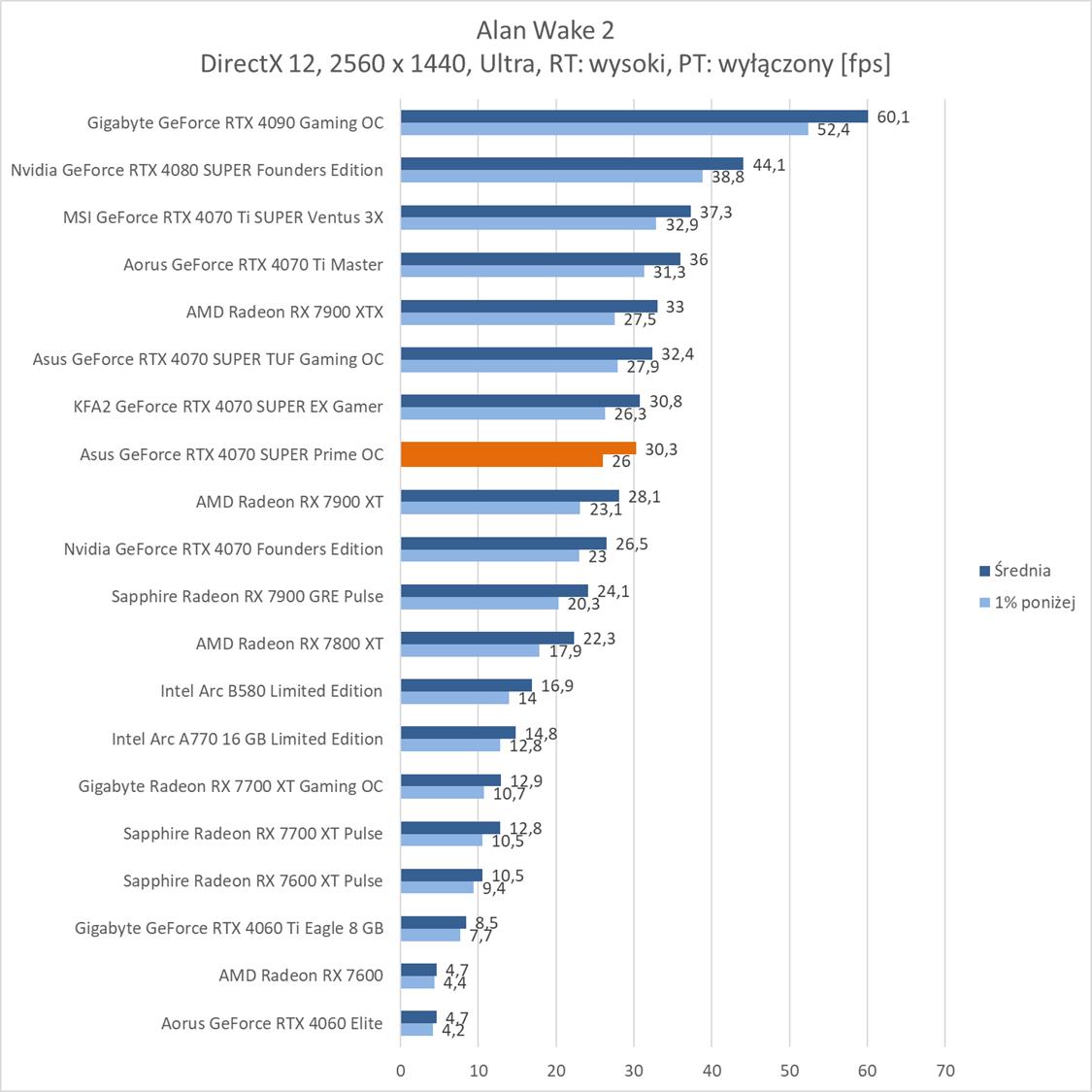 W przypadku gier z ray tracingiem jest bardzo dobrze i tutaj przewaga nad 7900 GRE jest widoczna i spora. Model Prime przegrywa z innymi wersjami RTX 4070 SUPER, ale ponownie nie jest źle. W przypadku porównania do 7900 XT jest we wszystkich rozdzielczościach wydajniej – odwrotnie niż w przypadku rasteryzacji. Choć trzeba przyznać, że w 3840 x 2160 grafiki praktycznie są takie same.
