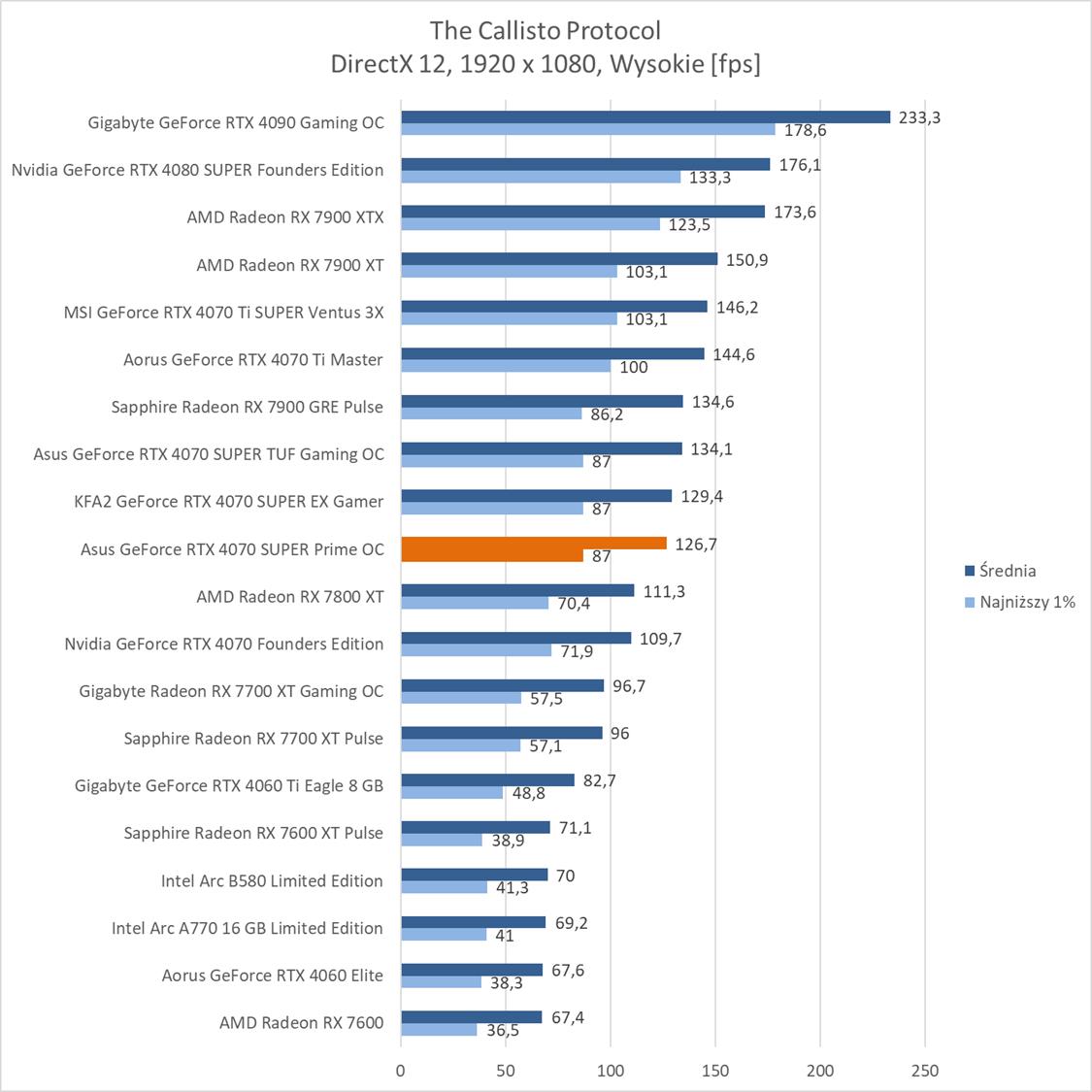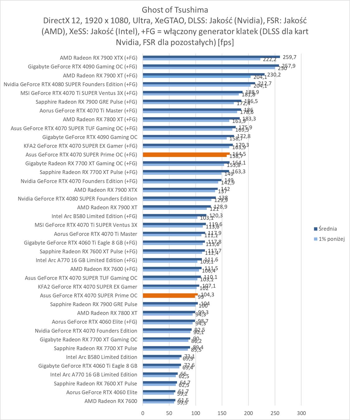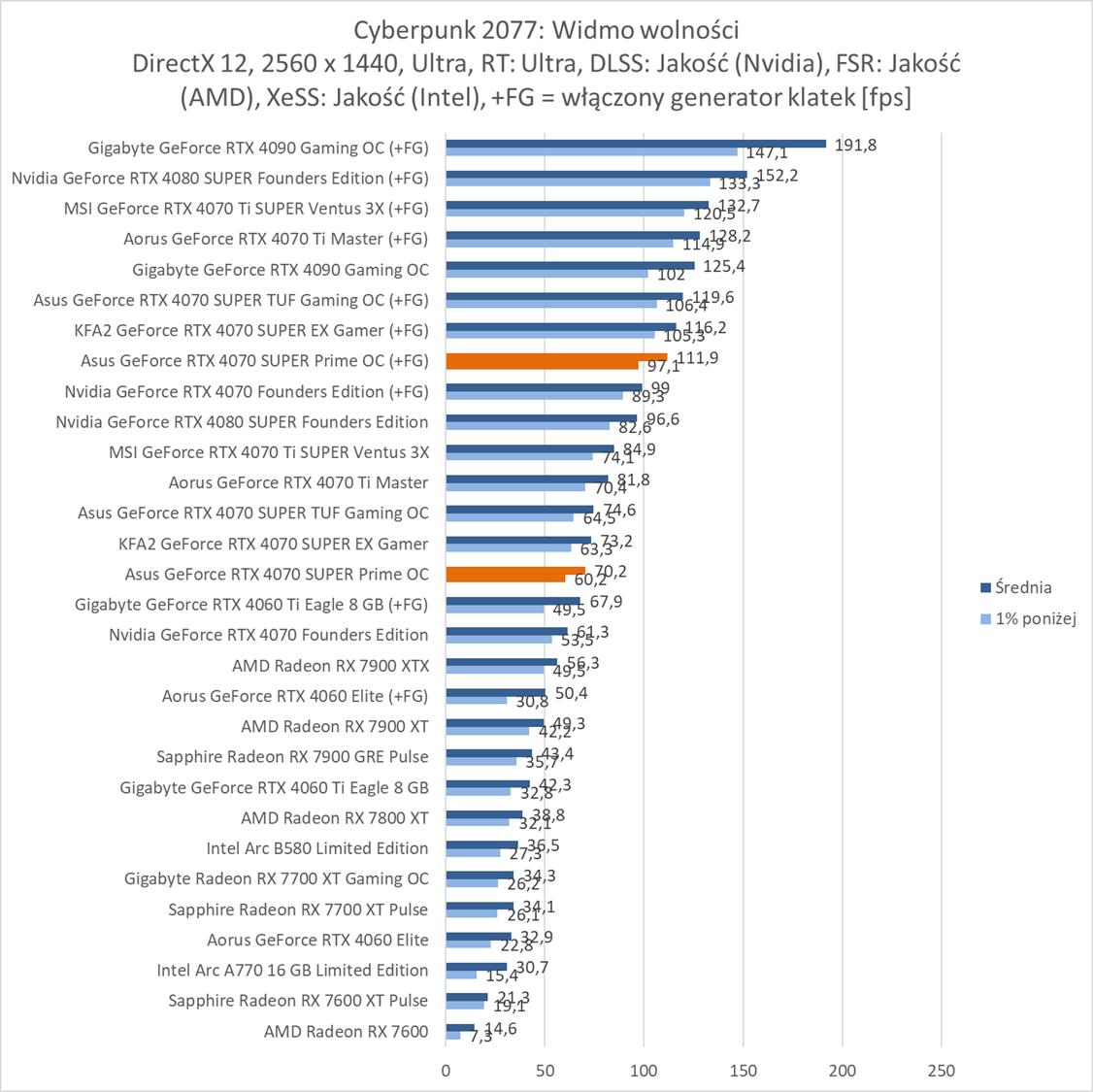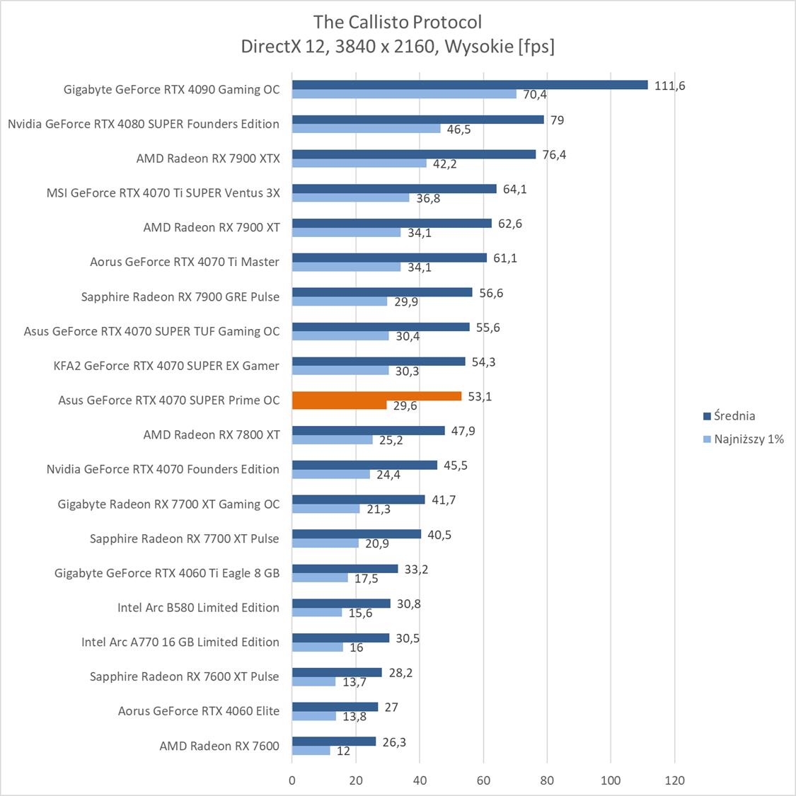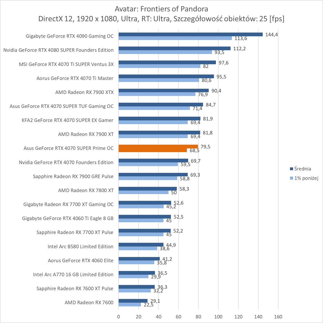 W przypadku gier z ray tracingiem jest bardzo dobrze i tutaj przewaga nad 7900 GRE jest widoczna i spora. Model Prime przegrywa z innymi wersjami RTX 4070 SUPER, ale ponownie nie jest źle. W przypadku porównania do 7900 XT jest we wszystkich rozdzielczościach wydajniej – odwrotnie niż w przypadku rasteryzacji. Choć trzeba przyznać, że w 3840 x 2160 grafiki praktycznie są takie same.