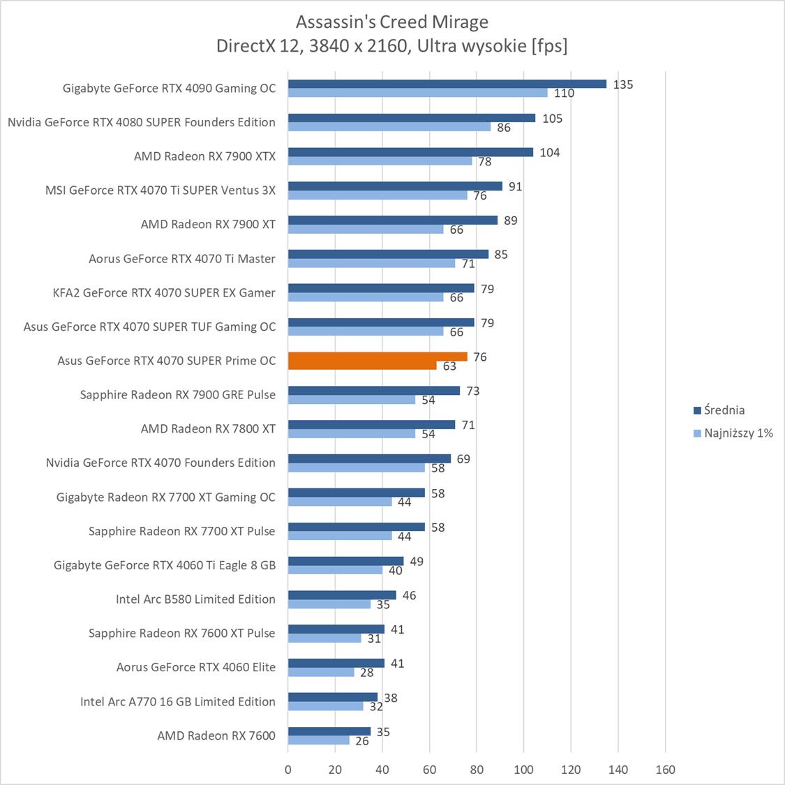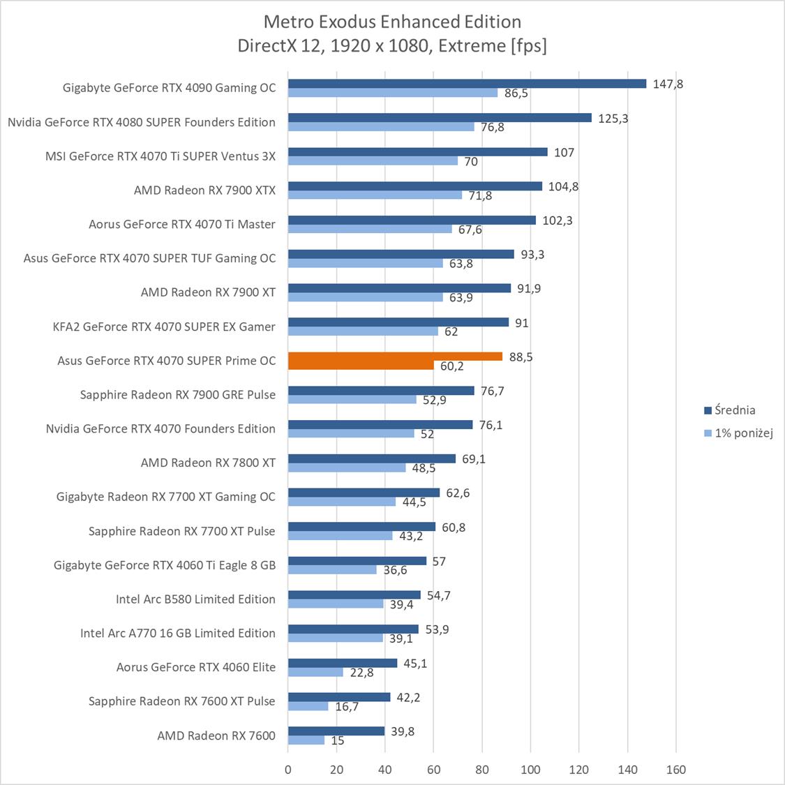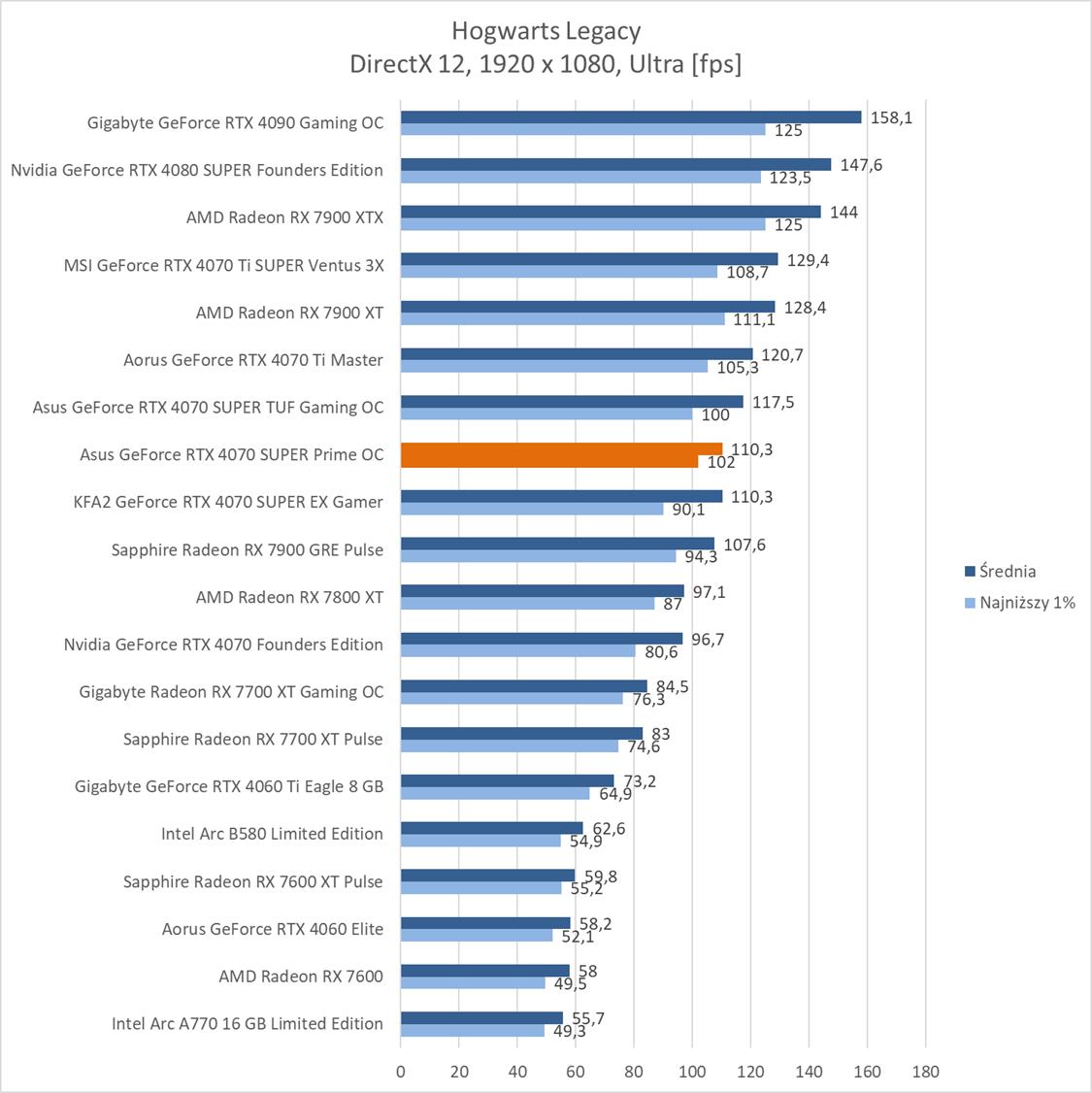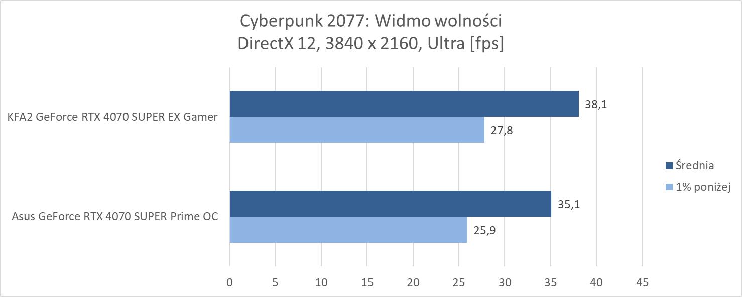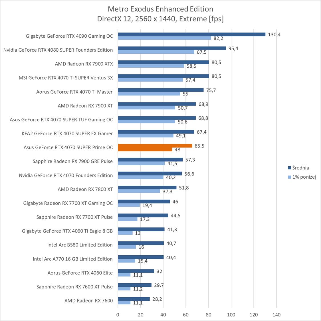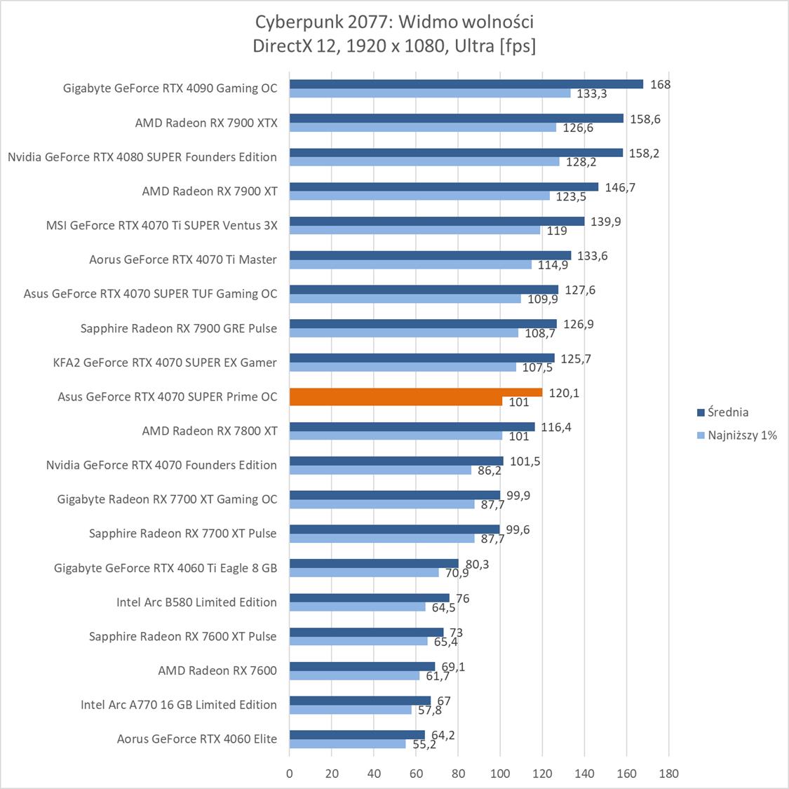W przypadku gier z ray tracingiem jest bardzo dobrze i tutaj przewaga nad 7900 GRE jest widoczna i spora. Model Prime przegrywa z innymi wersjami RTX 4070 SUPER, ale ponownie nie jest źle. W przypadku porównania do 7900 XT jest we wszystkich rozdzielczościach wydajniej – odwrotnie niż w przypadku rasteryzacji. Choć trzeba przyznać, że w 3840 x 2160 grafiki praktycznie są takie same.