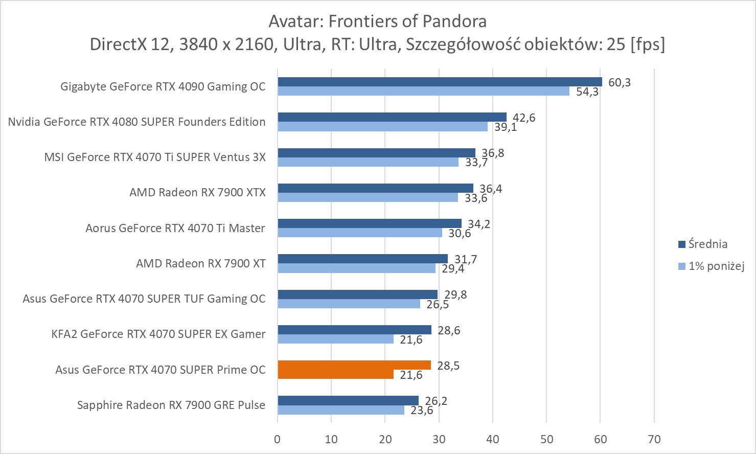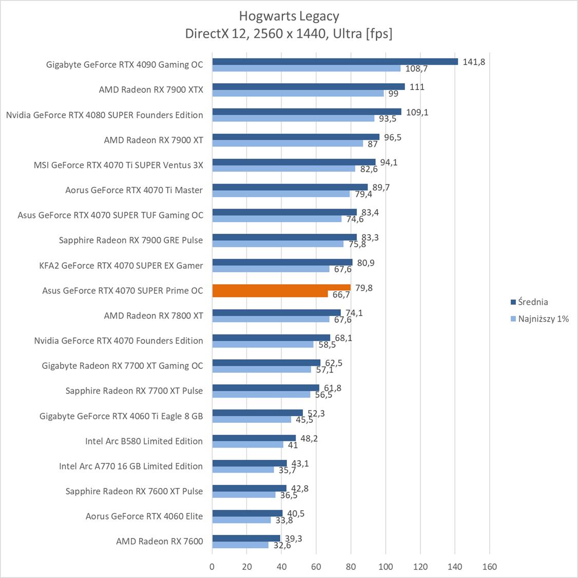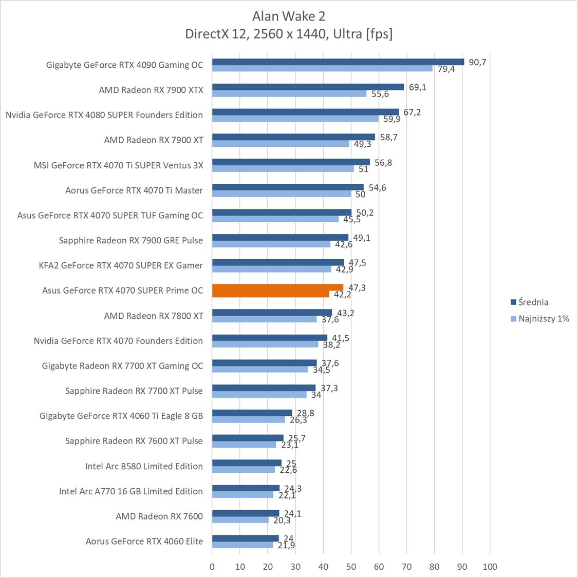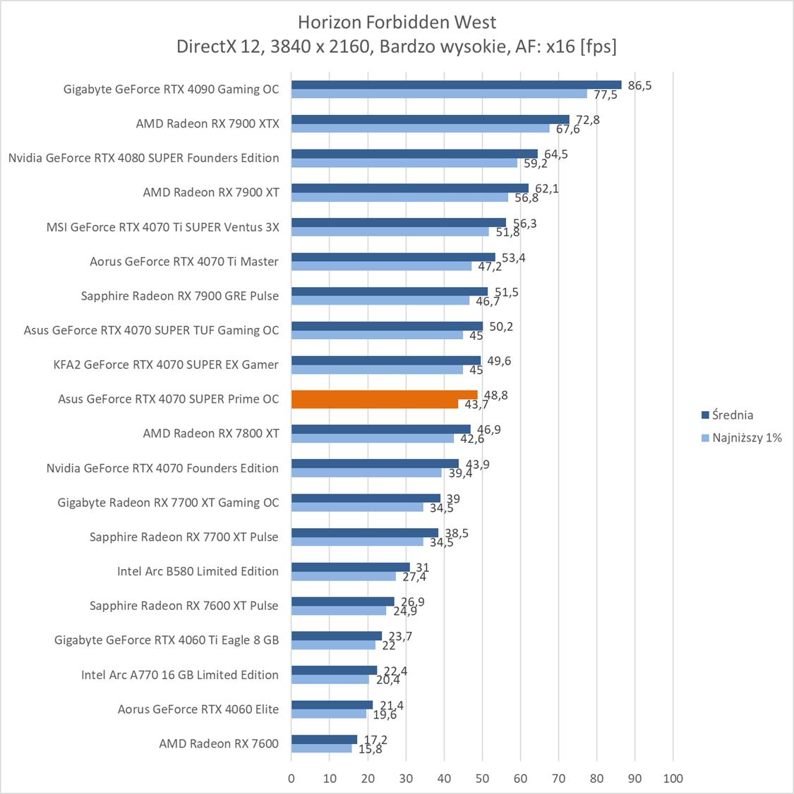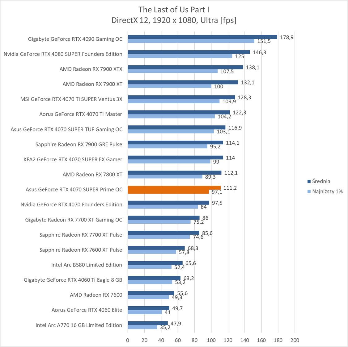 W przypadku gier z ray tracingiem jest bardzo dobrze i tutaj przewaga nad 7900 GRE jest widoczna i spora. Model Prime przegrywa z innymi wersjami RTX 4070 SUPER, ale ponownie nie jest źle. W przypadku porównania do 7900 XT jest we wszystkich rozdzielczościach wydajniej – odwrotnie niż w przypadku rasteryzacji. Choć trzeba przyznać, że w 3840 x 2160 grafiki praktycznie są takie same.