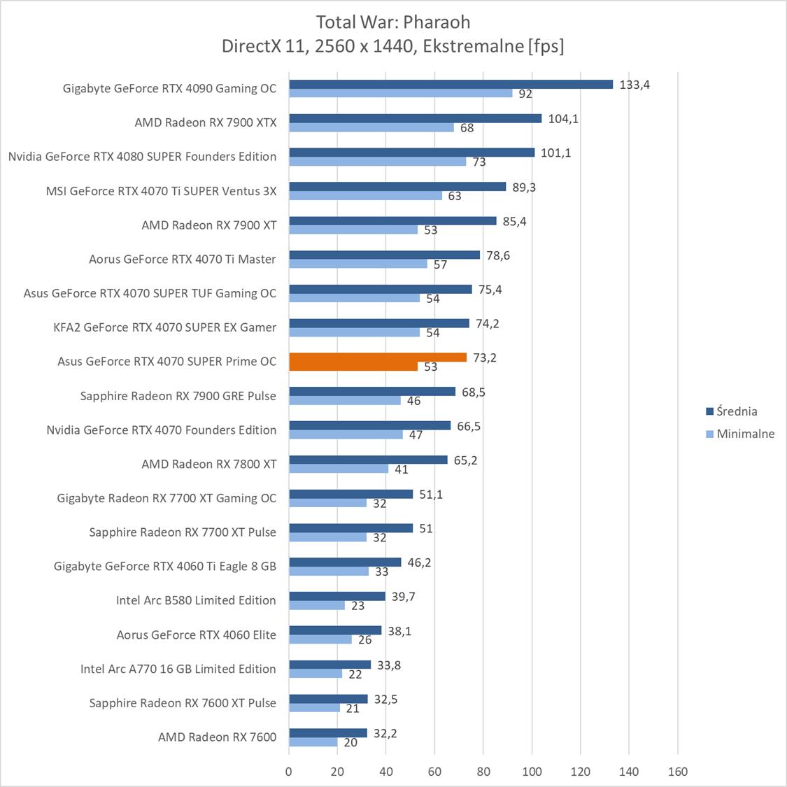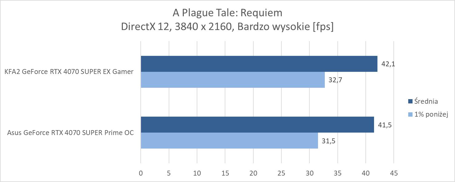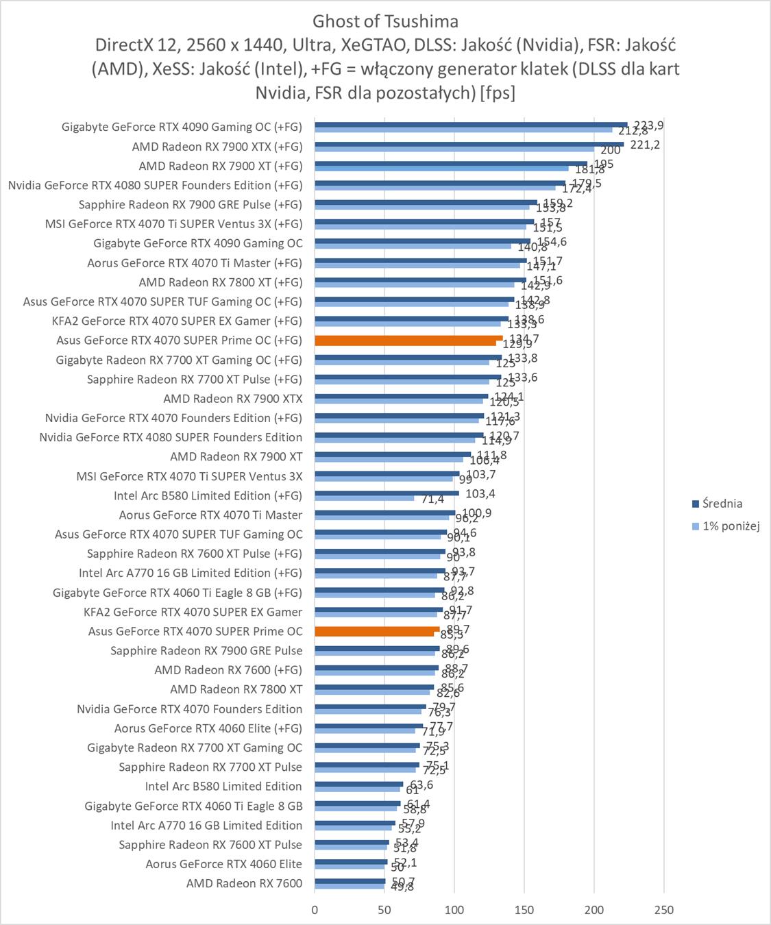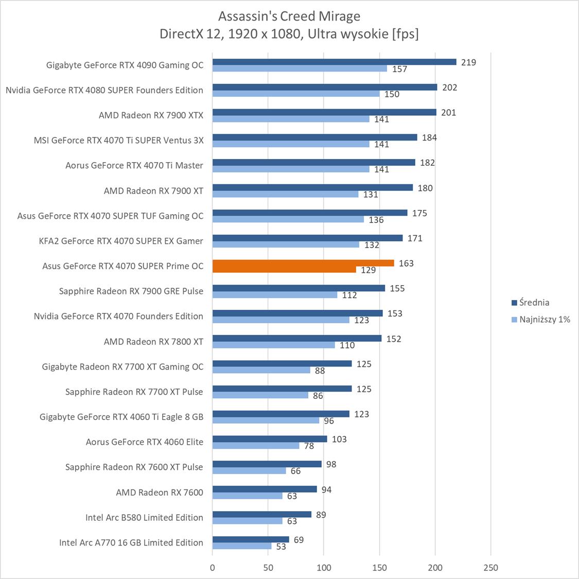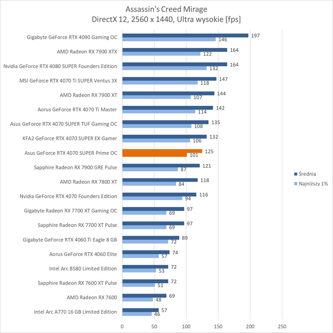 W przypadku gier z ray tracingiem jest bardzo dobrze i tutaj przewaga nad 7900 GRE jest widoczna i spora. Model Prime przegrywa z innymi wersjami RTX 4070 SUPER, ale ponownie nie jest źle. W przypadku porównania do 7900 XT jest we wszystkich rozdzielczościach wydajniej – odwrotnie niż w przypadku rasteryzacji. Choć trzeba przyznać, że w 3840 x 2160 grafiki praktycznie są takie same.