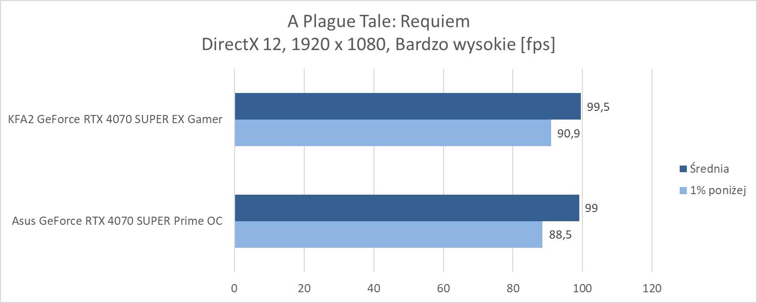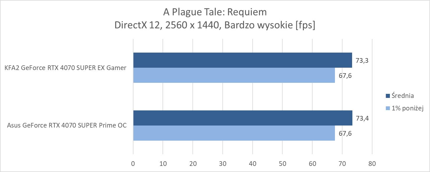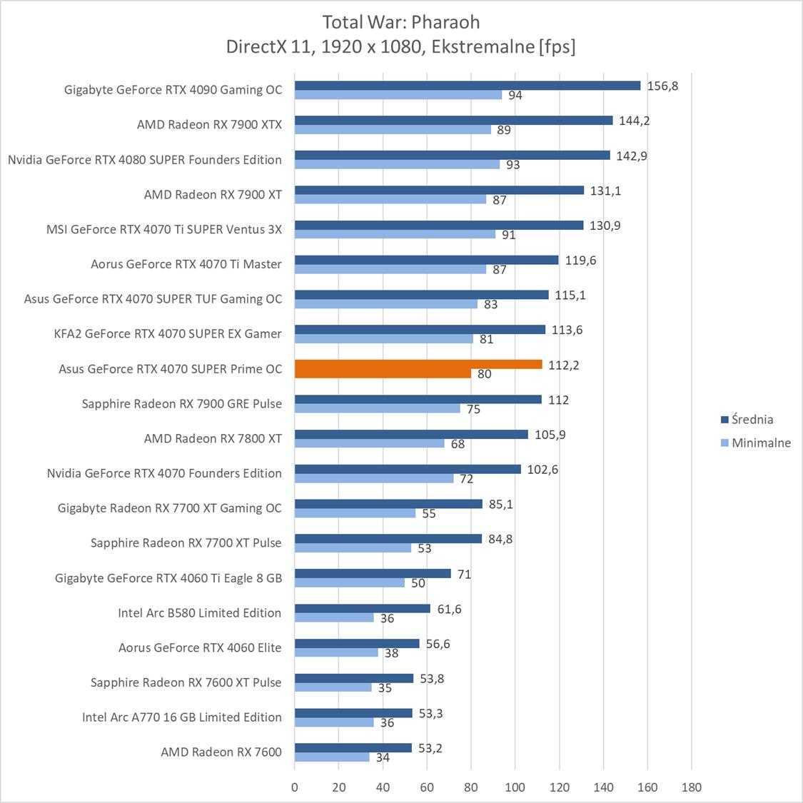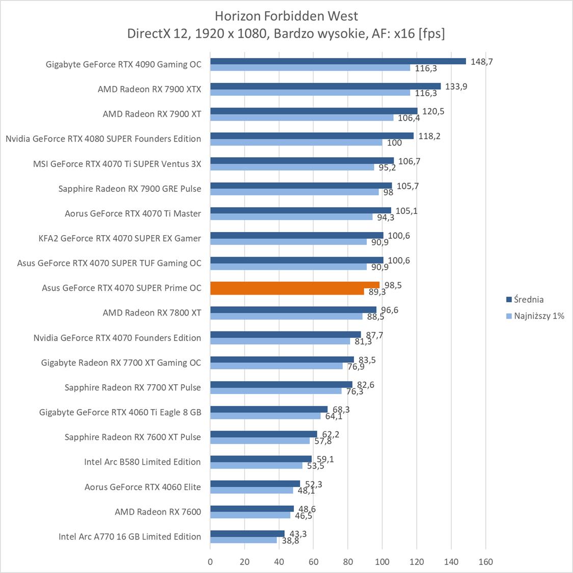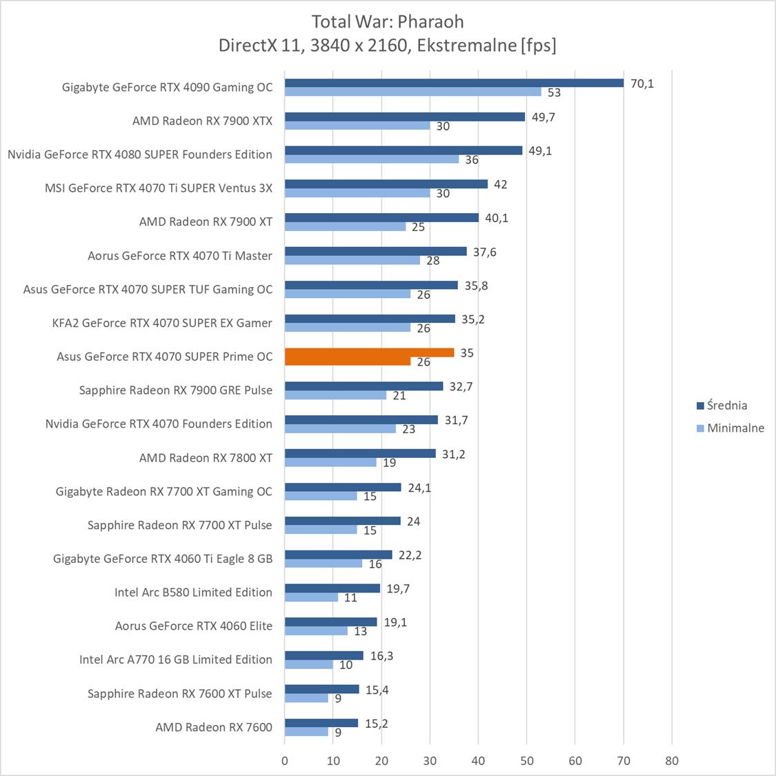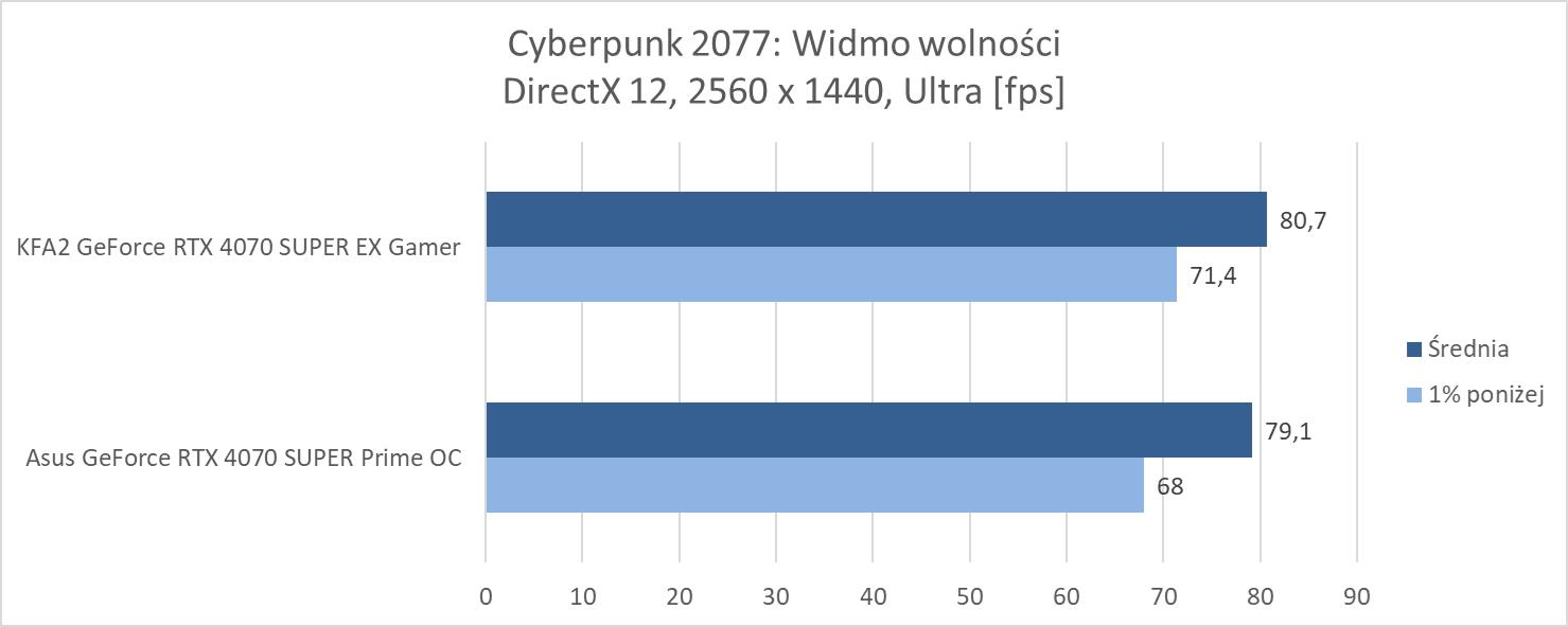 W przypadku gier z ray tracingiem jest bardzo dobrze i tutaj przewaga nad 7900 GRE jest widoczna i spora. Model Prime przegrywa z innymi wersjami RTX 4070 SUPER, ale ponownie nie jest źle. W przypadku porównania do 7900 XT jest we wszystkich rozdzielczościach wydajniej – odwrotnie niż w przypadku rasteryzacji. Choć trzeba przyznać, że w 3840 x 2160 grafiki praktycznie są takie same.