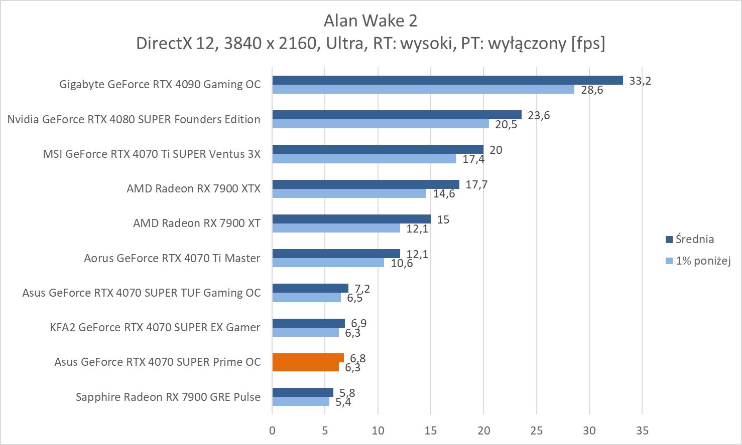 Po włączeniu RT tylko w Alan Wake 2 mamy poniżej 60 fps. Jest więc nadal naprawdę bardzo dobrze.