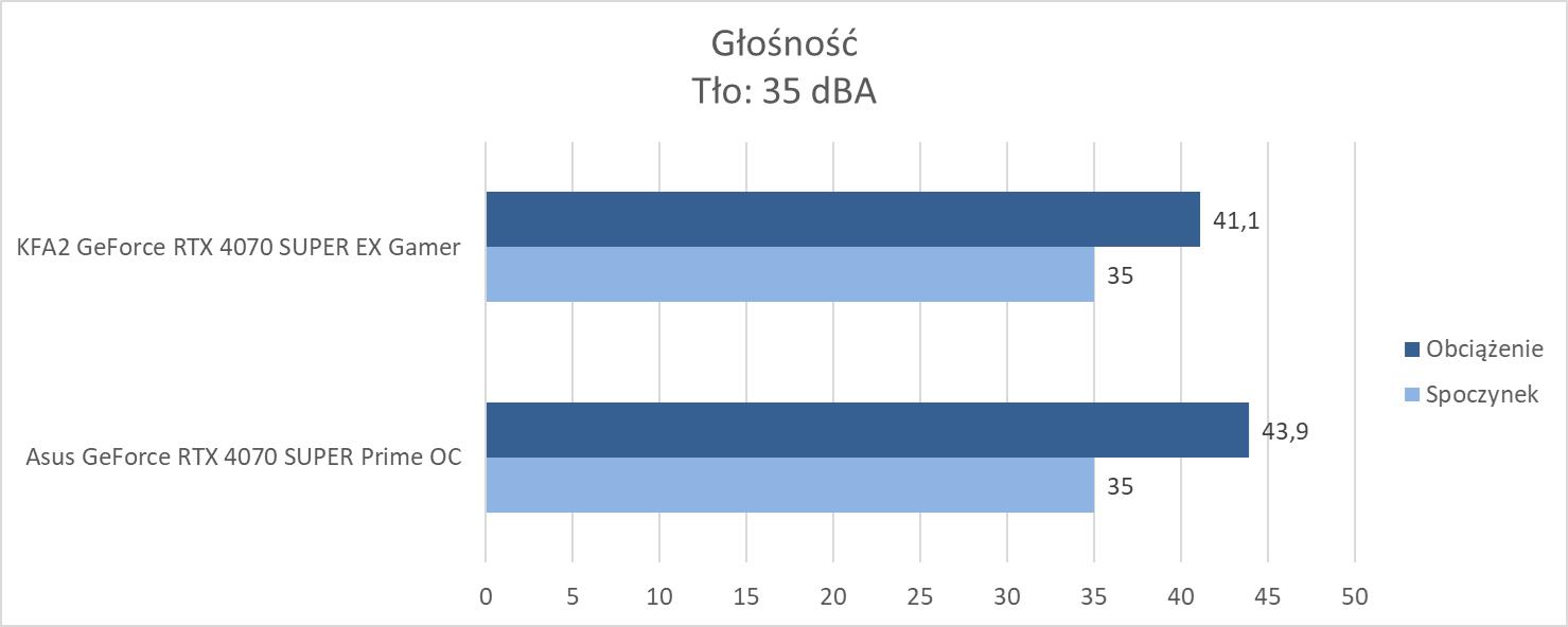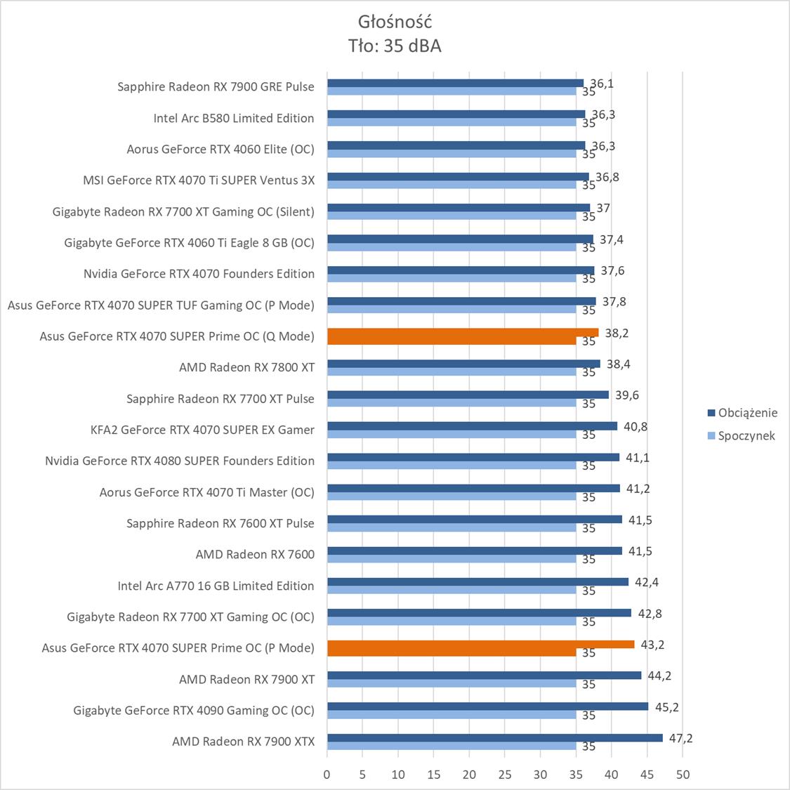 W spoczynku karta pracuje pasywnie. Pod obciążeniem w trybie Q jest cicho, choć nie najciszej. Natomiast takie ustawienie nie powinno przeszkadzać podczas działania. W trybie P karta robi się jednak słyszalna i jak widać jest jedną z głośniejszych w zestawieniu.