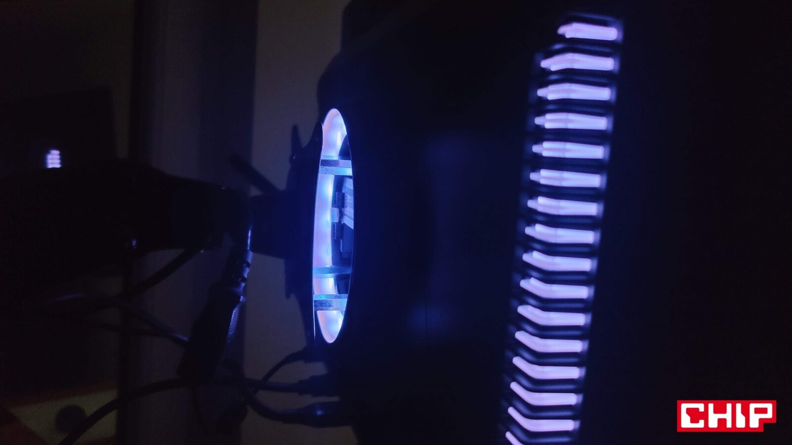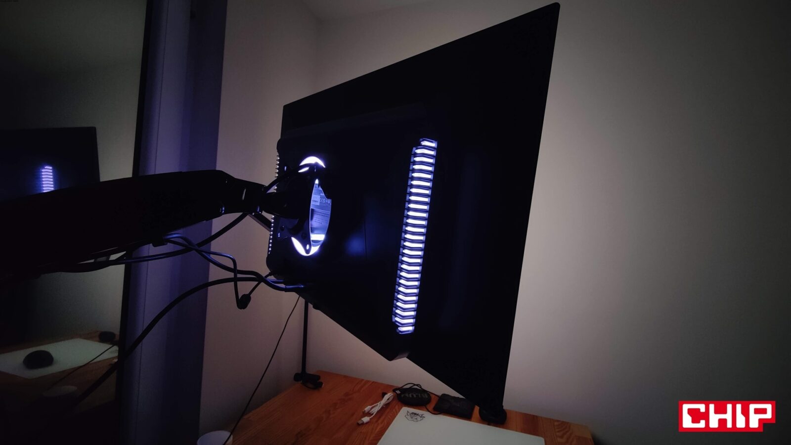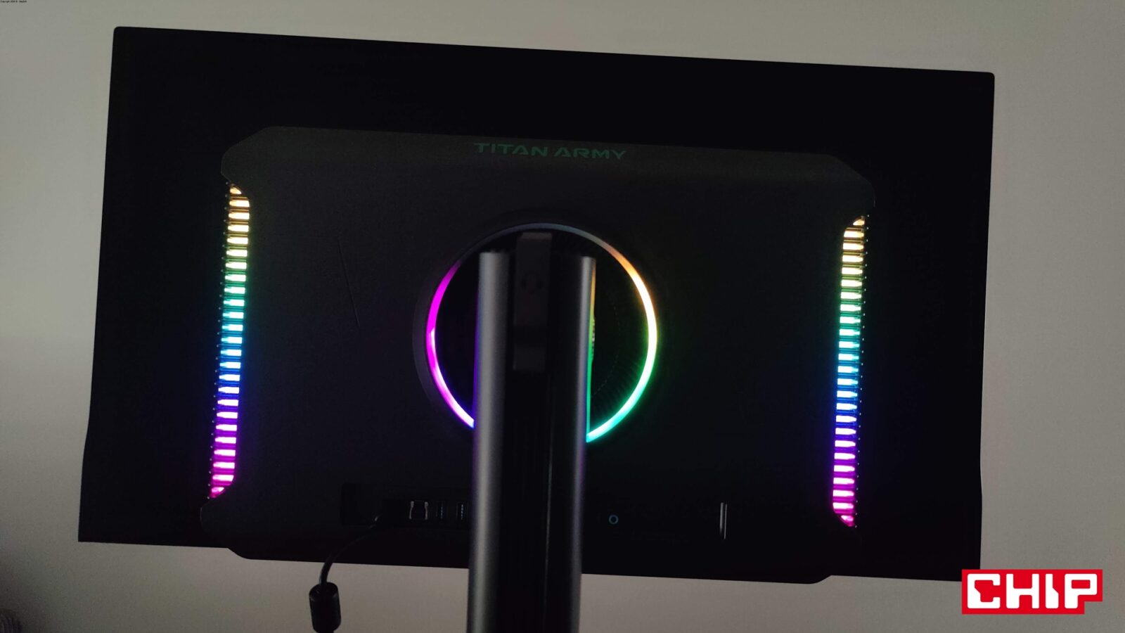 Świetne oświetlenie obudowy i niebłyszczący ekran, który błyszczącym ekranem jest. Tak w skrócie mogę z kolei opisać pierwsze chwile po zamontowaniu Titan Army G27T8T na stanowisku. Chociaż w specyfikacji znajdziemy informację, że ekran jest nieodblaskowy, to wystarczy przyświecić do niego np. latarką smartfonu, aby zauważyć, że w rzeczywistości odblaskowy jest, a przez to co jaśniejsze źródło światła (np. odsłonięta żarówka w pokoju) odznacza się na jego powierzchni. Jeśli z kolei lubicie jasne stanowiska po zmroku, to docenicie rozległy i rzeczywiście zaawansowany system podświetlenia, który obejmuje centralną część monitora (okrąg dookoła miejsca montażowego podstawki) oraz posegmentowane boczne paski. Możecie ustawić je w wielu trybach oświetlenia (w tym dopasowywania do wyświetlanego obrazu), regulować poziom jasności (niska/średnia/wysoka) i ewentualnie całkowicie wyłączyć. Co być może ważne dla niektórych, w menu znajdziecie też funkcję dezaktywacji osobno podświetlanego okręgu, jak i obu bocznych pasków.