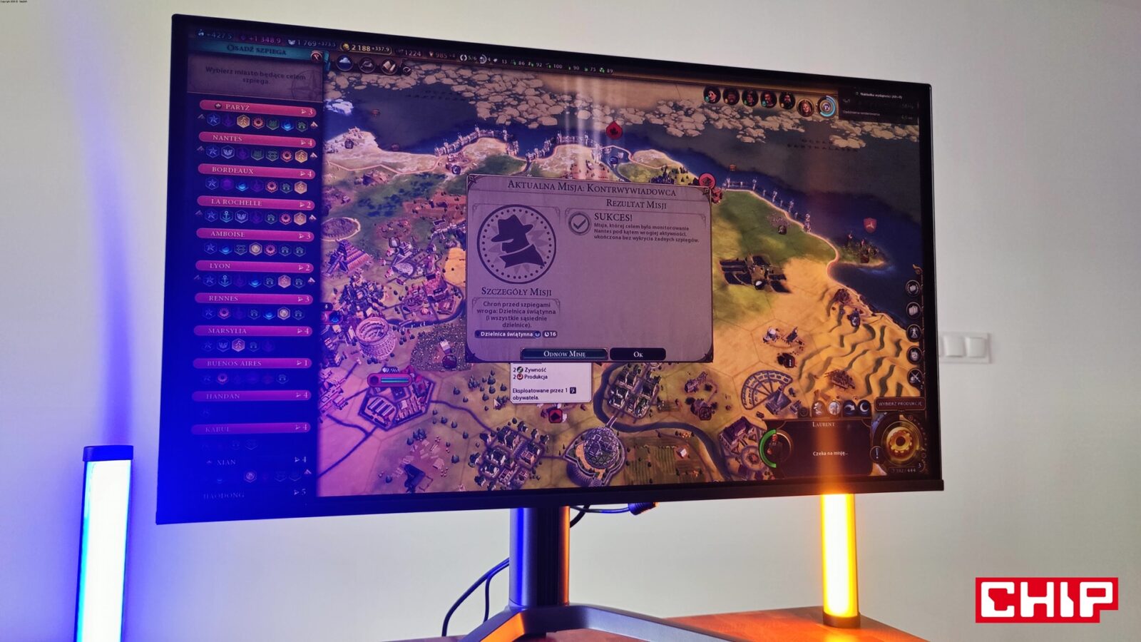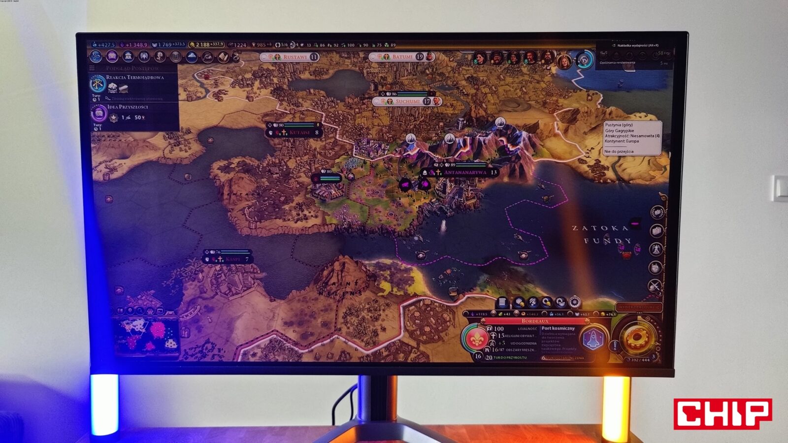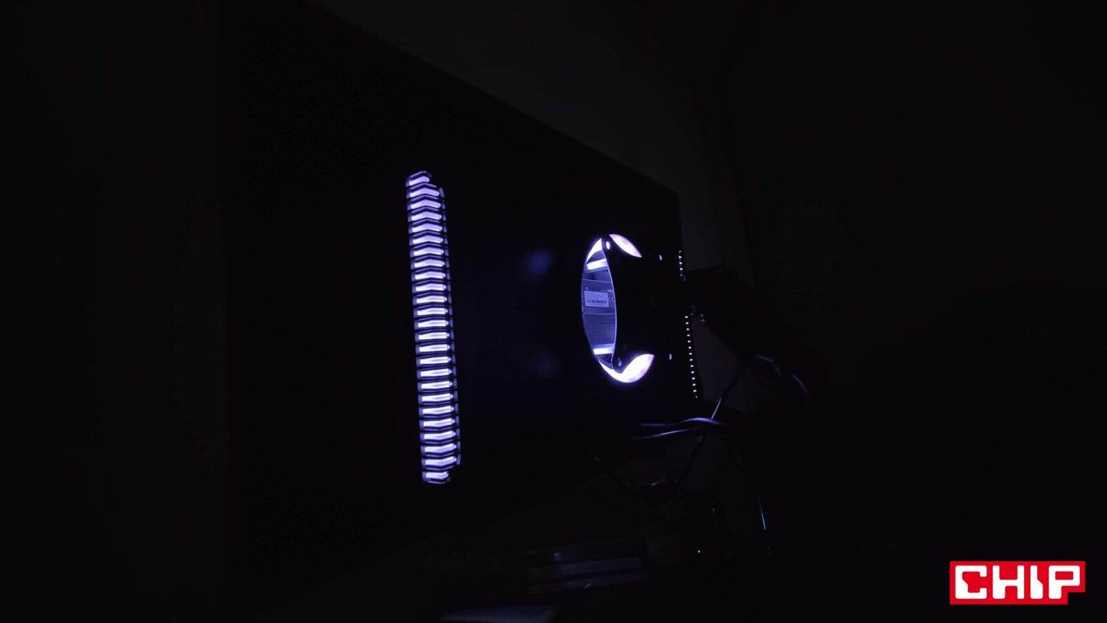 Świetne oświetlenie obudowy i niebłyszczący ekran, który błyszczącym ekranem jest. Tak w skrócie mogę z kolei opisać pierwsze chwile po zamontowaniu Titan Army G27T8T na stanowisku. Chociaż w specyfikacji znajdziemy informację, że ekran jest nieodblaskowy, to wystarczy przyświecić do niego np. latarką smartfonu, aby zauważyć, że w rzeczywistości odblaskowy jest, a przez to co jaśniejsze źródło światła (np. odsłonięta żarówka w pokoju) odznacza się na jego powierzchni. Jeśli z kolei lubicie jasne stanowiska po zmroku, to docenicie rozległy i rzeczywiście zaawansowany system podświetlenia, który obejmuje centralną część monitora (okrąg dookoła miejsca montażowego podstawki) oraz posegmentowane boczne paski. Możecie ustawić je w wielu trybach oświetlenia (w tym dopasowywania do wyświetlanego obrazu), regulować poziom jasności (niska/średnia/wysoka) i ewentualnie całkowicie wyłączyć. Co być może ważne dla niektórych, w menu znajdziecie też funkcję dezaktywacji osobno podświetlanego okręgu, jak i obu bocznych pasków.