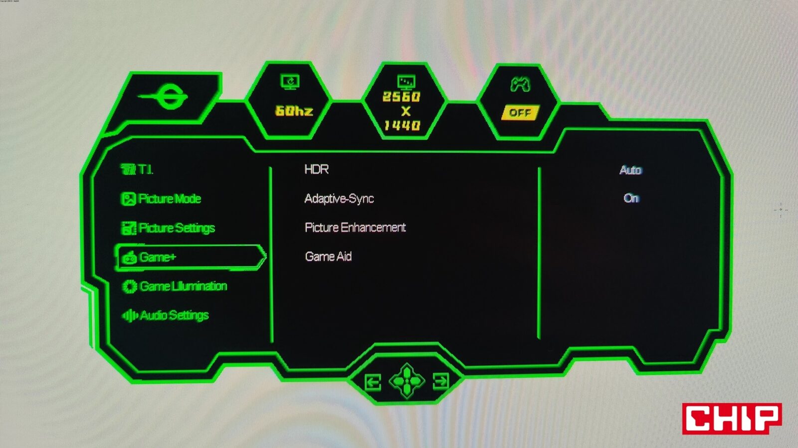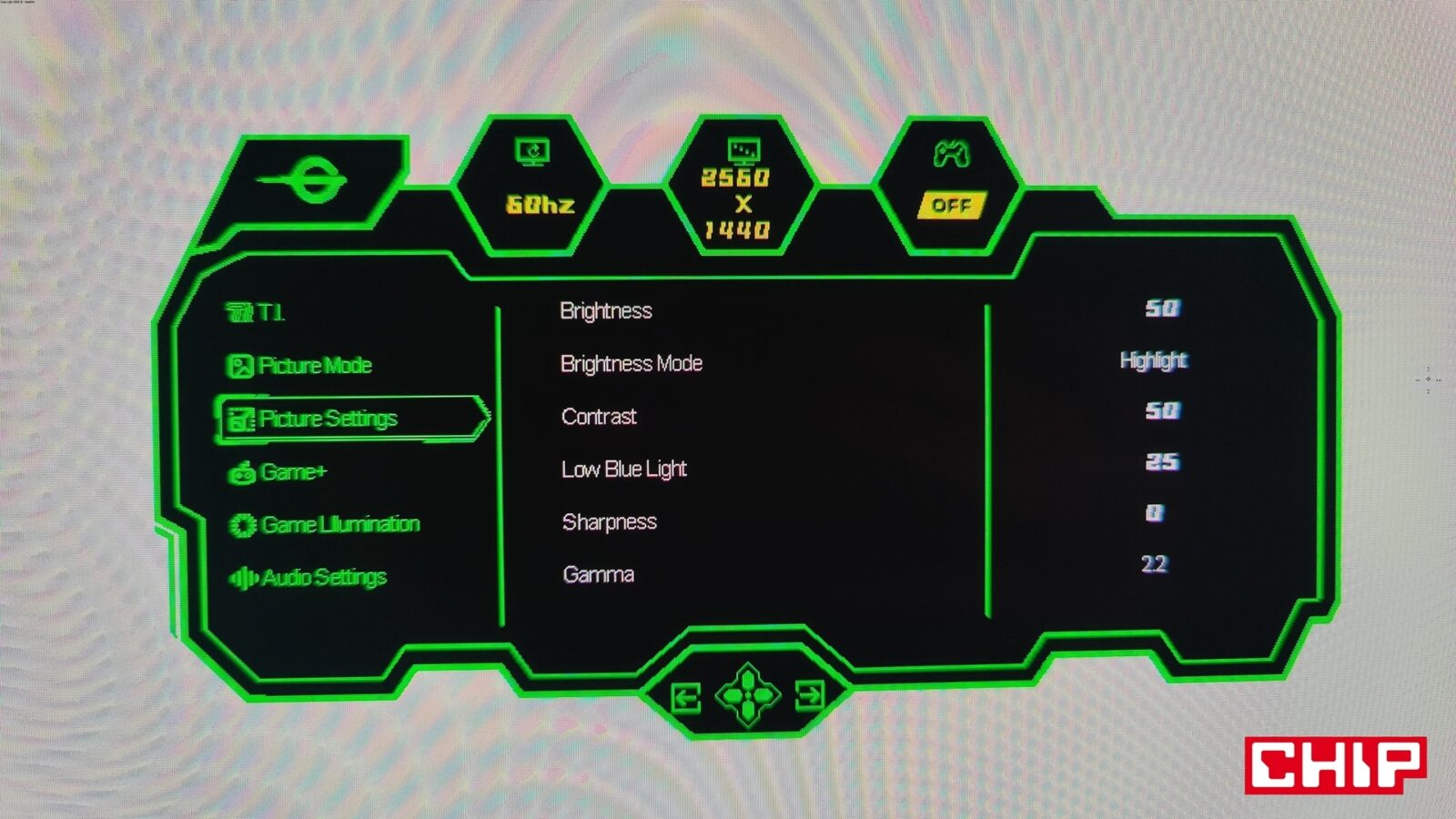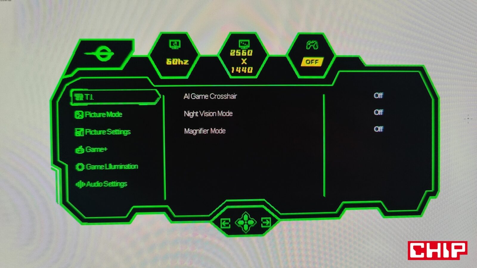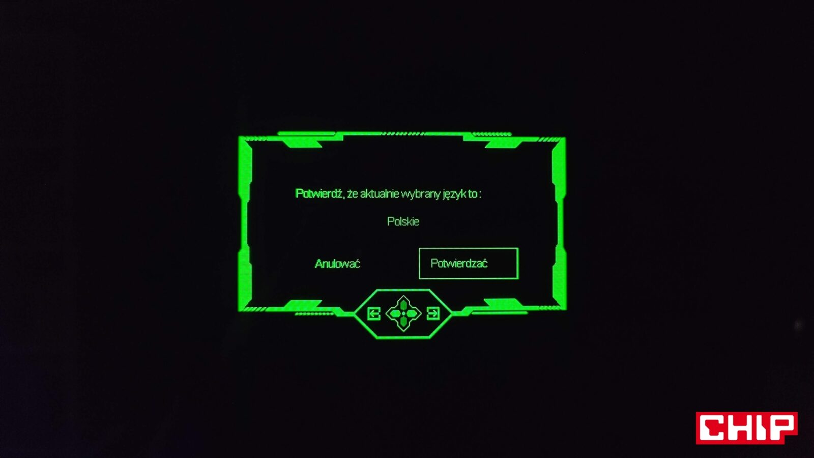 Opcje te są dostępne z poziomu typowego menu OSD (On-Screen Display), które na język polski zostało przetłumaczone w bardzo nieprecyzyjny sposób, zmuszając tym samym użytkowników do pozostania przy wersji angielskiej. Wywołujecie je, wciskając przycisk podświetlany bladą niebieską diodą na środku dolnej krawędzi, który działa też na boki (w czterech kierunkach), umożliwiając nawigację w rozległym menu. Nie brakuje w nim najważniejszych opcji (tj. regulacji głośności wbudowanych głośników, wyboru predefiniowanych trybów do konkretnych gier czy profili kolorów, wybierania źródeł obrazu z opcją automatyczną czy dopasowywania konkretnych parametrów ekranu z jasnością, kontrastem, gammą, ostrością i filtrem niebieskiego światła na czele) i tych ekstra pokroju celownika, lupy czy trybu “nocnej wizji”, a więc podbijania jasności w celu łatwiejszego dostrzegania przeciwników w ciemnych pomieszczeniach.