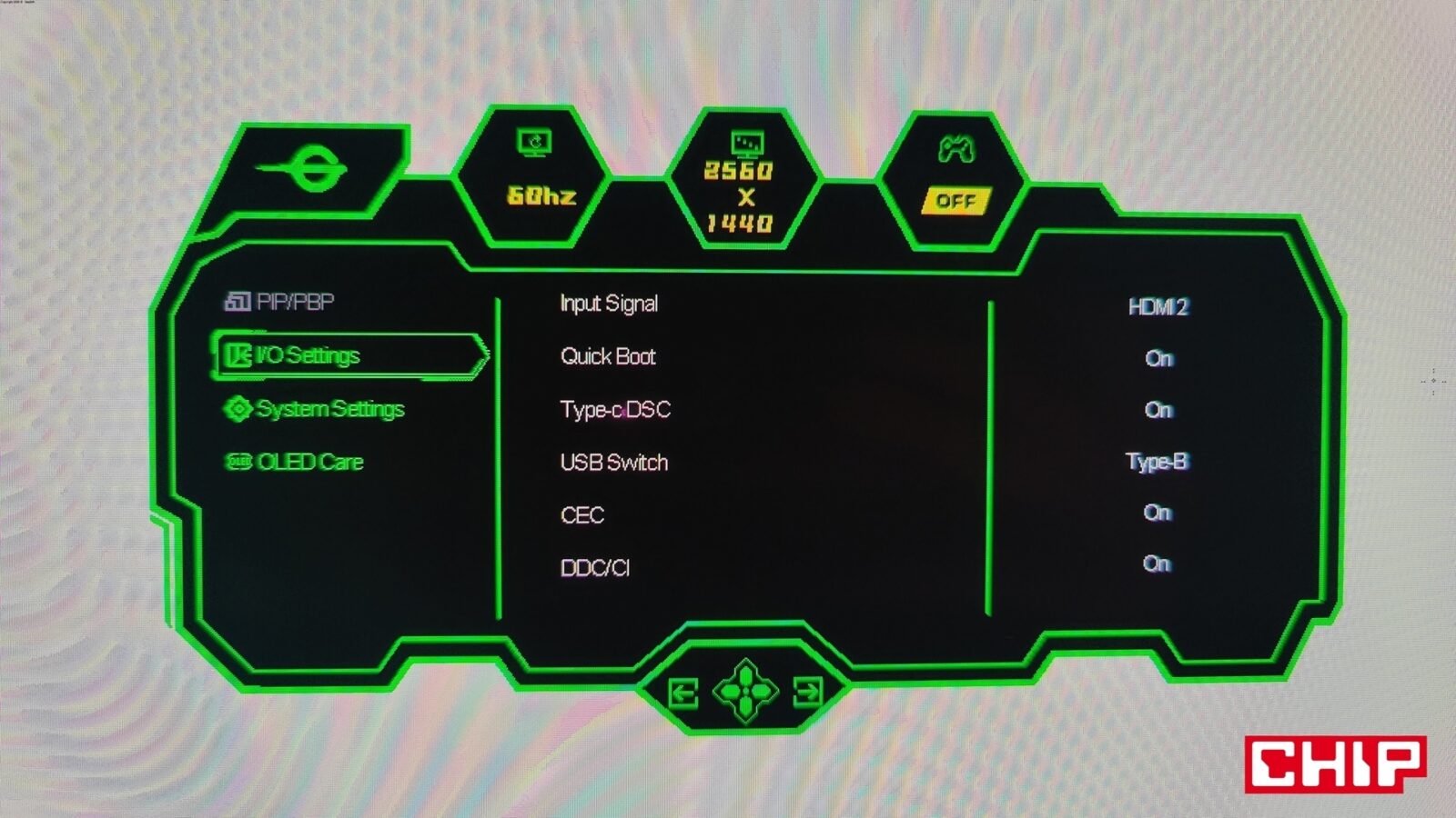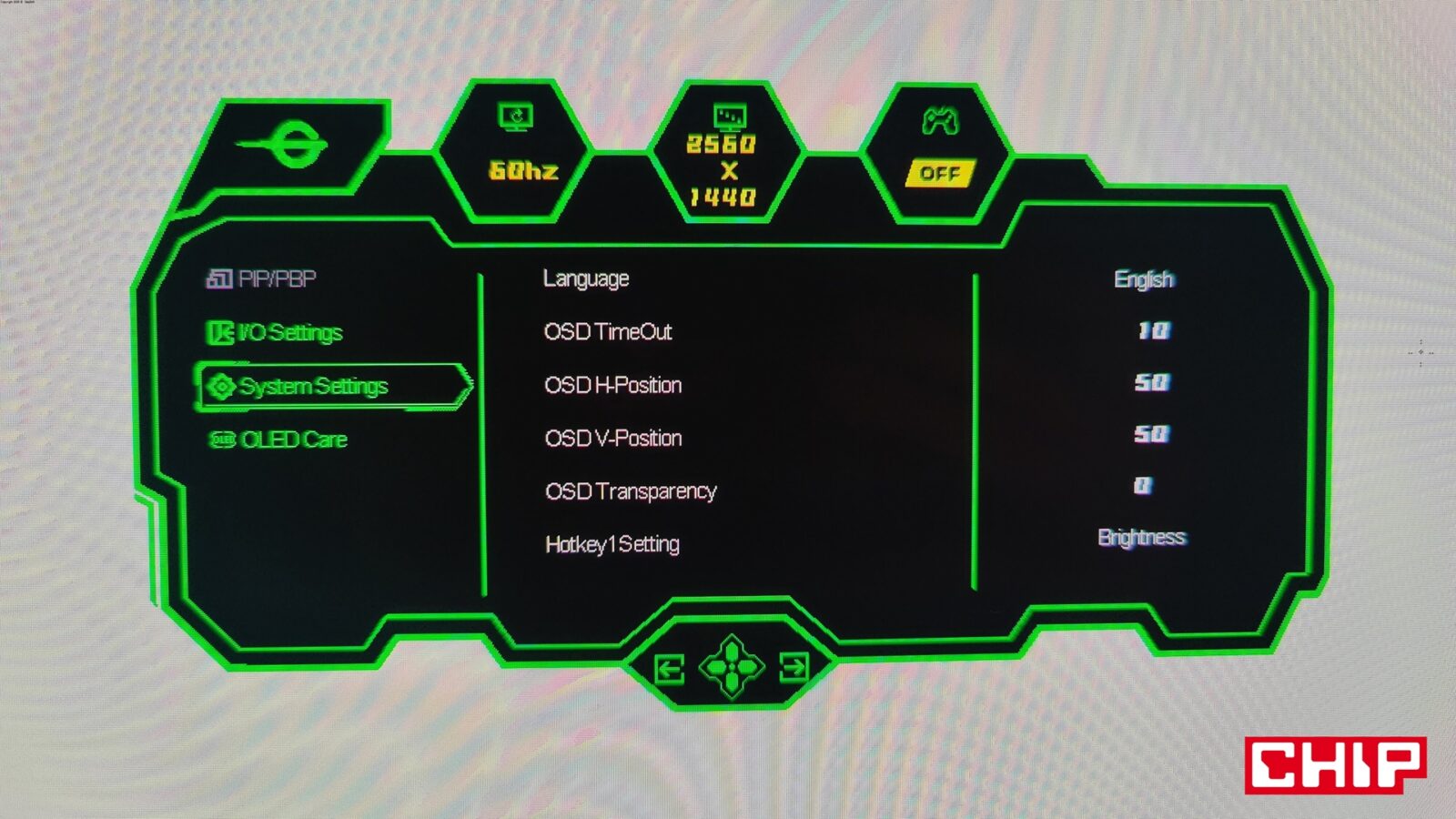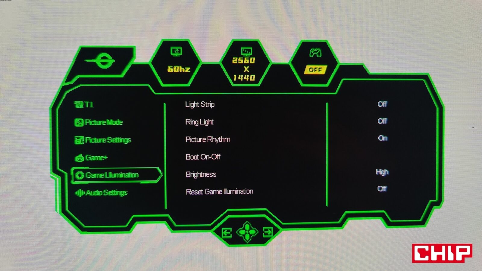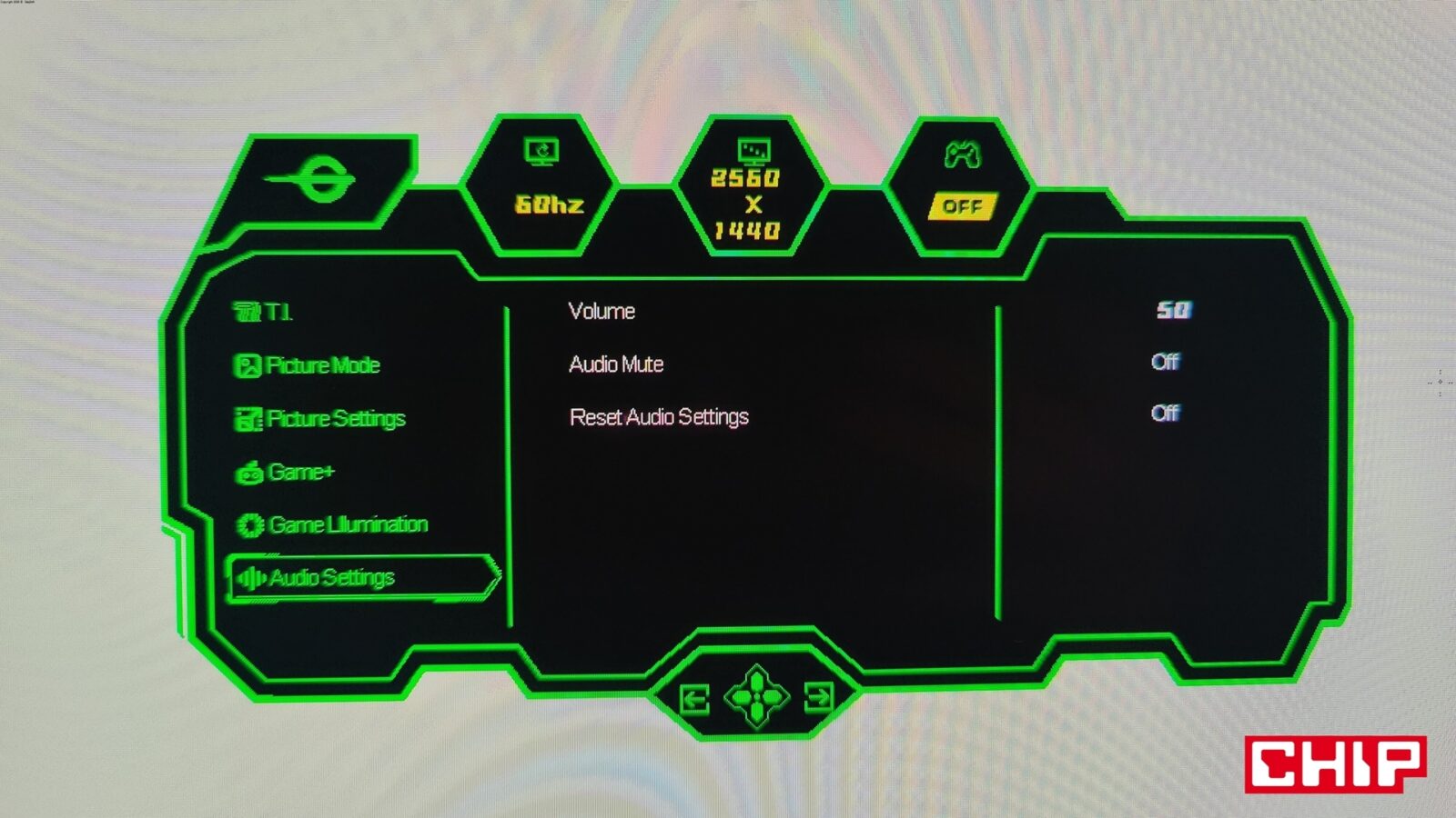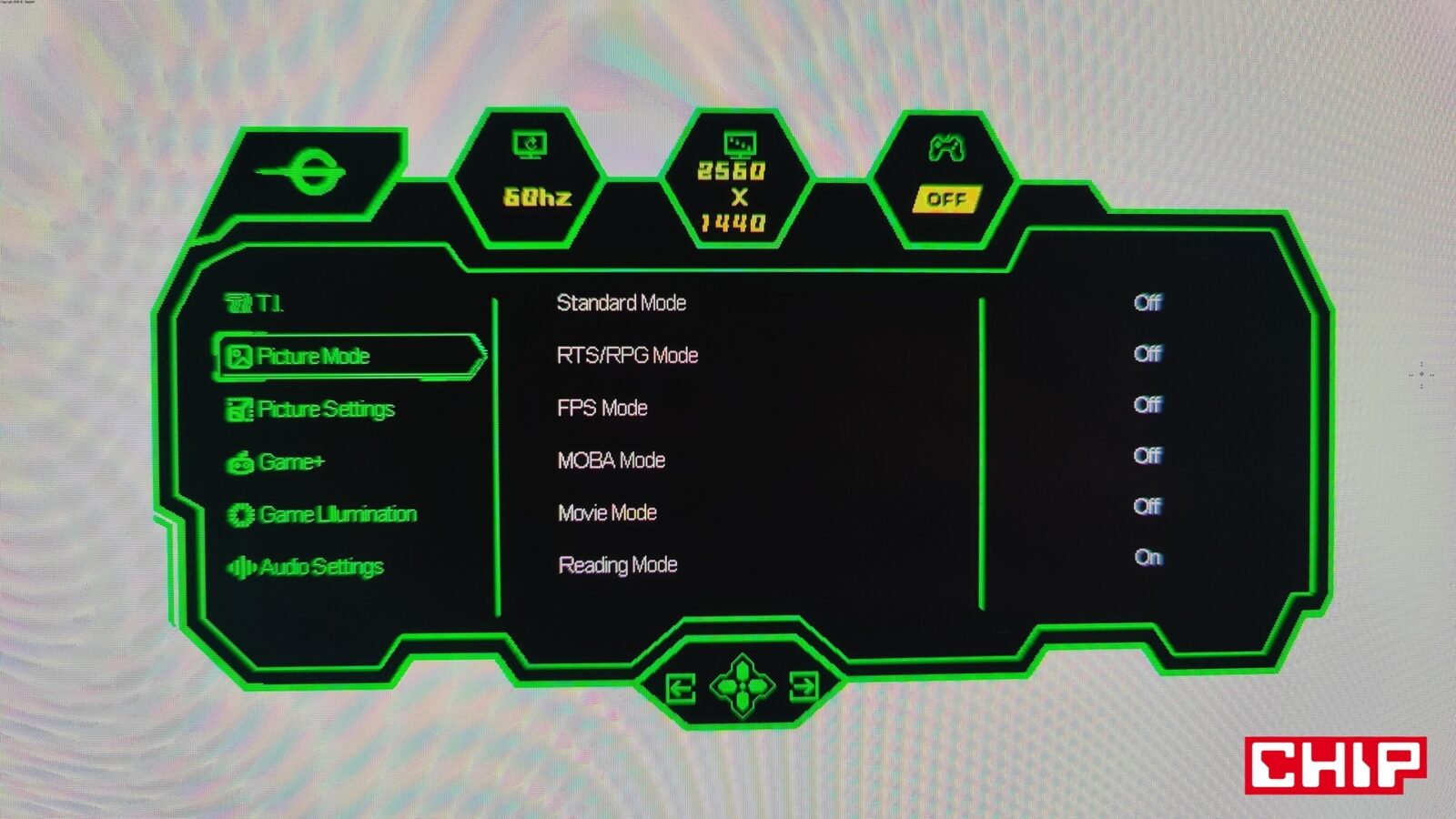 Opcje te są dostępne z poziomu typowego menu OSD (On-Screen Display), które na język polski zostało przetłumaczone w bardzo nieprecyzyjny sposób, zmuszając tym samym użytkowników do pozostania przy wersji angielskiej. Wywołujecie je, wciskając przycisk podświetlany bladą niebieską diodą na środku dolnej krawędzi, który działa też na boki (w czterech kierunkach), umożliwiając nawigację w rozległym menu. Nie brakuje w nim najważniejszych opcji (tj. regulacji głośności wbudowanych głośników, wyboru predefiniowanych trybów do konkretnych gier czy profili kolorów, wybierania źródeł obrazu z opcją automatyczną czy dopasowywania konkretnych parametrów ekranu z jasnością, kontrastem, gammą, ostrością i filtrem niebieskiego światła na czele) i tych ekstra pokroju celownika, lupy czy trybu “nocnej wizji”, a więc podbijania jasności w celu łatwiejszego dostrzegania przeciwników w ciemnych pomieszczeniach.
