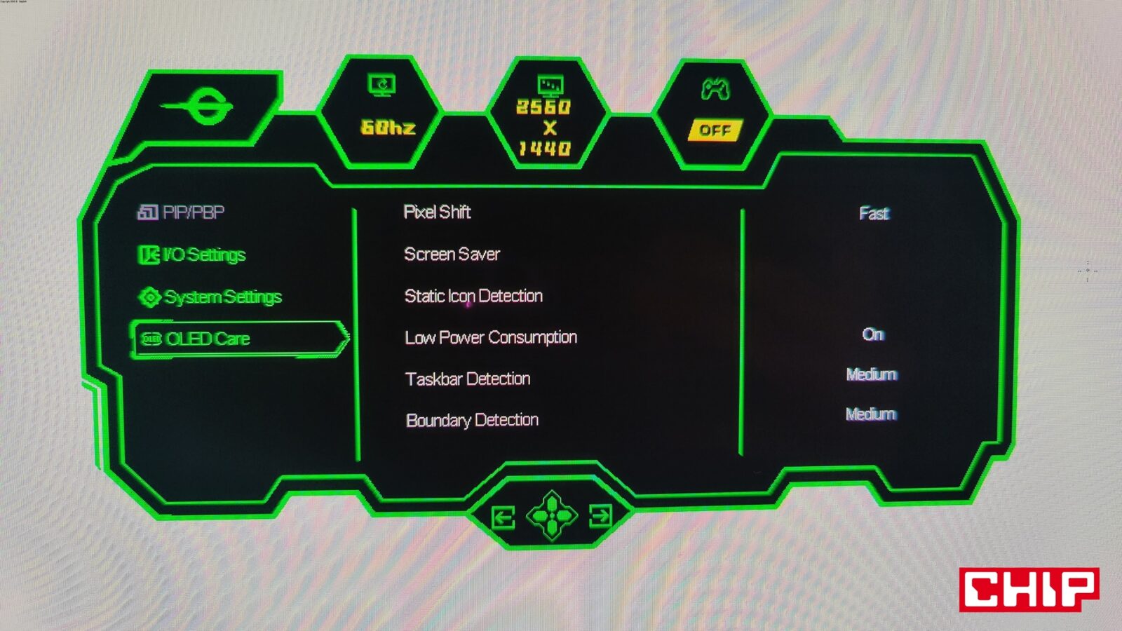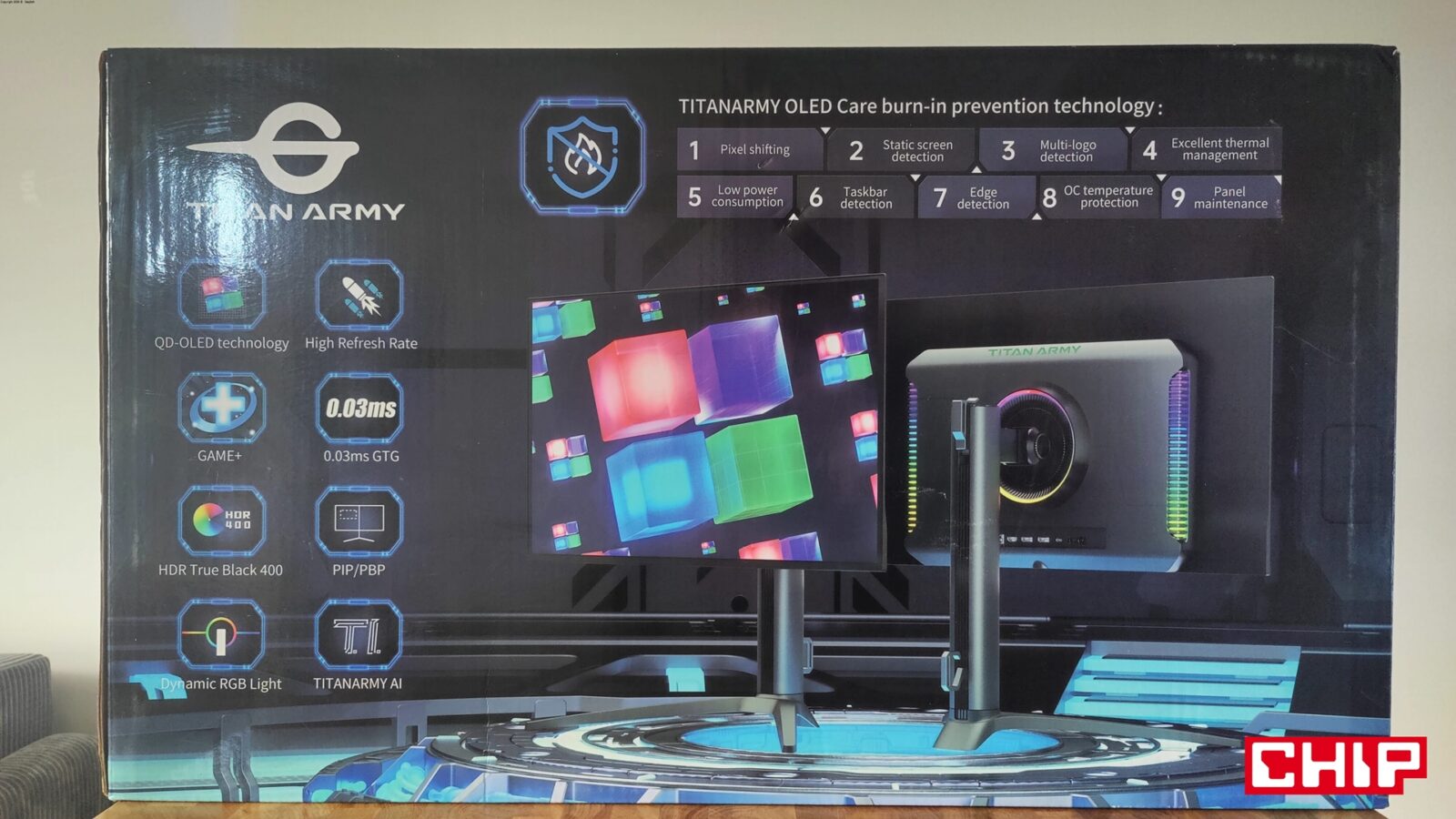 Oczywiście nawet najbardziej zaawansowane matryce OLED nie są wolne od swojej największej zmory – statycznych obrazów. Dlatego też Titan Army wprowadził do oprogramowania monitora działające w tle funkcje pokroju m.in. przesuwania całego obrazu o jeden piksel, obniżania jasności po wykryciu statycznej treści czy wywoływanej na życzenie procedury “odświeżania” matrycy. Monitor upomni się nawet o przerwę, jeśli będziecie korzystać z niego bez przerwy przez kilka godzin. Wszystkie te ustawienia są oczywiście dostępne do spersonalizowania w dedykowanym menu w OSD (OLED Care).