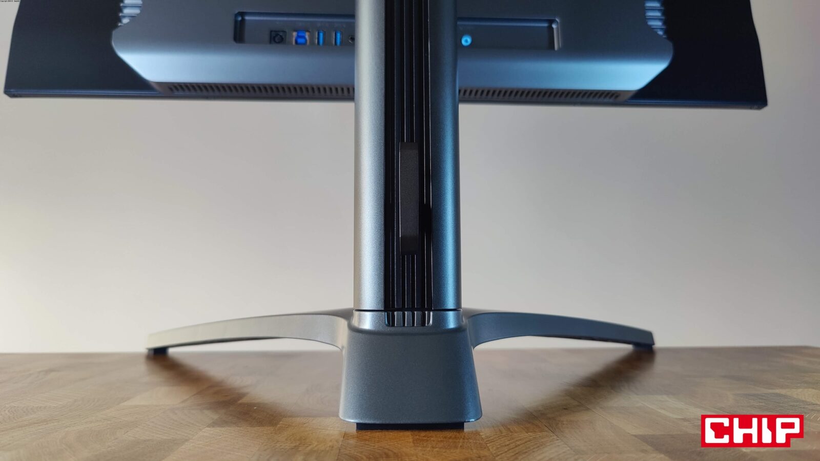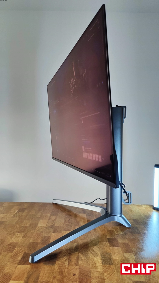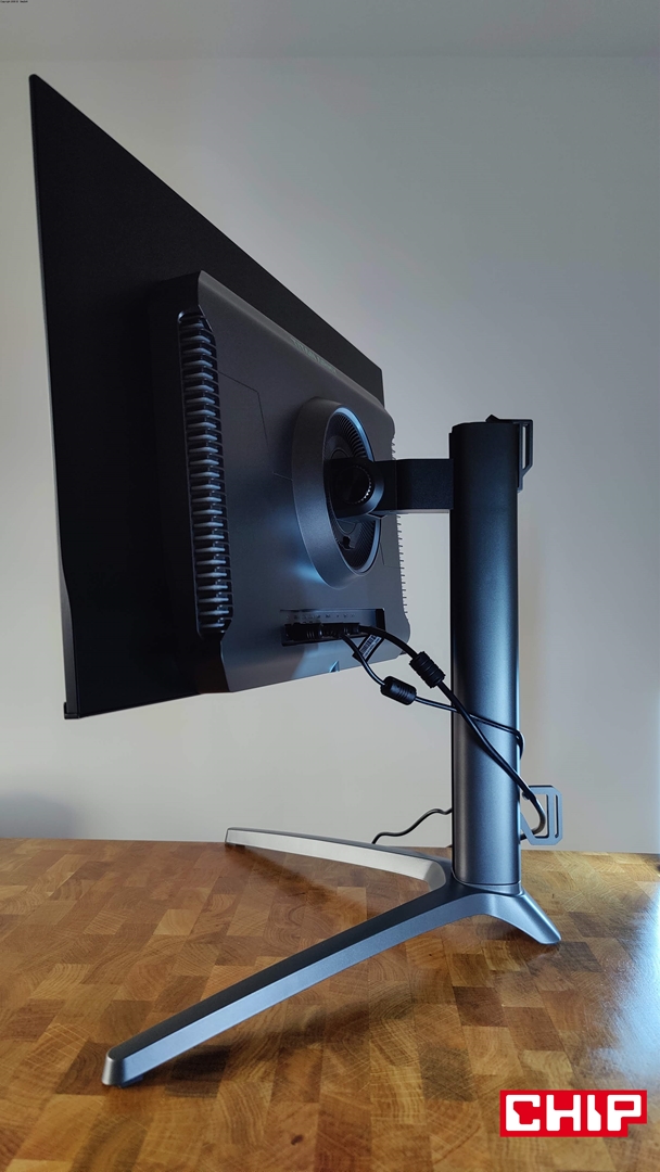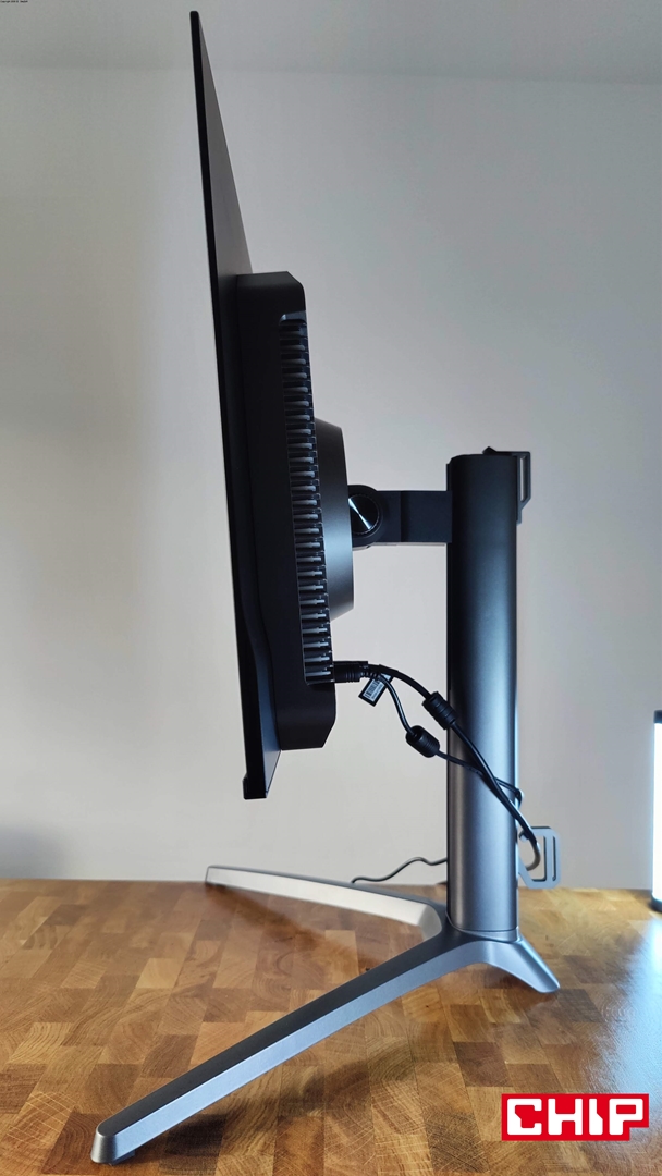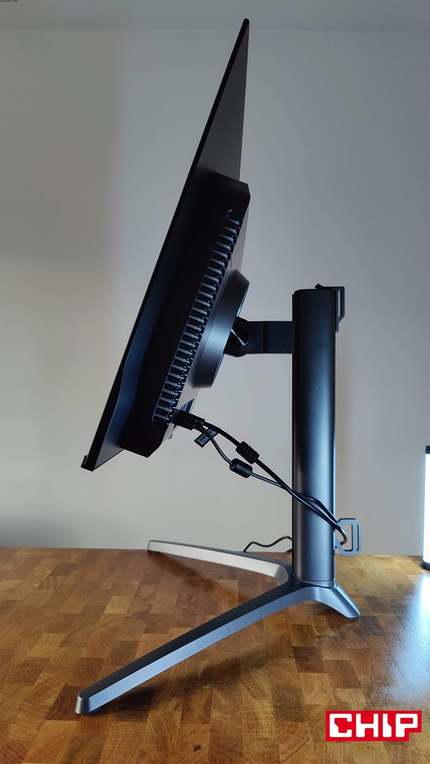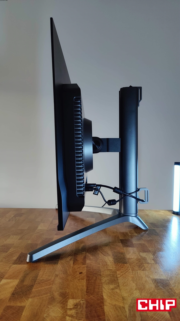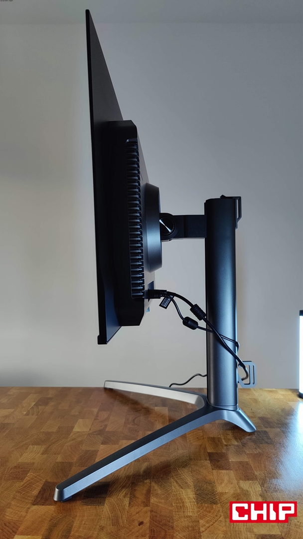 Narzekać mogę też na maksymalną wysokość monitora, bo dla perfekcyjnej ergonomii musiałem zdecydować się na zamontowanie go na uchwycie VESA. Szkoda, bo poza wspomnianymi uchwytami podstawka zapewnia rozległą regulację, wliczając w to typową regulację wysokości do 12 cm, odchylenia na boki do 20 stopni, wychylenia góra-dół od -5 do 20 stopni oraz obracanie monitora do orientacji pionowej.