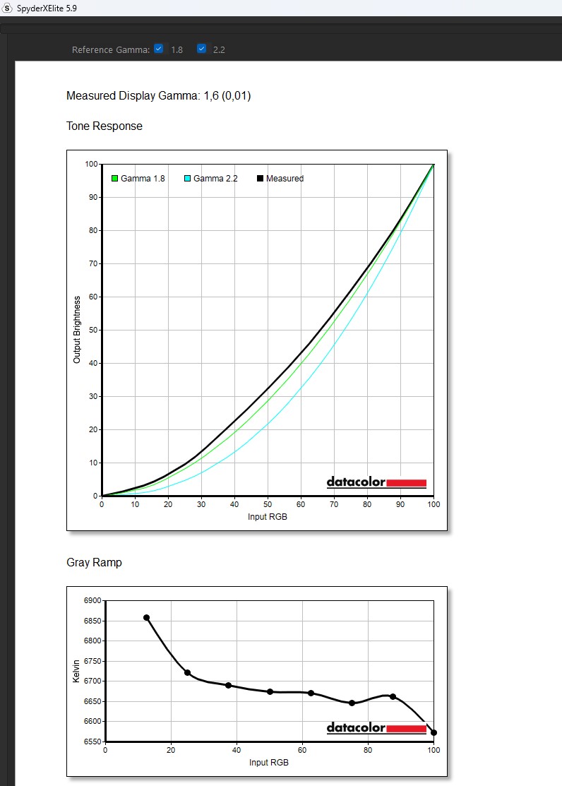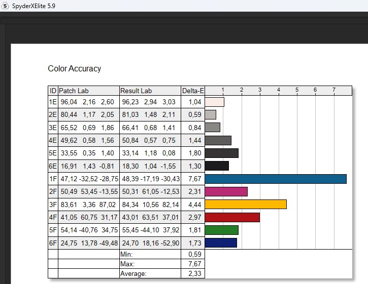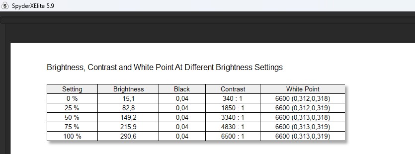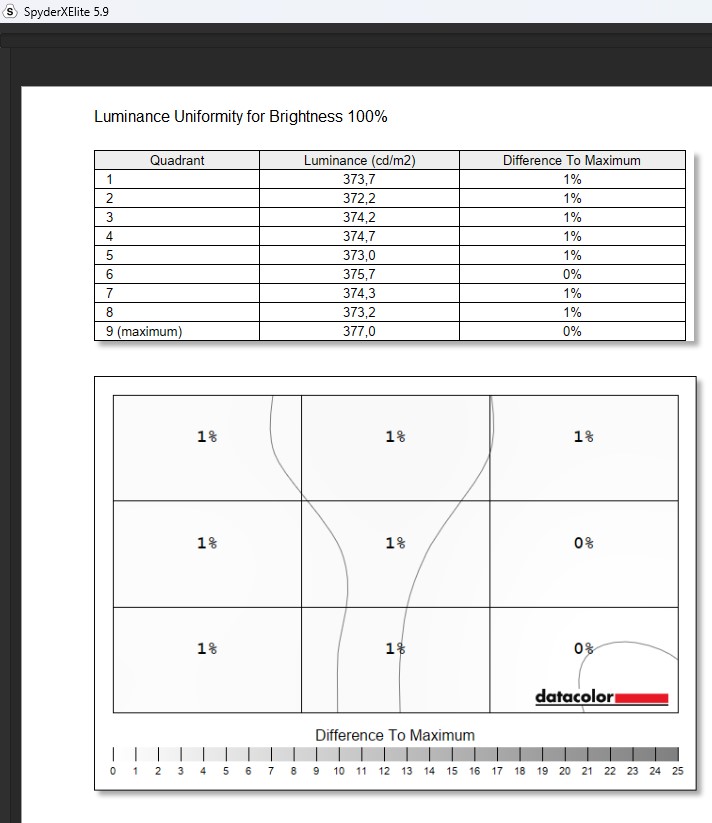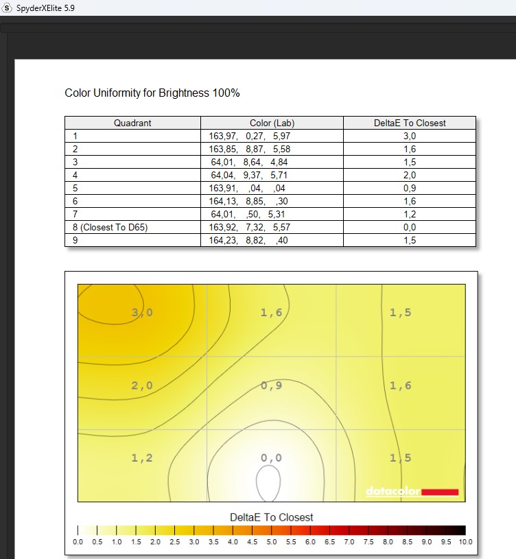 Jednym z największych atutów tego panelu OLED jest jego doskonała równomierność jasności i kolorów. Przy maksymalnej jasności rzędu 290 nitów w trybie SDR różnice w luminancji w różnych kwadrantach ekranu wynoszą zaledwie 1%, co podkreśla jakość wykonania matrycy. Natomiast w testach dokładności koloru (Delta-E) punkt najbliższy D65 osiągnął idealną wartość, co jest zgodne z deklaracjami producenta. Idealna czerń (0,04 cd/m²) i imponujący współczynnik kontrastu na poziomie 6500:1 w trybie SDR również są godne uwagi.