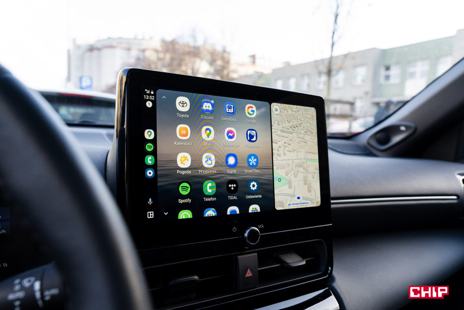Ekran główny też jest dobrej jakości. Niezmiennie niewiele na nim ustawimy, bo ustawienia auta i działania interfejsu wprowadzamy na ekranie kierowcy przyciskami na kierownicy, ale do korzystania z Android Auto czy Apple CarPlay jest jak znalazł i oba smartfonowe interfejsy działają bezprzewodowo w każdej wersji wyposażenia. Brawo Toyota!