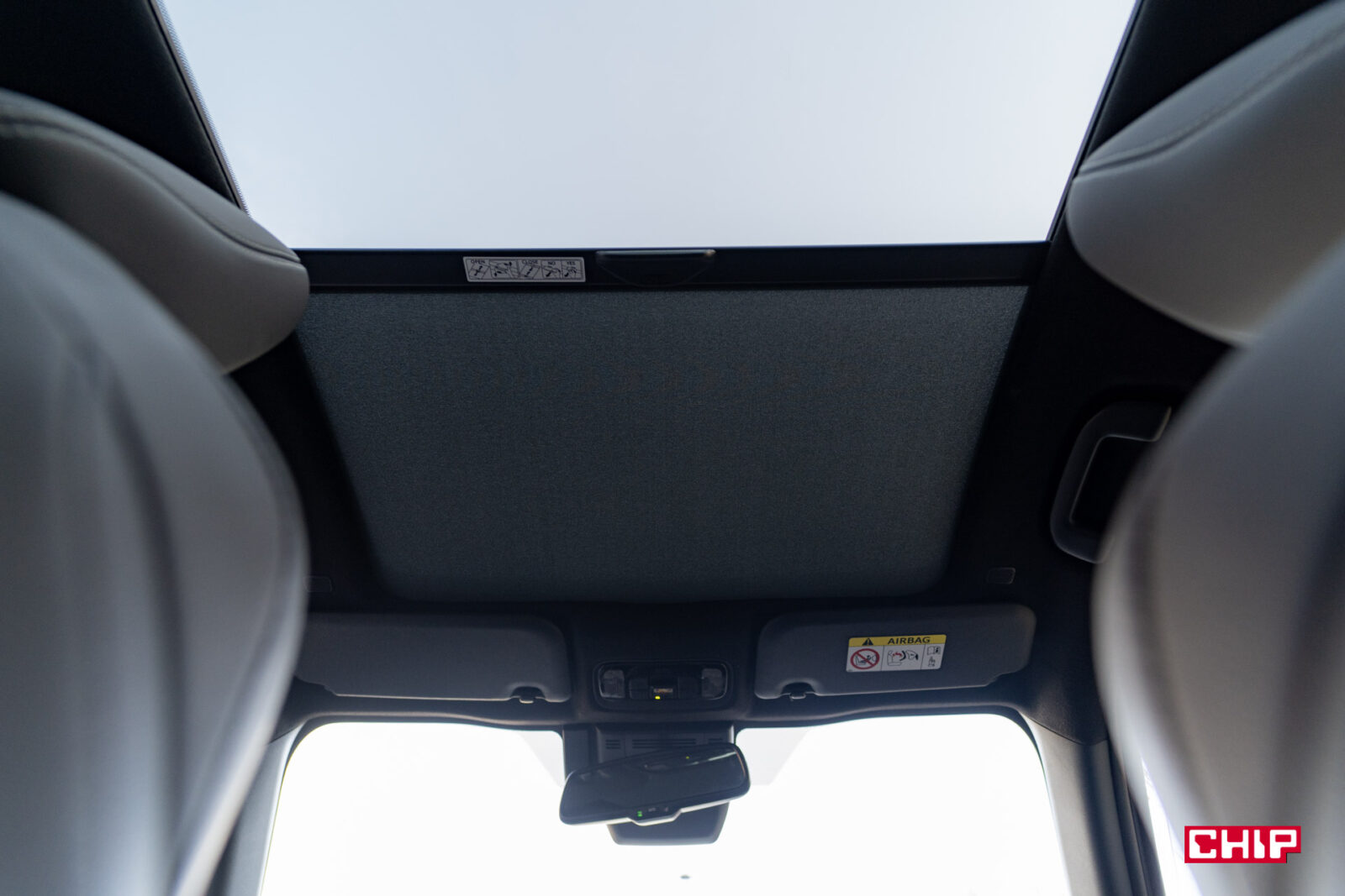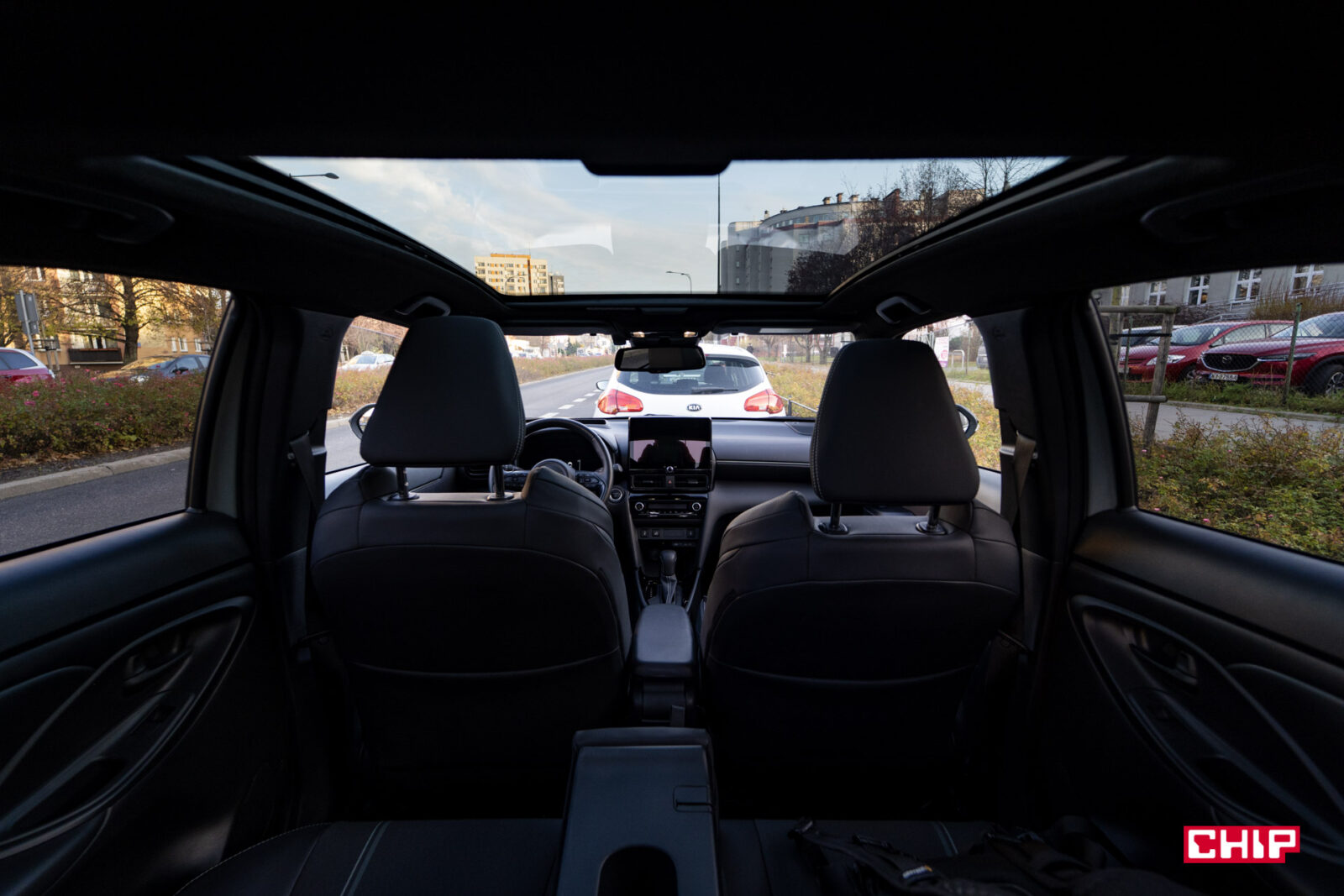 Ogromny, szklany dach widoczny na zdjęciach to niestety dodatkowo płatna opcja. Wpuszcza do środka bardzo dużo światła i ma ciekawie rozwiązane zasłanianie, bo w formie dwóch rolet. Jedna jest, oczywiście ręcznie, rozwijana z przodu do połowy długości okna, druga z tyłu. Ciekawa opcja, ale jeśli mamy odsłonięty tył i chcemy go zasłonić, to z przednich siedzeń nie ma możliwości, aby sięgnąć po roletę.