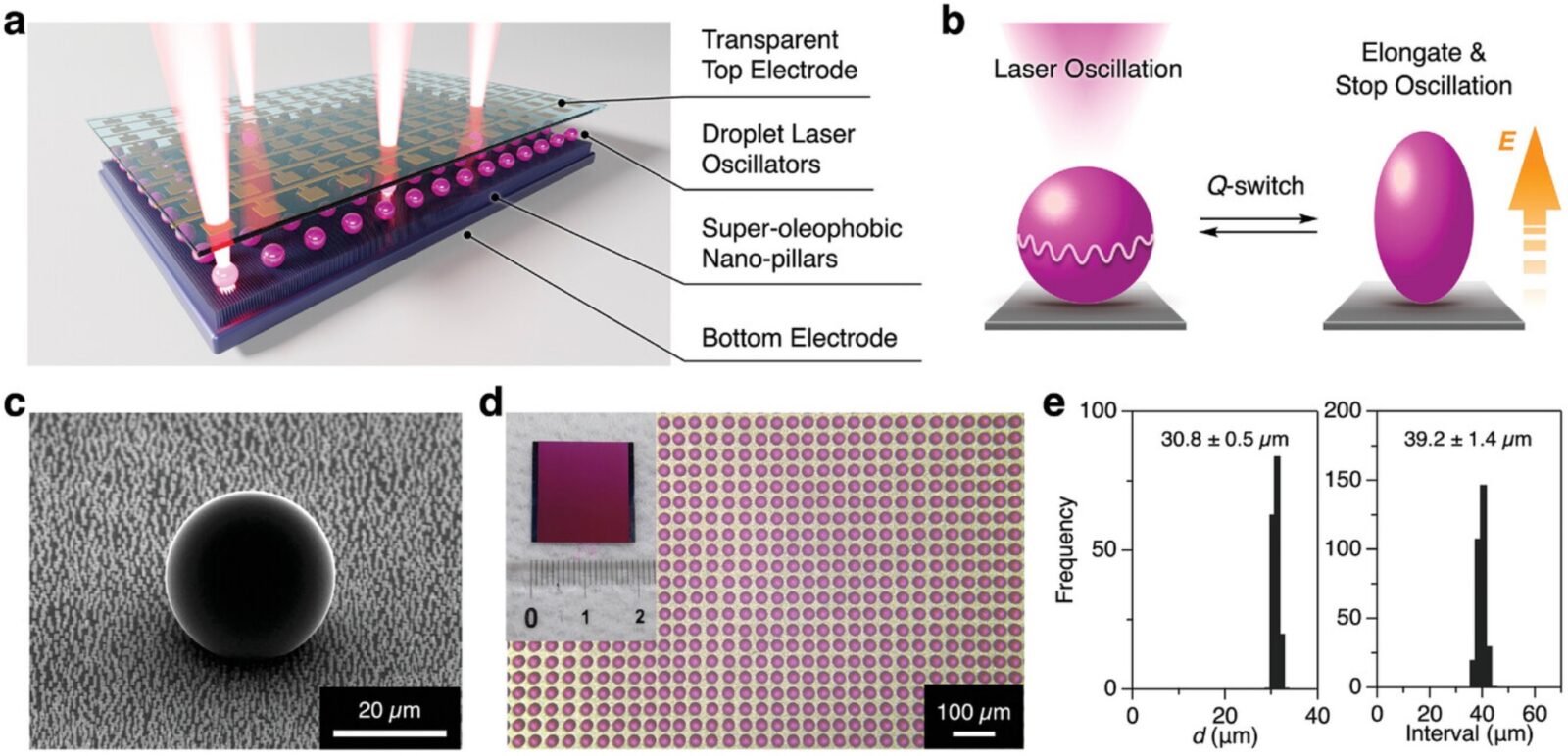 Prawdziwy przełom polega na możliwości elektrycznego sterowania tymi kroplami. Pod wpływem pola elektrycznego kuliste krople odkształcają się do kształtu elipsoidalnego, co powoduje zatrzymanie emisji lasera. W ten sposób każda kropla staje się „pikselem laserowym”, który można precyzyjnie włączać lub wyłączać. Naukowcy zademonstrowali tę funkcjonalność, budując macierz 2×3 pikseli i tym samym potwierdzając, że poszczególne piksele laserowe można kontrolować w czasie rzeczywistym.