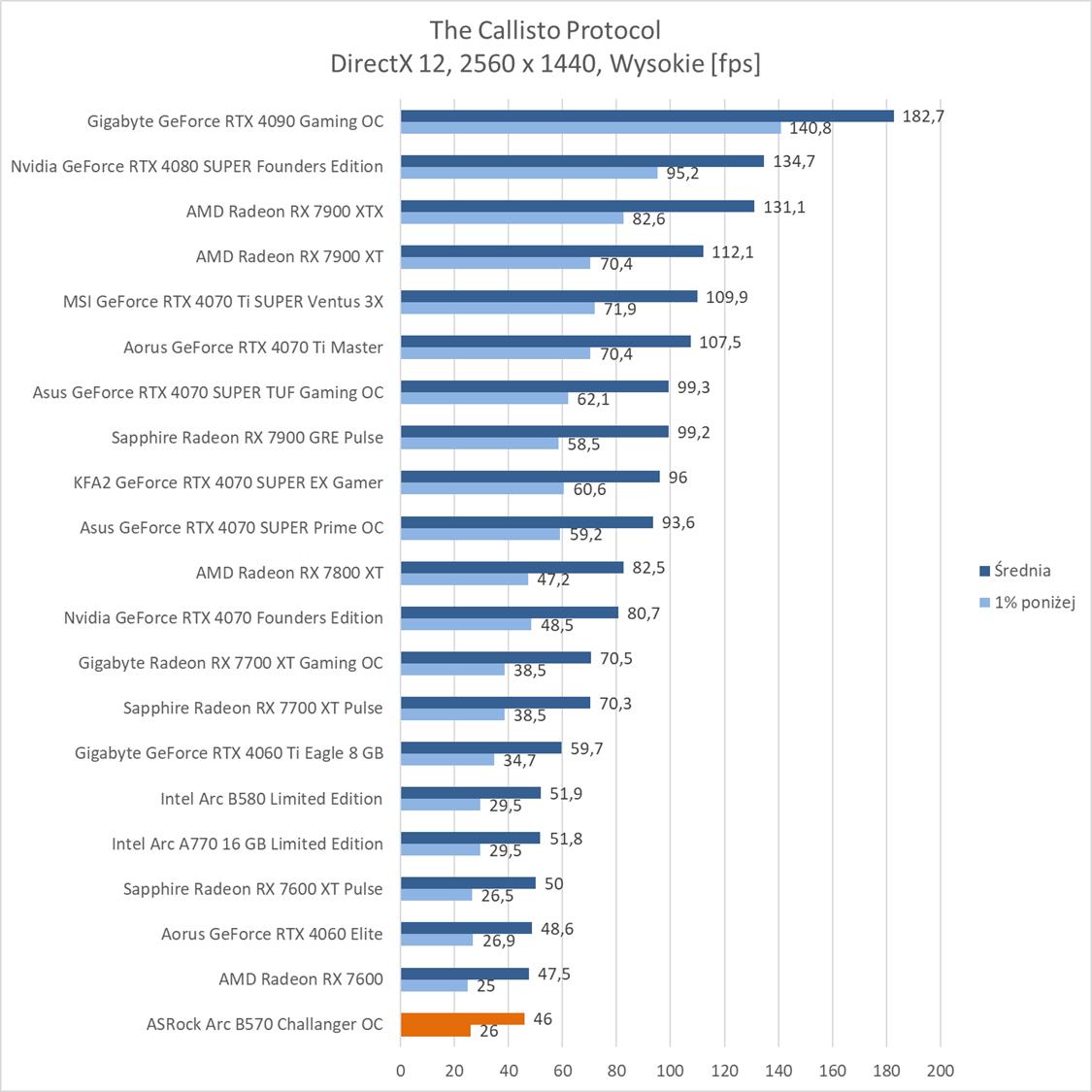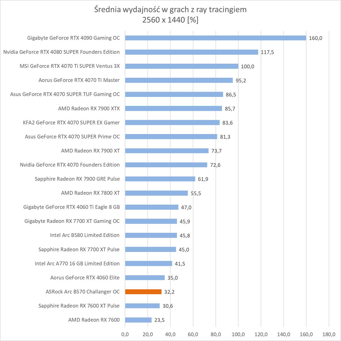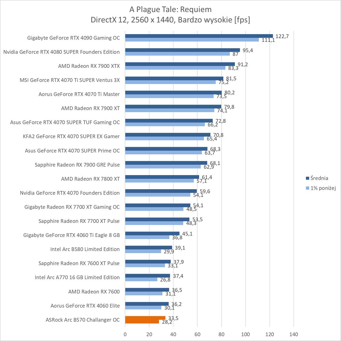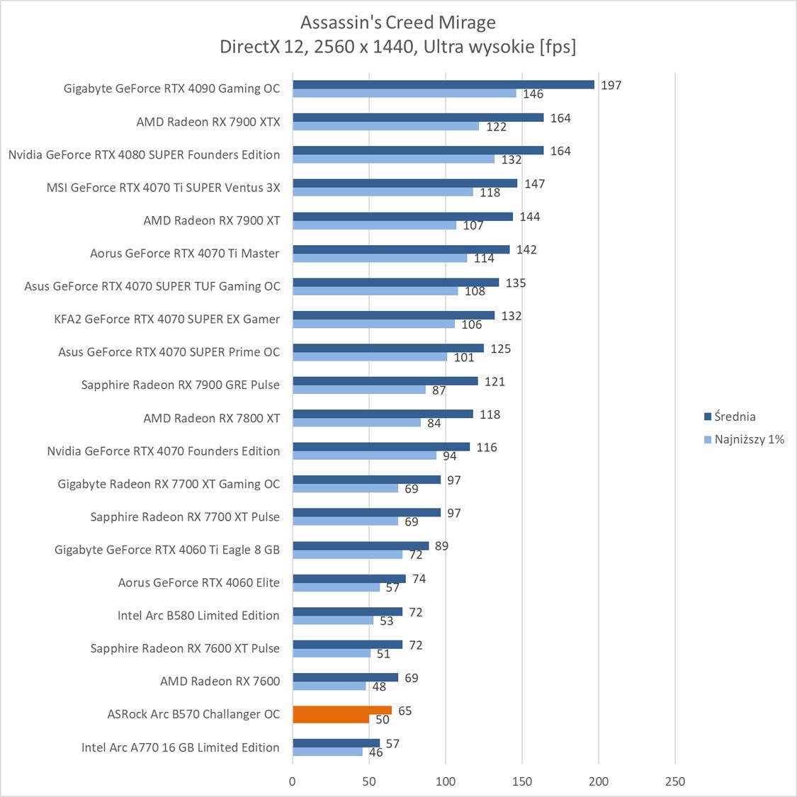 W 2560 x 1440 jest już trochę lepiej – grafika wypada najsłabiej w 4 grach. ASRock Arc B570 Challanger OC jedynie też w Assassin’s Creed notuje powyżej 60 fps.