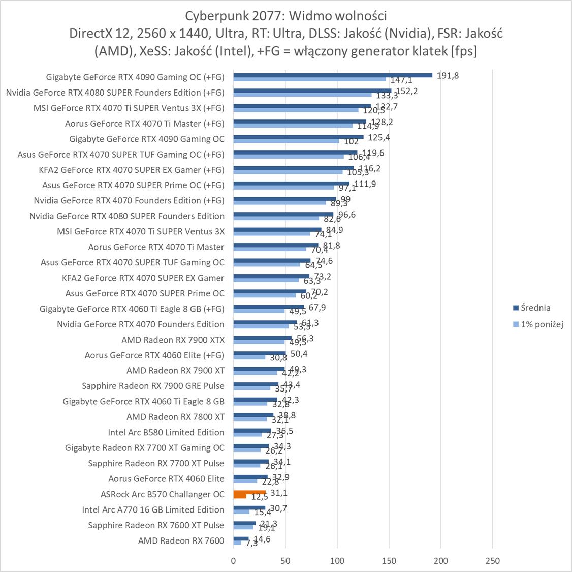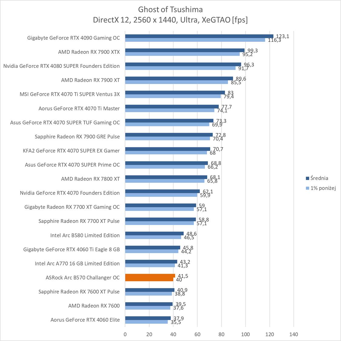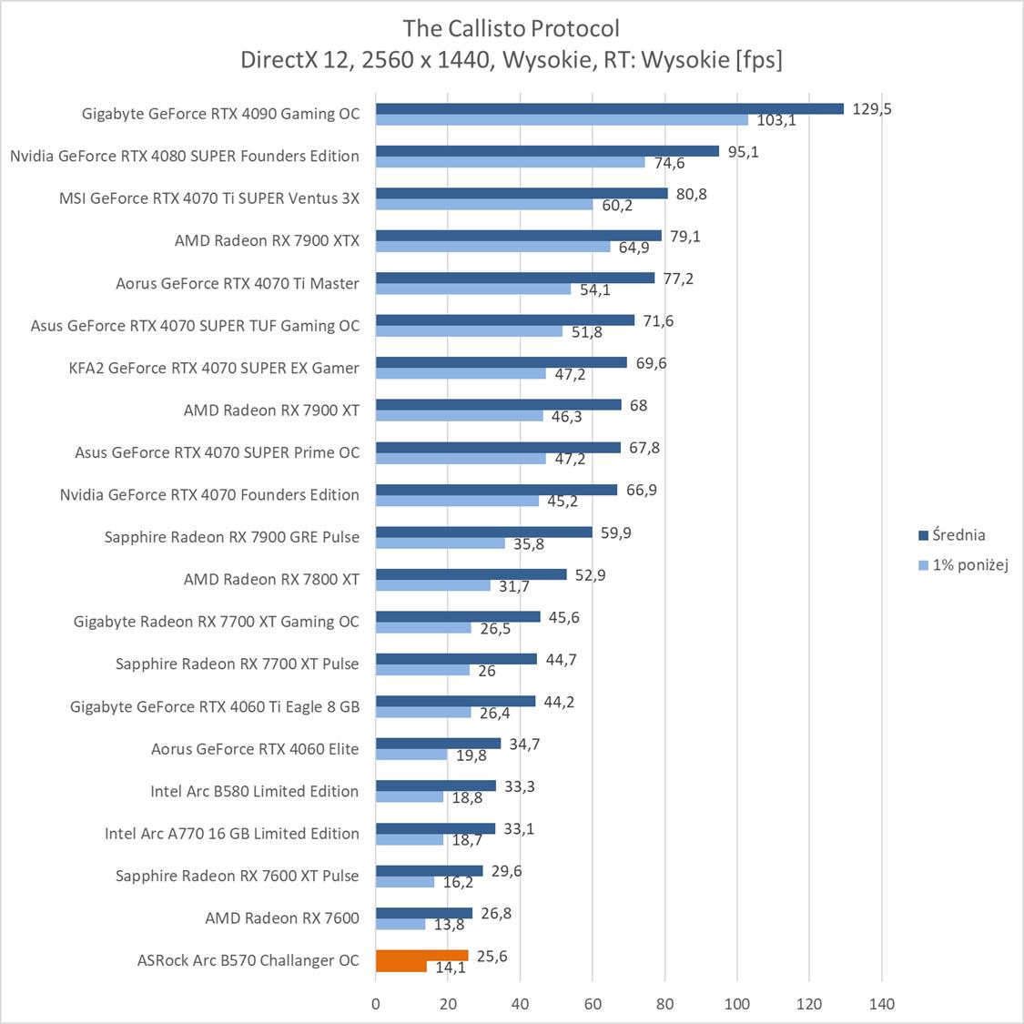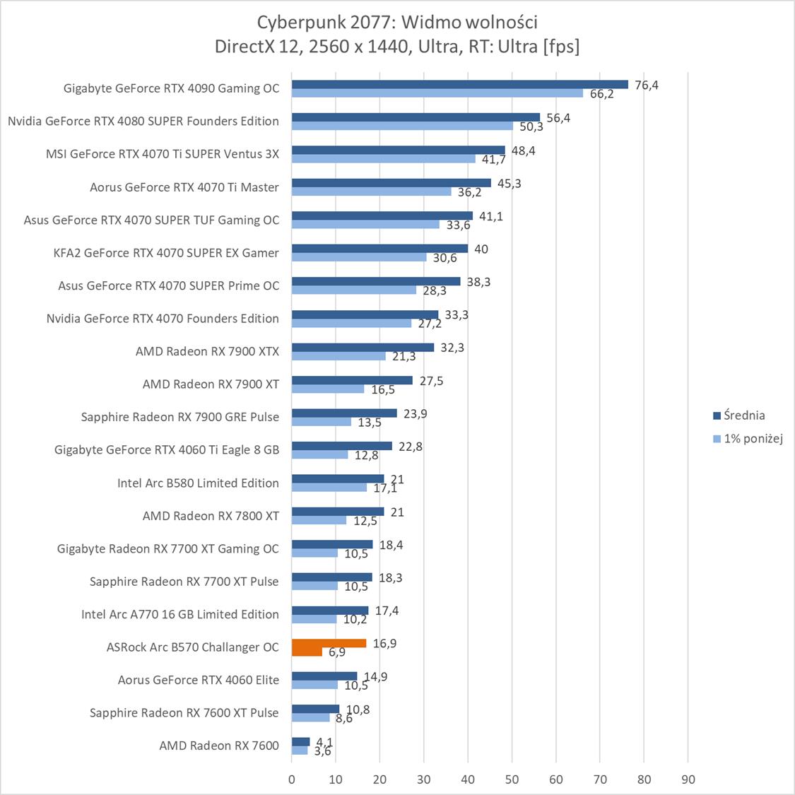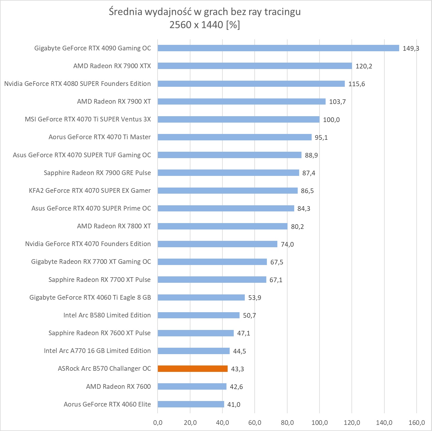W 2560 x 1440 jest już trochę lepiej – grafika wypada najsłabiej w 4 grach. ASRock Arc B570 Challanger OC jedynie też w Assassin’s Creed notuje powyżej 60 fps.