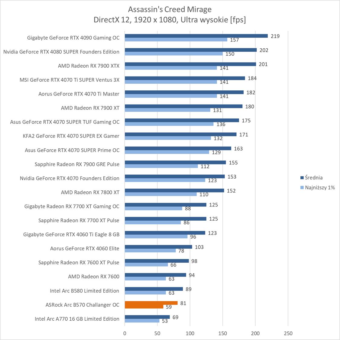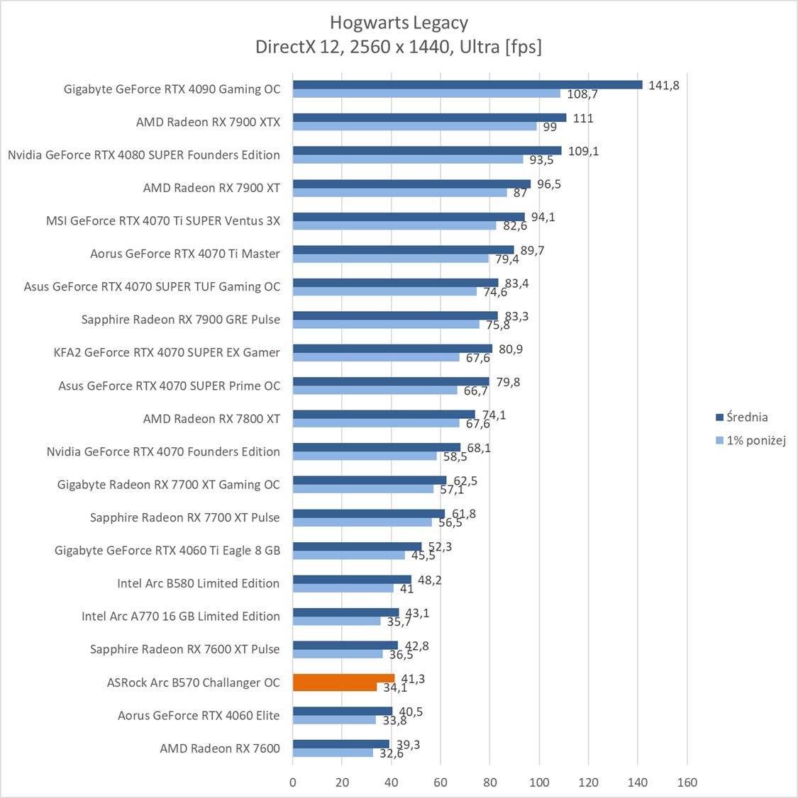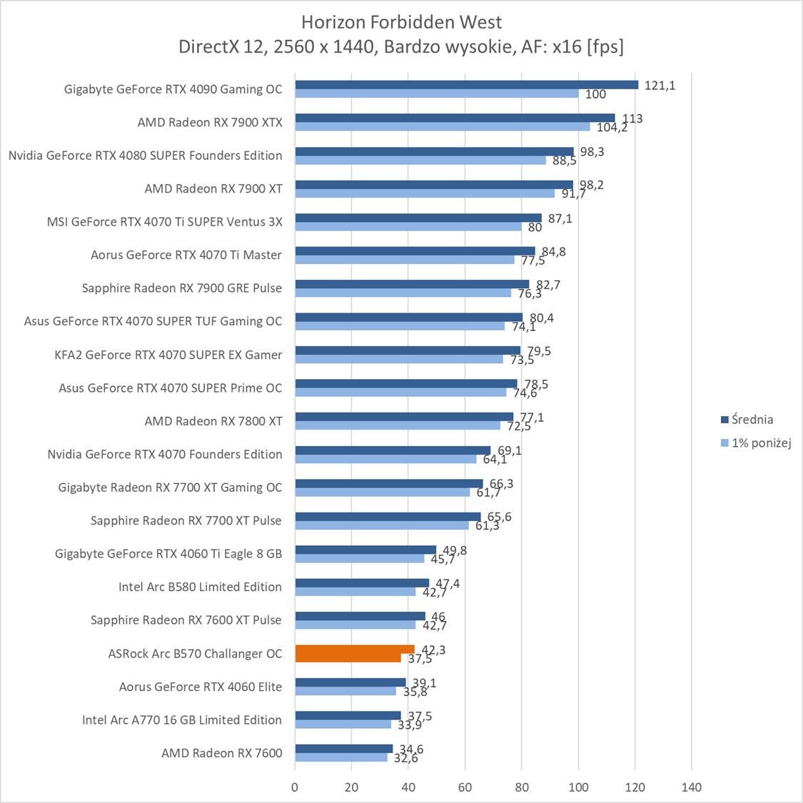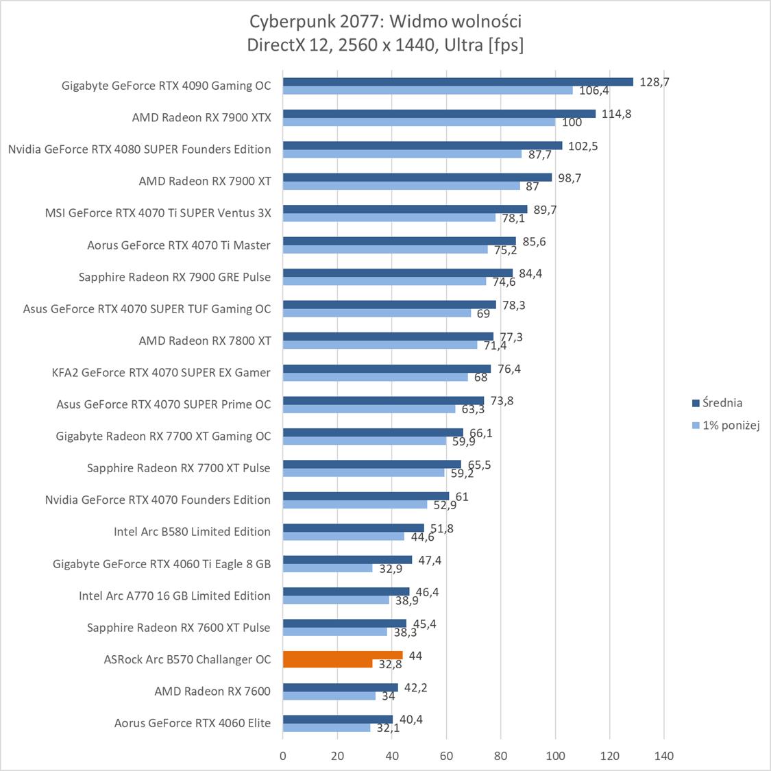 W 2560 x 1440 jest już trochę lepiej – grafika wypada najsłabiej w 4 grach. ASRock Arc B570 Challanger OC jedynie też w Assassin’s Creed notuje powyżej 60 fps.