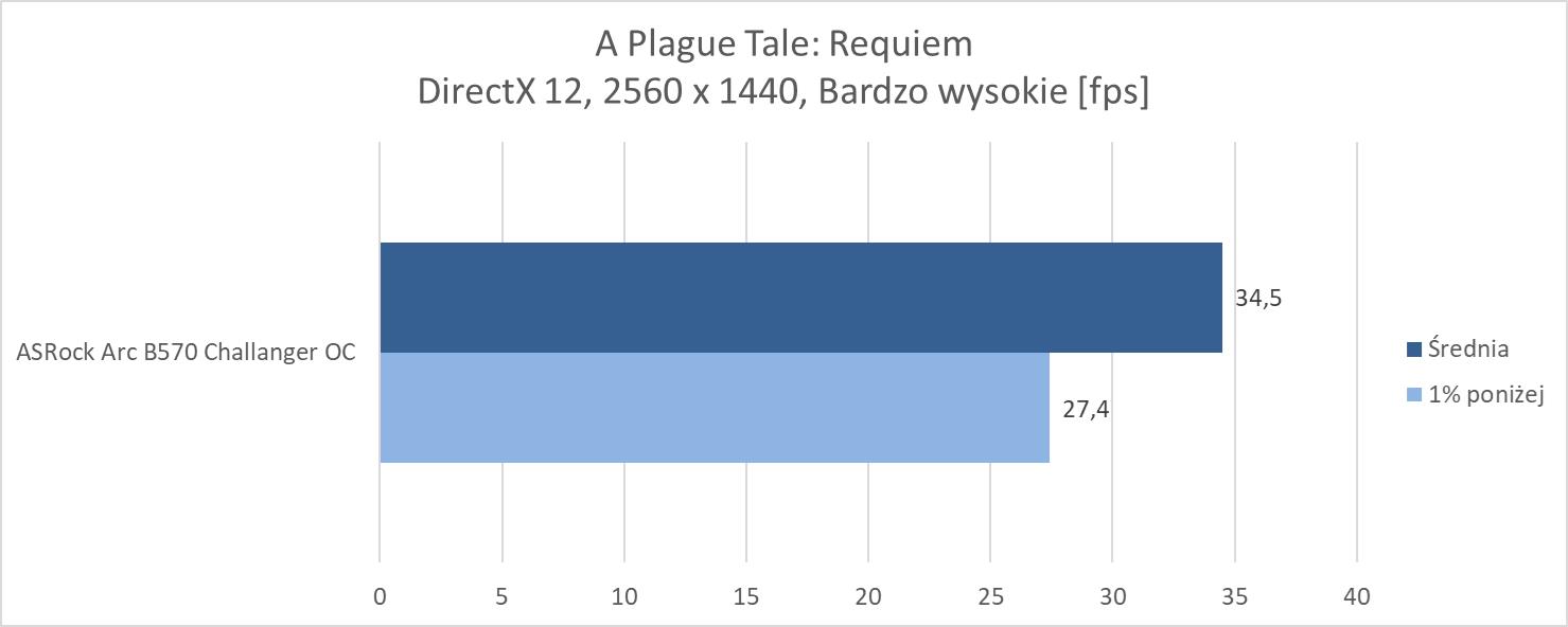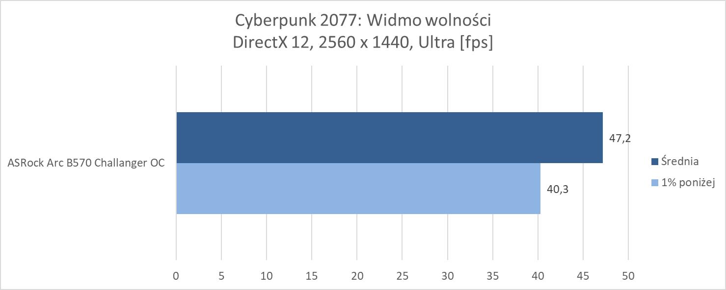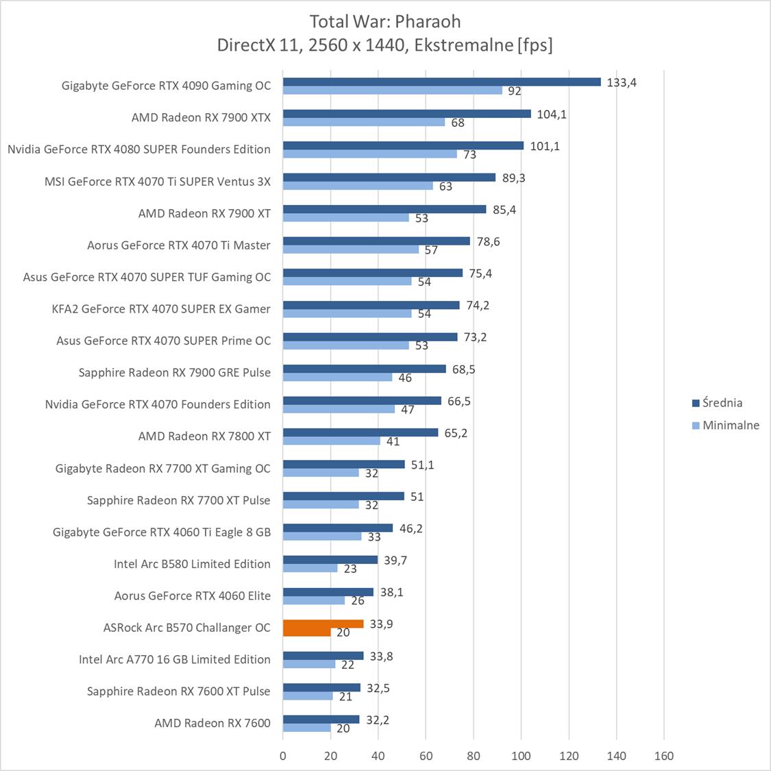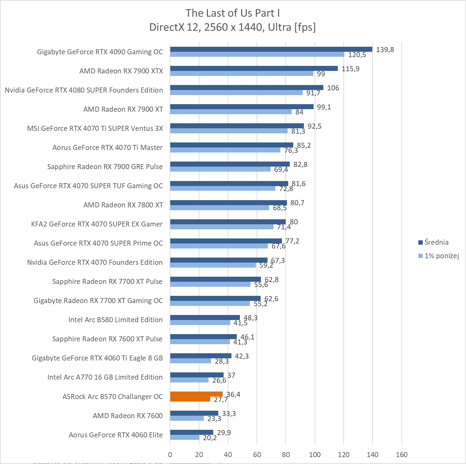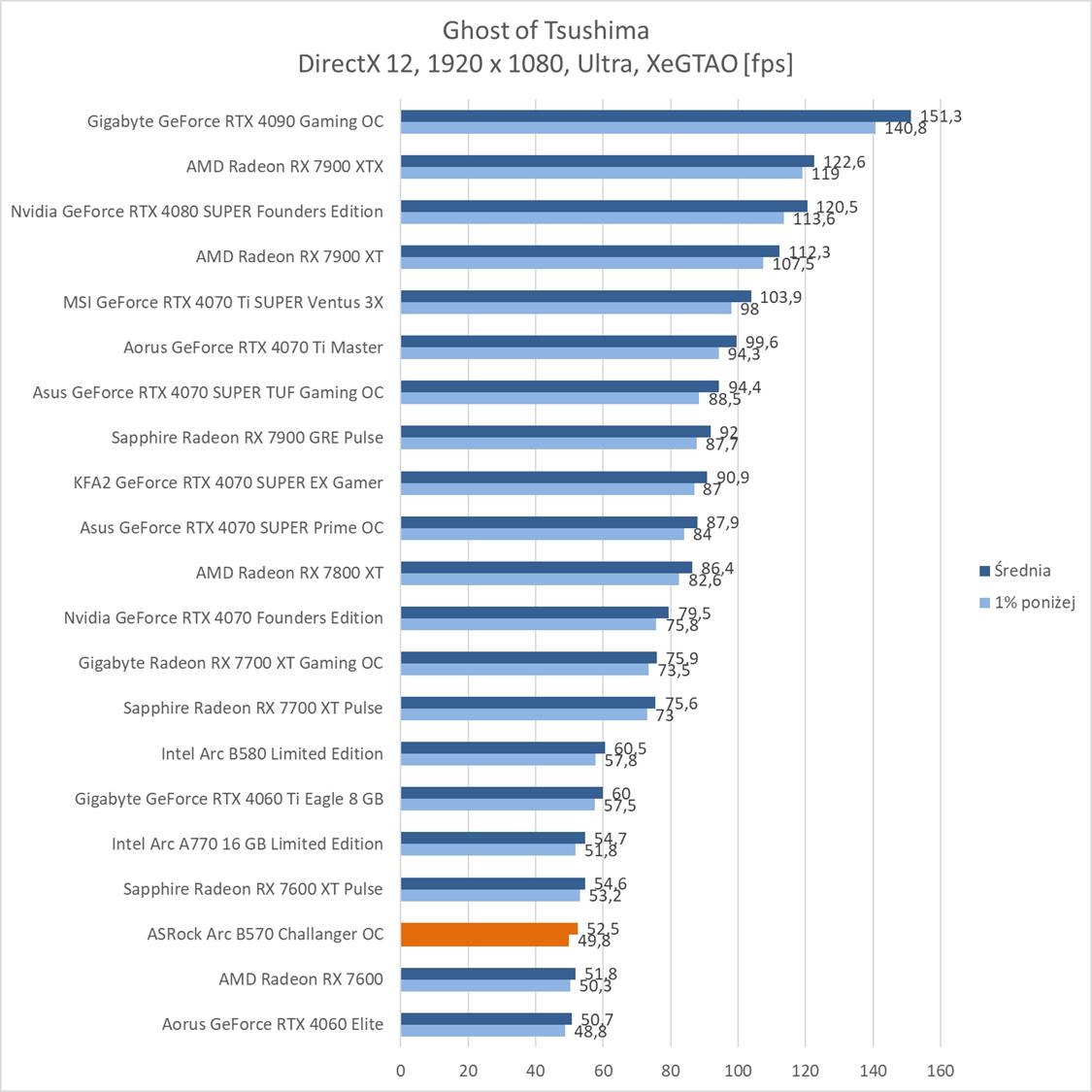 W 2560 x 1440 jest już trochę lepiej – grafika wypada najsłabiej w 4 grach. ASRock Arc B570 Challanger OC jedynie też w Assassin’s Creed notuje powyżej 60 fps.