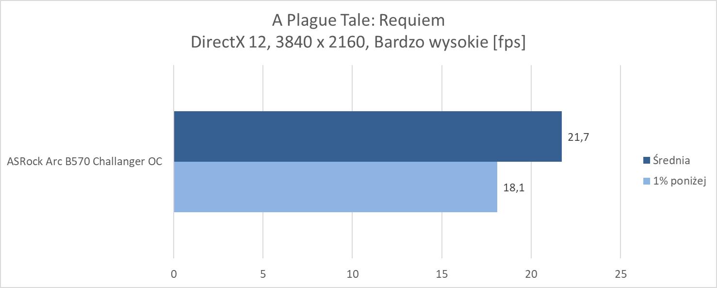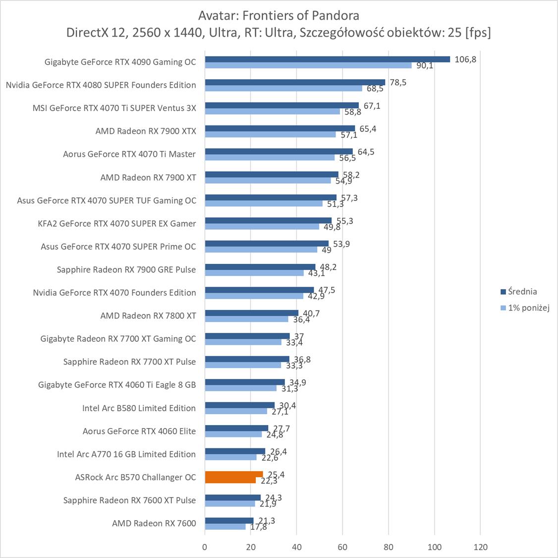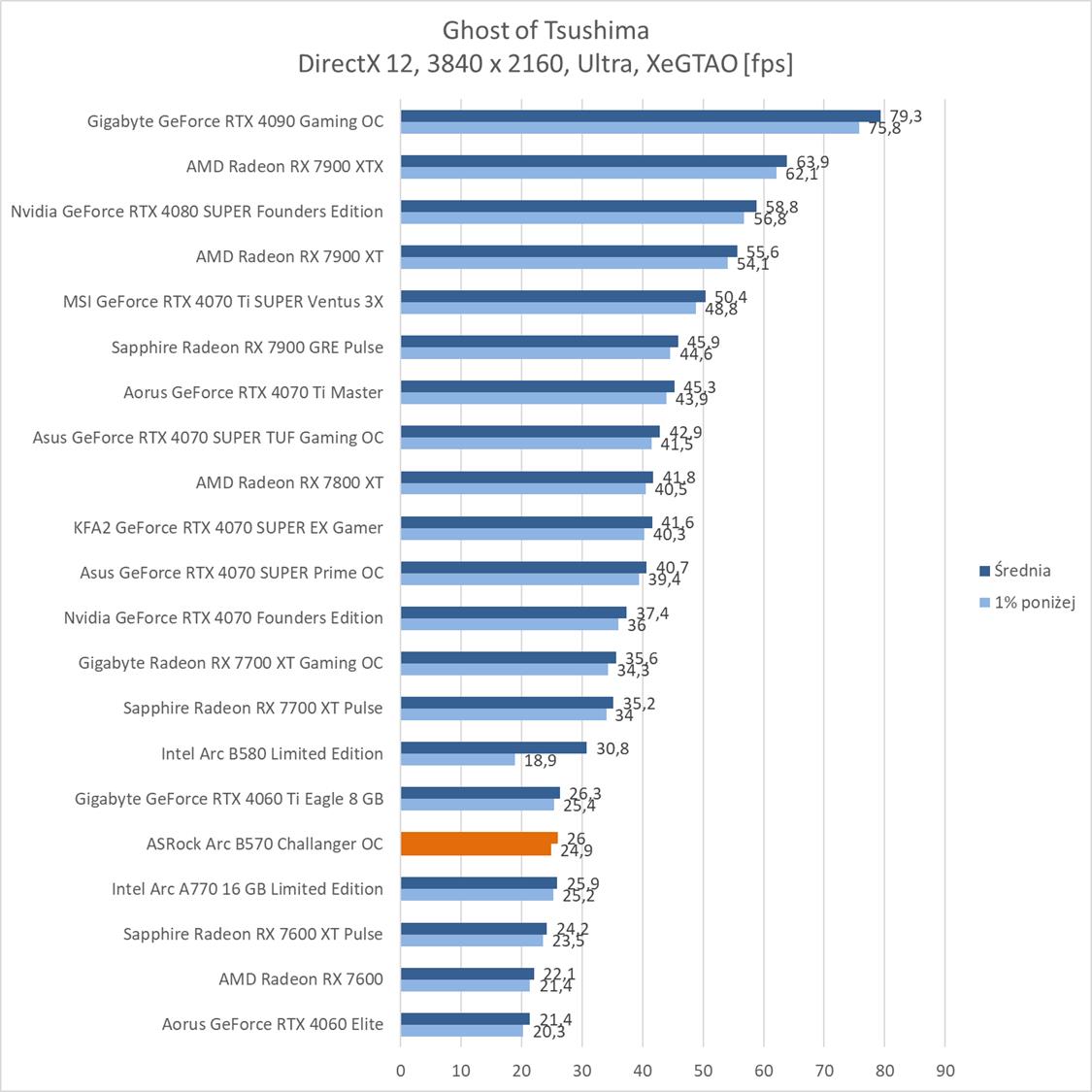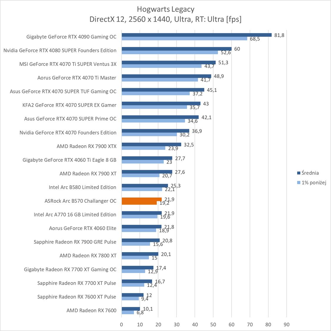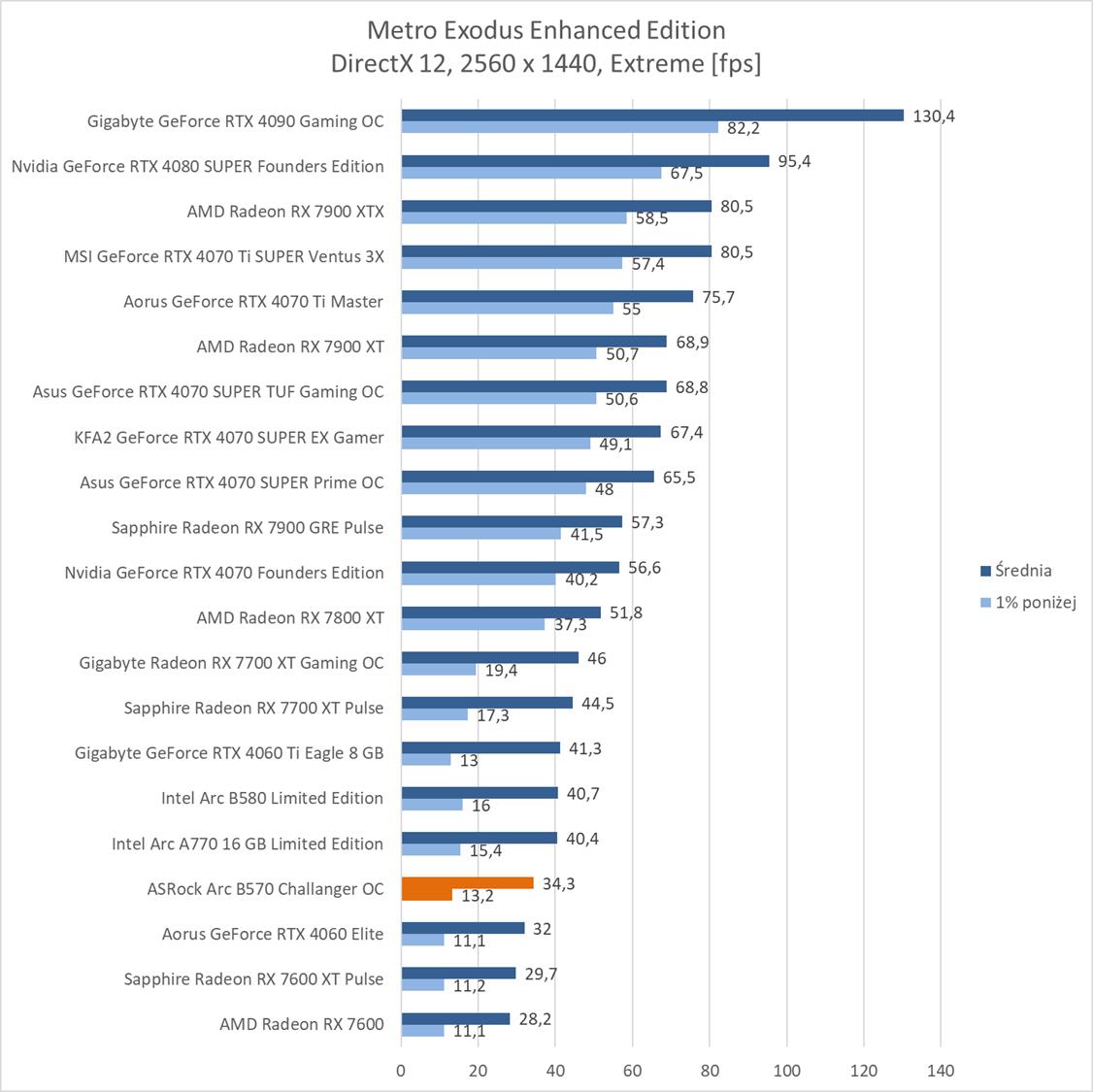 W 2560 x 1440 jest już trochę lepiej – grafika wypada najsłabiej w 4 grach. ASRock Arc B570 Challanger OC jedynie też w Assassin’s Creed notuje powyżej 60 fps.