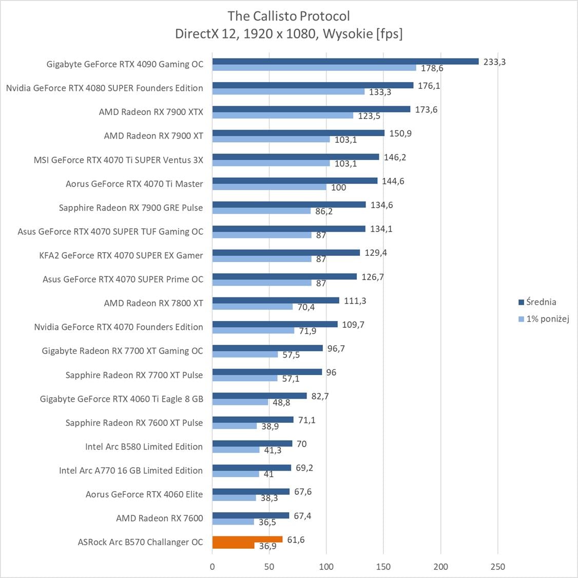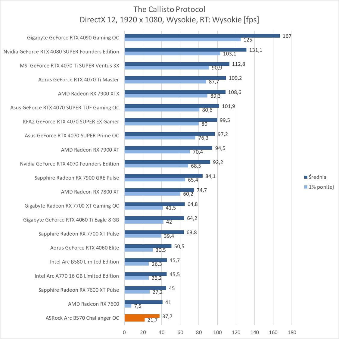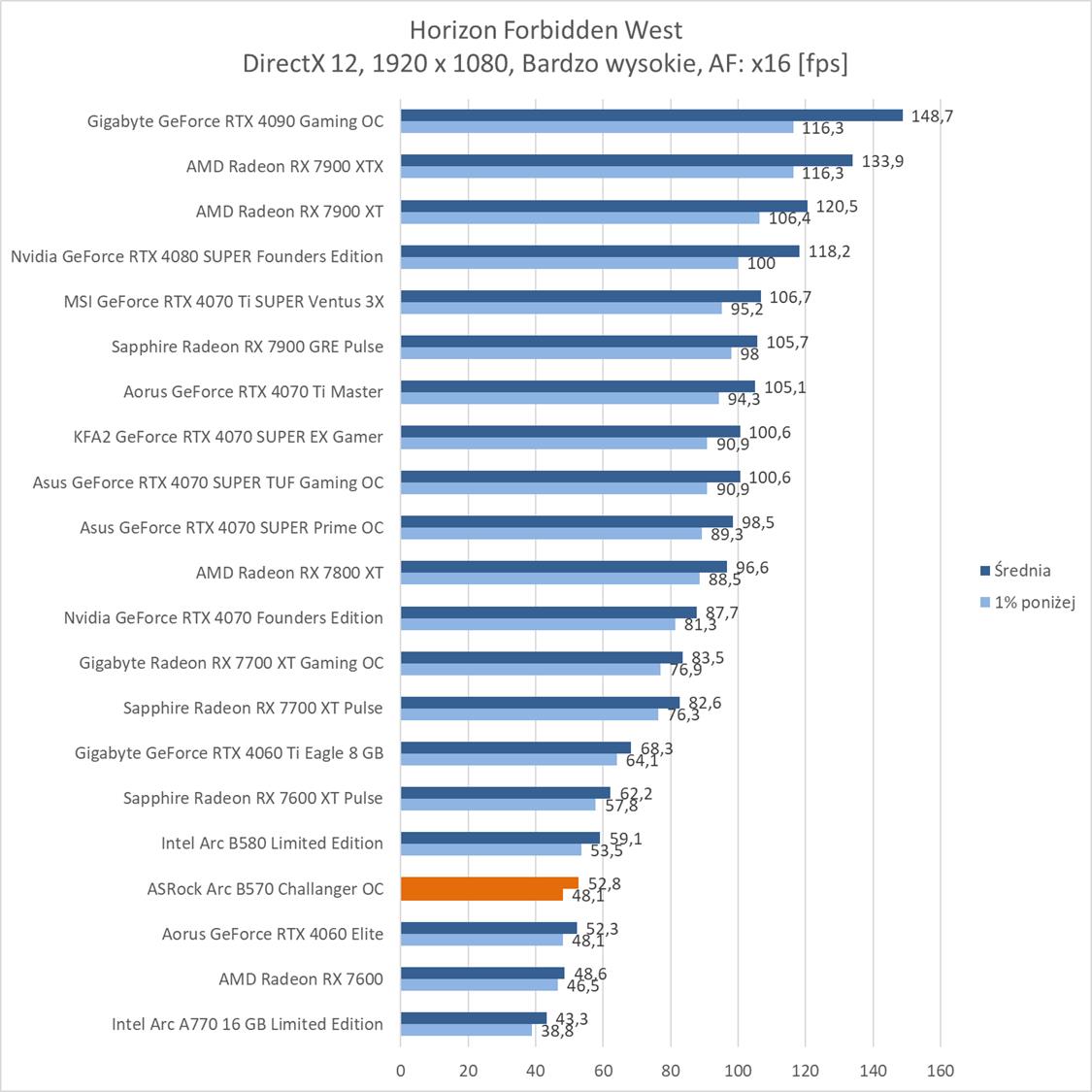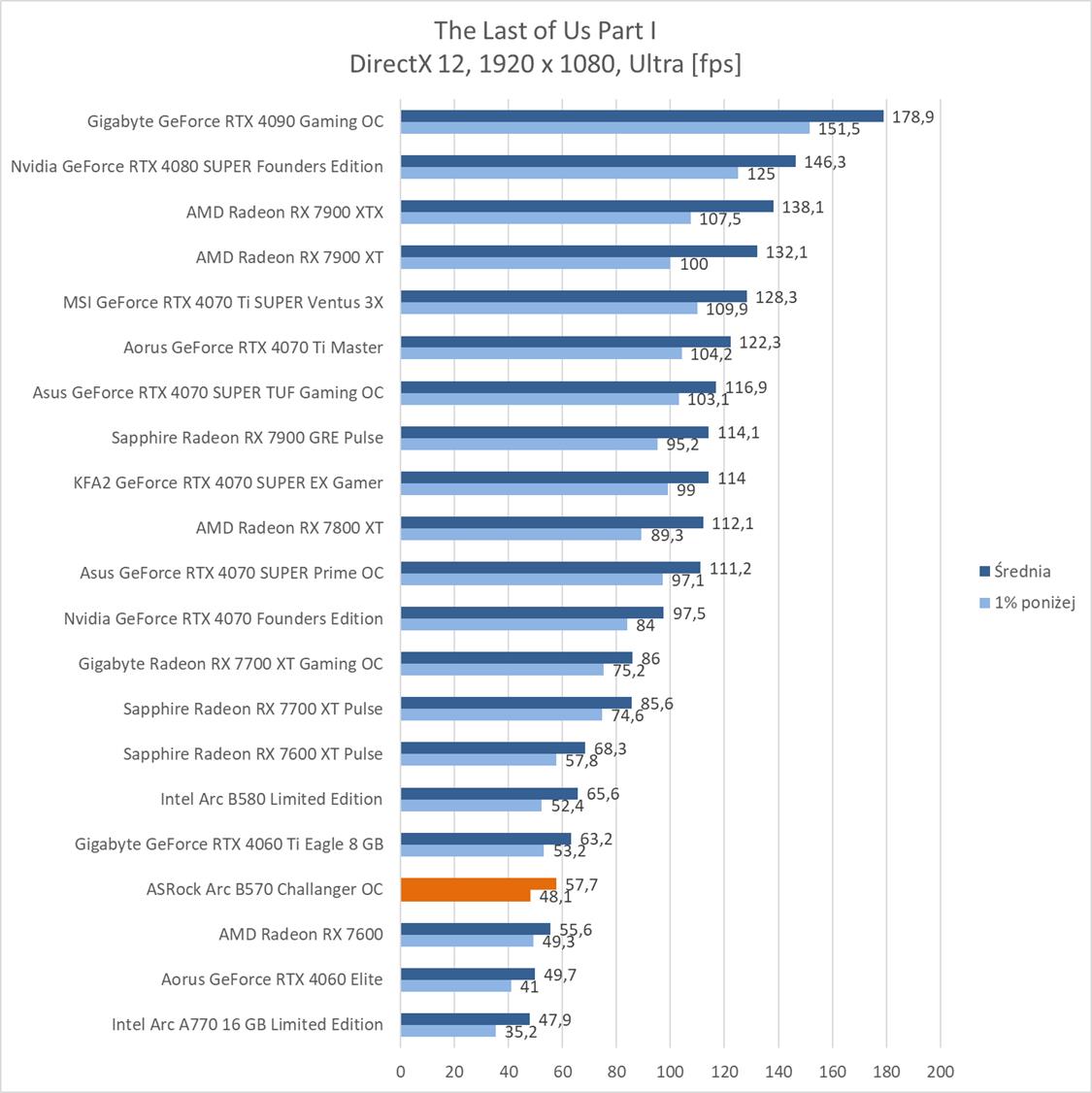 Wyniki są różne. W 5 grach mamy najsłabszą wydajność spośród wszystkich kart, w 3 pokonuje RX 7600, w jednej A770, i w jednej RTX 4060. W części gier strata do RX 7600 nie jest też duża, ale jak zobaczycie po średniej, wypada słabiej od konkurenta. Mamy też tylko 3 gry z wynikiem ponad 60 fps.