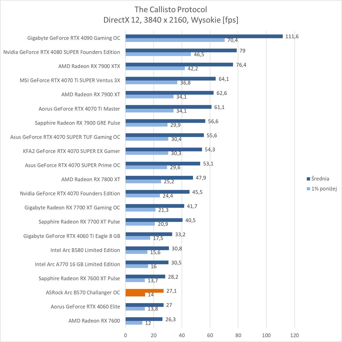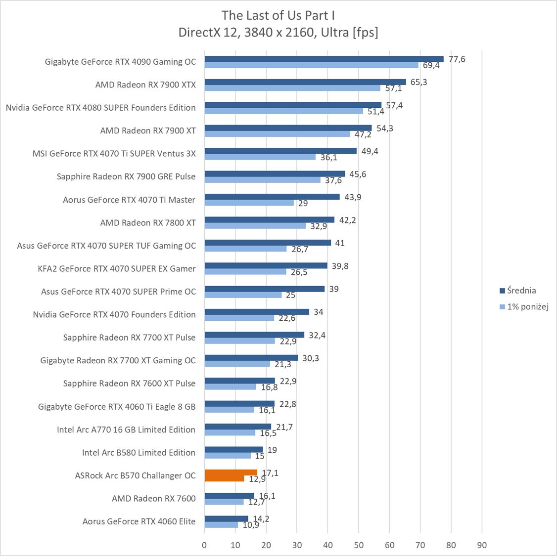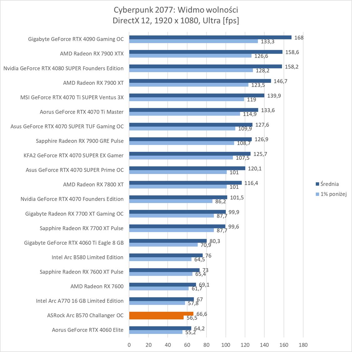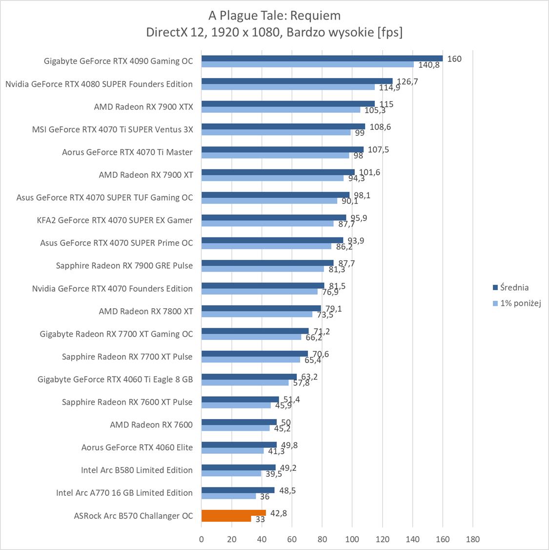 Wyniki są różne. W 5 grach mamy najsłabszą wydajność spośród wszystkich kart, w 3 pokonuje RX 7600, w jednej A770, i w jednej RTX 4060. W części gier strata do RX 7600 nie jest też duża, ale jak zobaczycie po średniej, wypada słabiej od konkurenta. Mamy też tylko 3 gry z wynikiem ponad 60 fps.