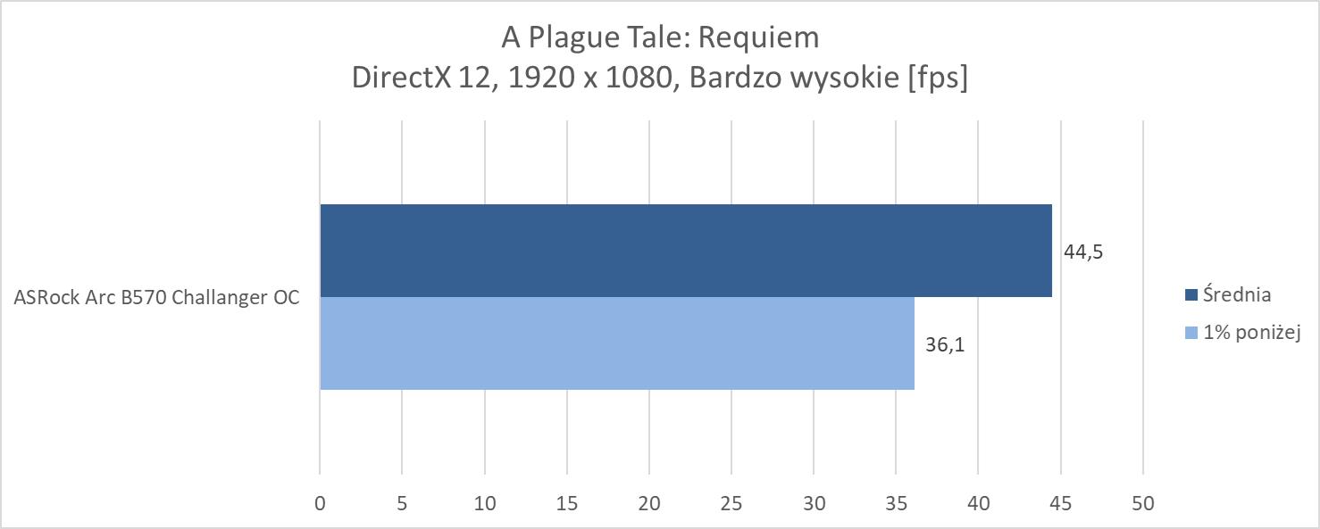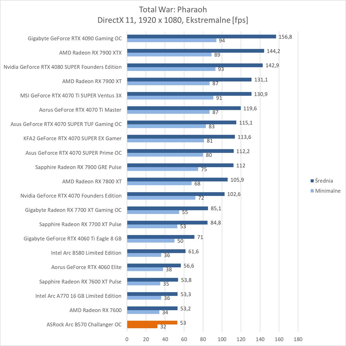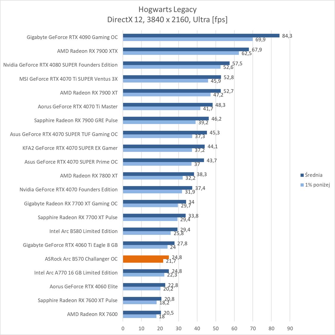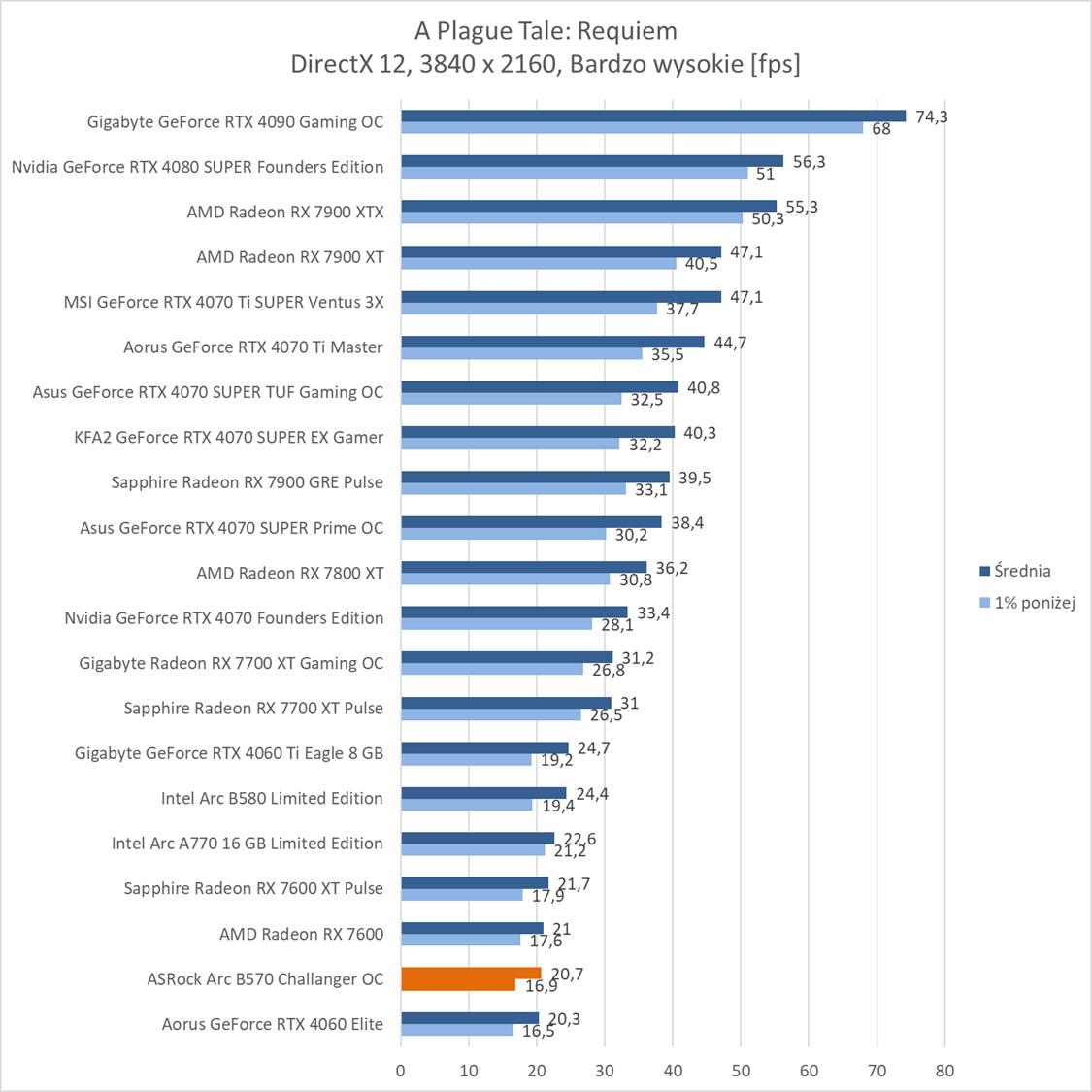 Wyniki są różne. W 5 grach mamy najsłabszą wydajność spośród wszystkich kart, w 3 pokonuje RX 7600, w jednej A770, i w jednej RTX 4060. W części gier strata do RX 7600 nie jest też duża, ale jak zobaczycie po średniej, wypada słabiej od konkurenta. Mamy też tylko 3 gry z wynikiem ponad 60 fps.