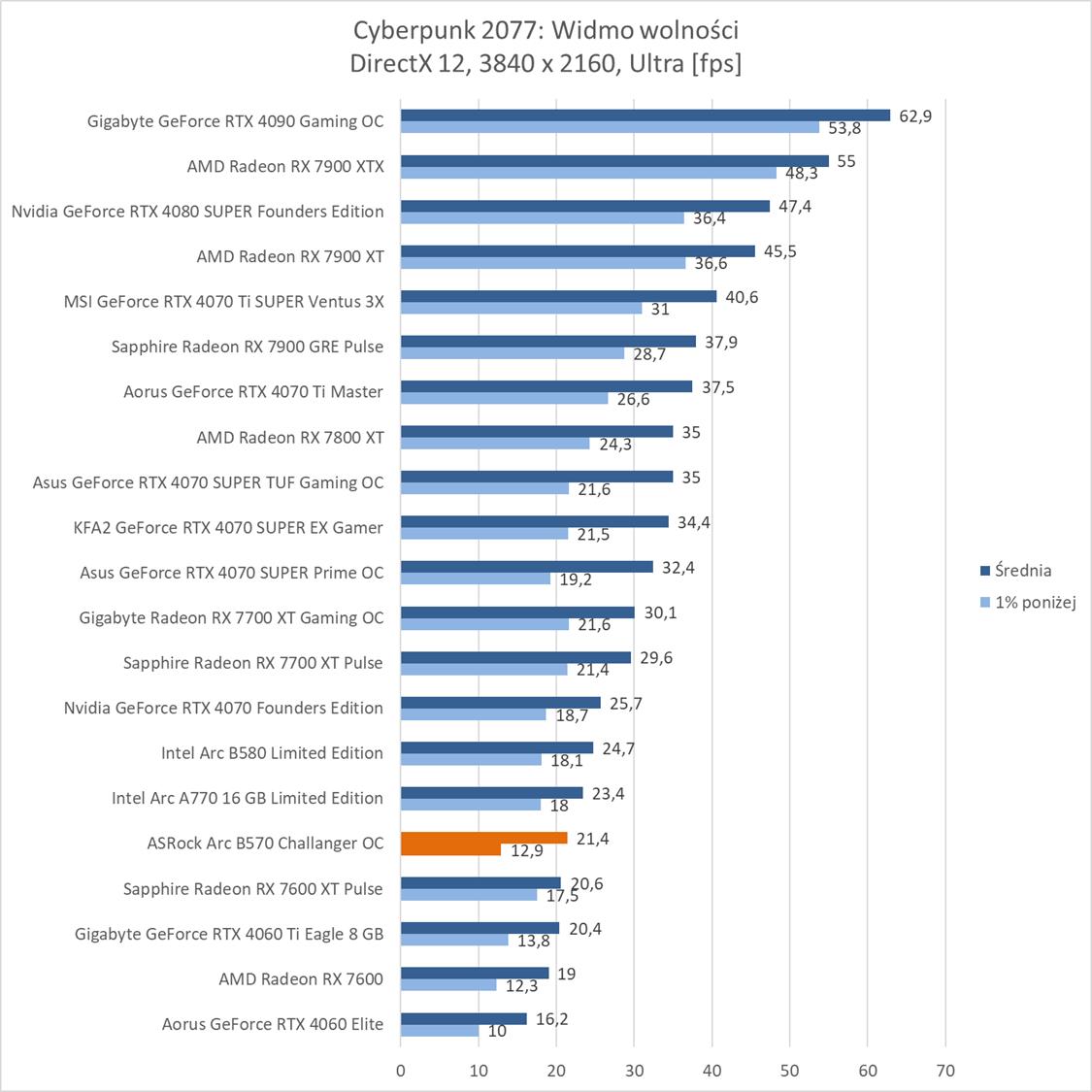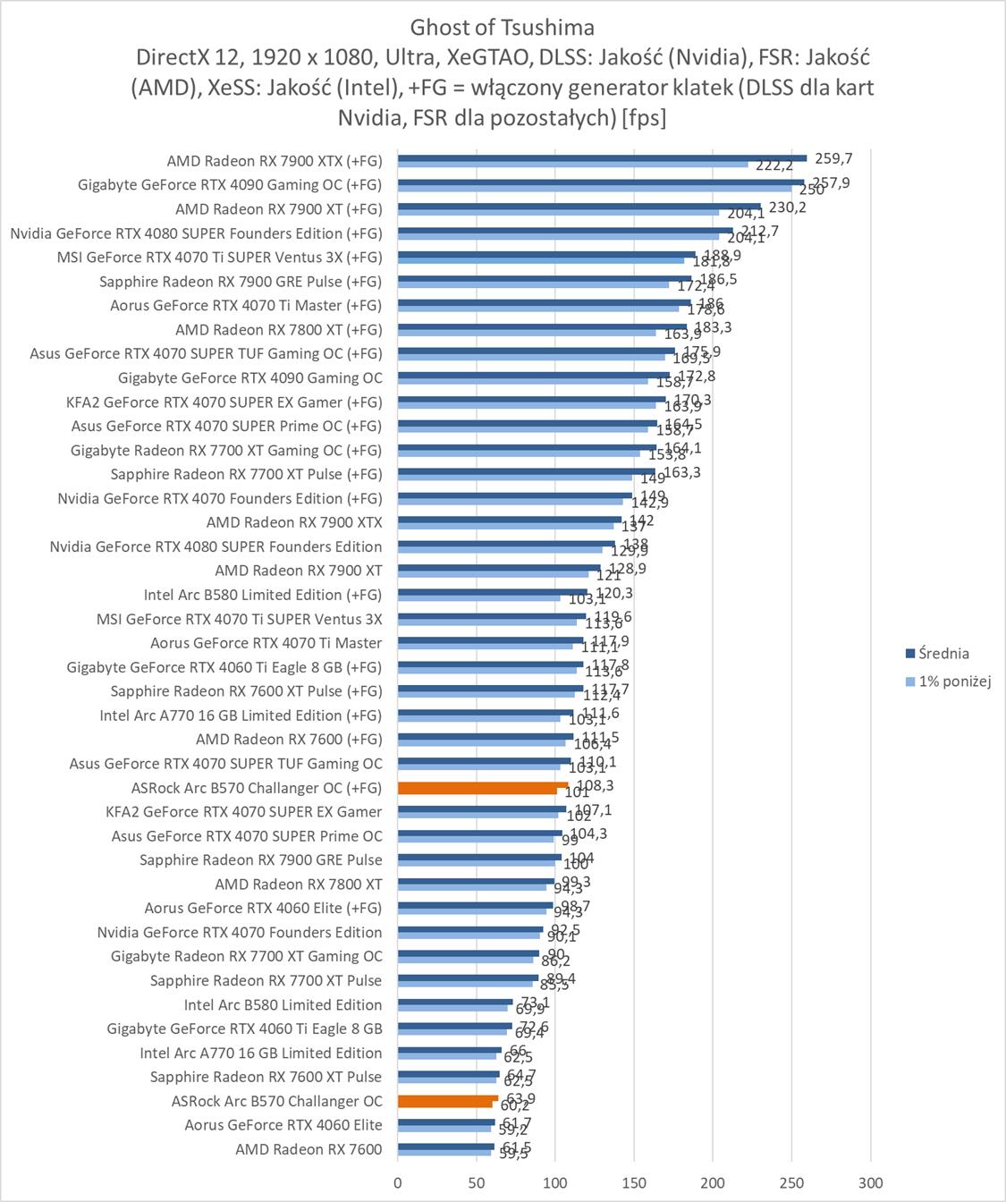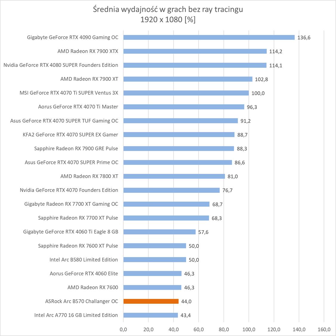 Intel Arc B570 wyceniony został na 219 USD, co daje ok. 905 zł, a po doliczeniu VATu ok. 1113 zł. Natomiast testowana wersja ASRock Arc B570 Challanger OC jest dostępna w sklepach za ok. 1250 zł. Jest to więc bezpośrednia konkurencja dla RX 7600, którego najtańsze modele znajdziecie za ok. 1200 zł. Dodamy też, że najtańsze wersje RTX 4060 zaczynają się od ok. 1370 zł. Gdyby cena była taka jak sugerowana, a nawet bliższa 1000 zł to było by całkiem fajnie, ale w cenie ok. 1250 zł zakup karty trochę traci na sensie.