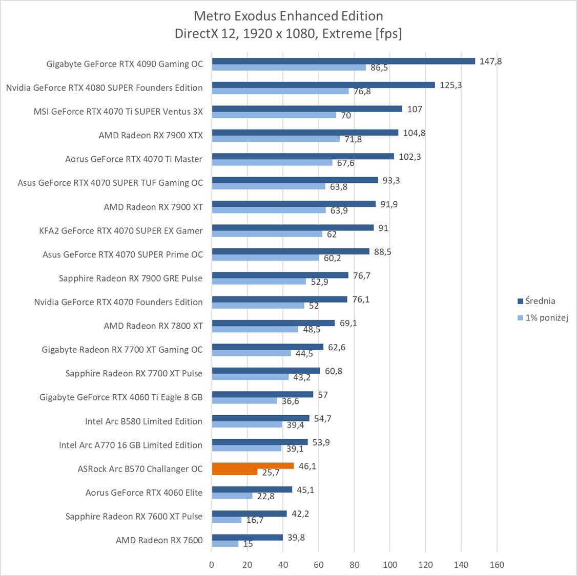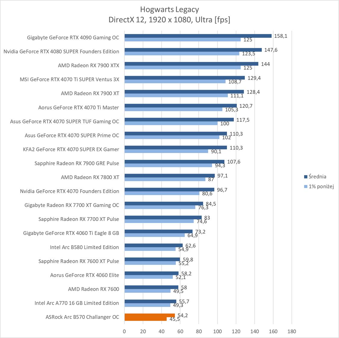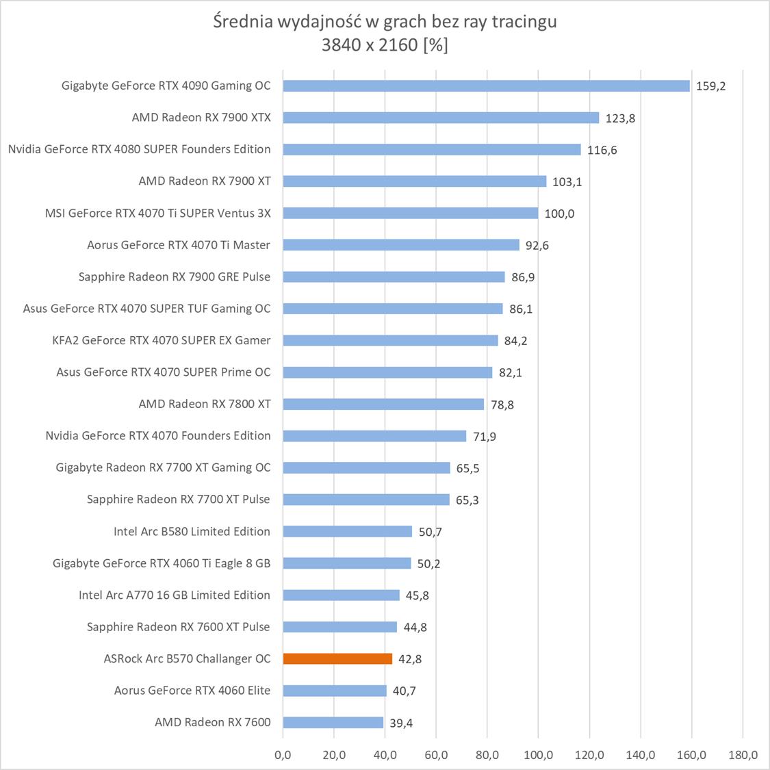 Intel Arc B570 wyceniony został na 219 USD, co daje ok. 905 zł, a po doliczeniu VATu ok. 1113 zł. Natomiast testowana wersja ASRock Arc B570 Challanger OC jest dostępna w sklepach za ok. 1250 zł. Jest to więc bezpośrednia konkurencja dla RX 7600, którego najtańsze modele znajdziecie za ok. 1200 zł. Dodamy też, że najtańsze wersje RTX 4060 zaczynają się od ok. 1370 zł. Gdyby cena była taka jak sugerowana, a nawet bliższa 1000 zł to było by całkiem fajnie, ale w cenie ok. 1250 zł zakup karty trochę traci na sensie.