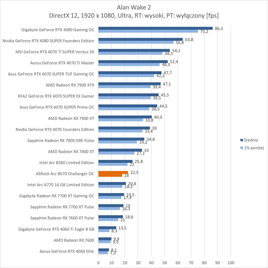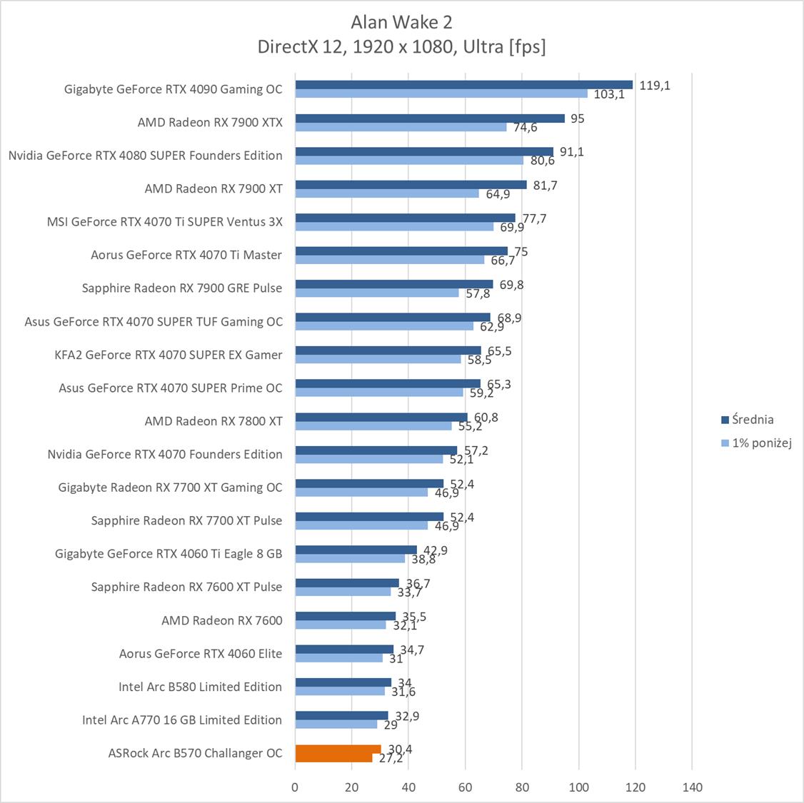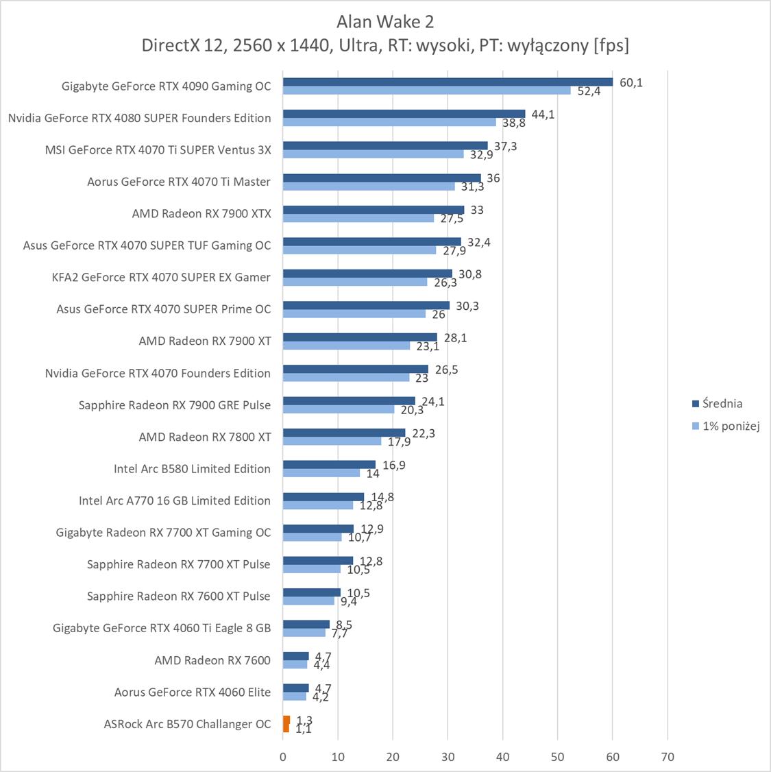 W grach z RT jest lepiej i ASRock Arc B570 Challanger OC zdecydowanie pokonuje RX 7600, a w 1920 x 1080 nawet średnio RTX 4060. Nie ma jednak zaskoczenia, bowiem Radeony zawsze wypadały w tych testach słabo. W 2560 x 1440 gry są niegrywalne, a takiego Alana Wake 2 nie ma nawet co odpalać. Trzeba też przyznać, że nawet w 1920 x 1080 od razu możecie odpalać upscaling, który jest niezbędny do płynnej rozgrywki.