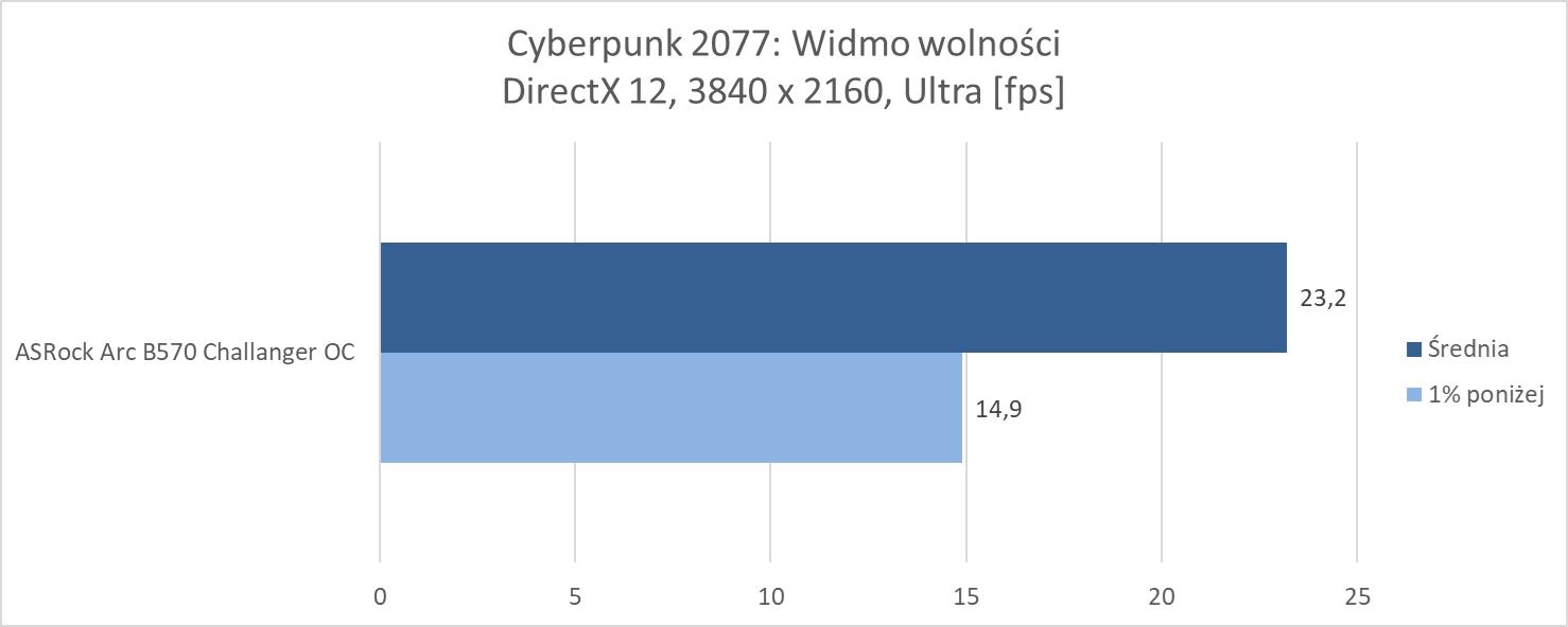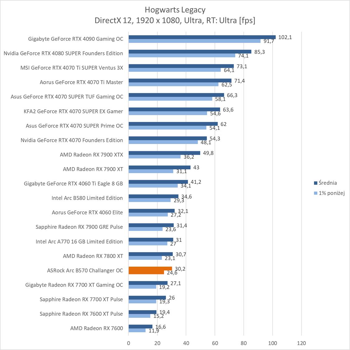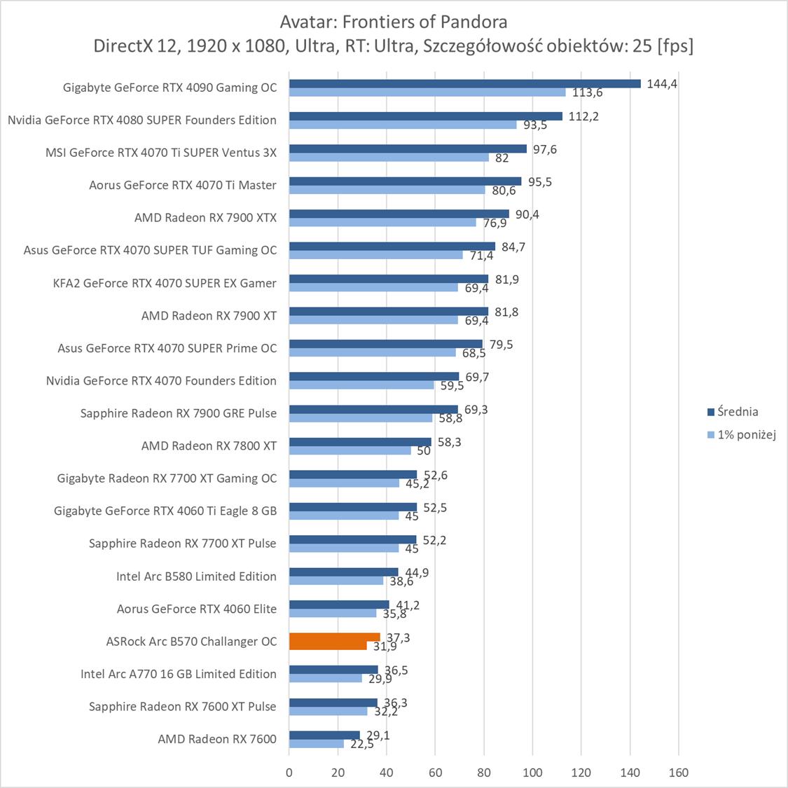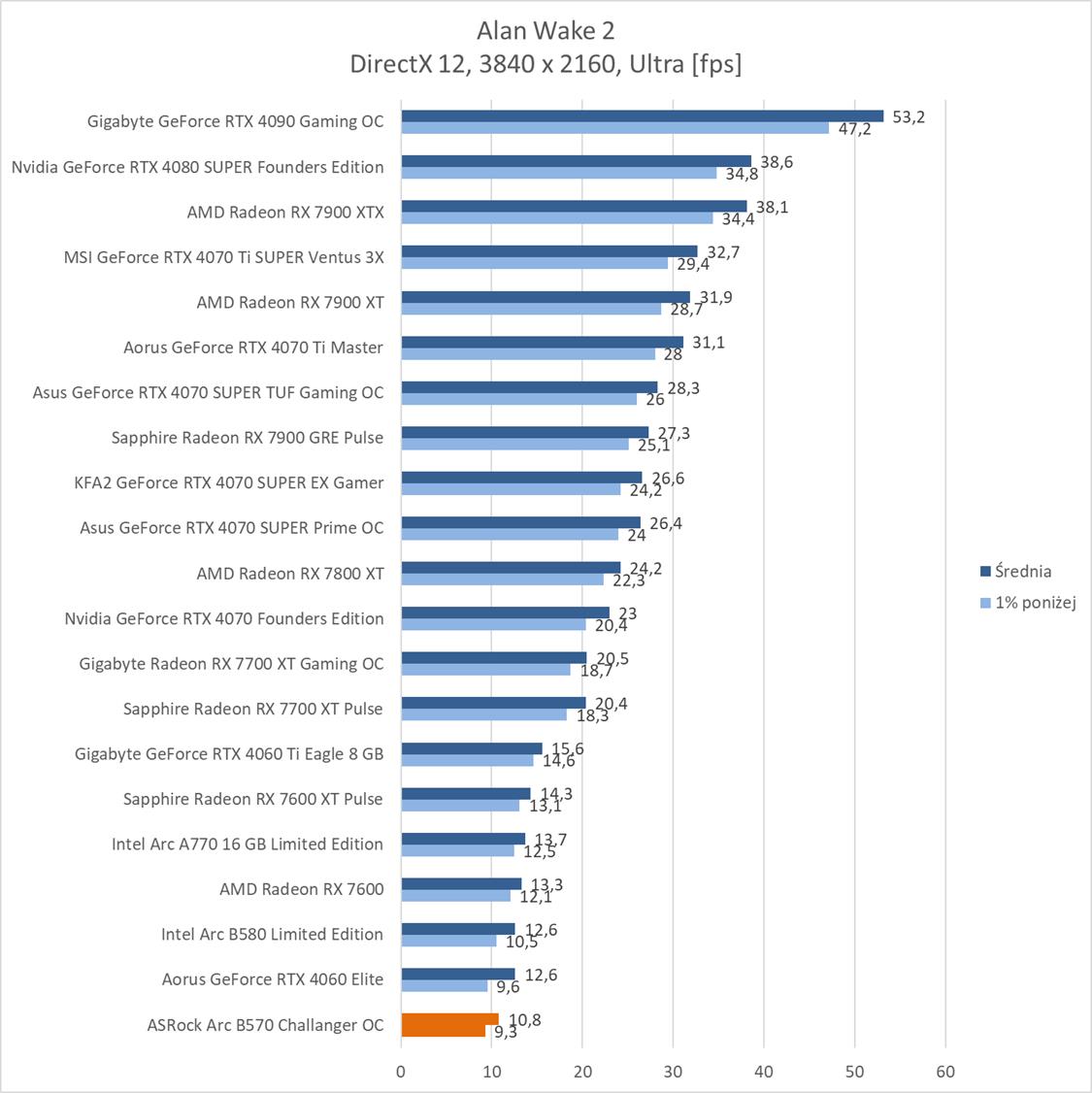 W grach z RT jest lepiej i ASRock Arc B570 Challanger OC zdecydowanie pokonuje RX 7600, a w 1920 x 1080 nawet średnio RTX 4060. Nie ma jednak zaskoczenia, bowiem Radeony zawsze wypadały w tych testach słabo. W 2560 x 1440 gry są niegrywalne, a takiego Alana Wake 2 nie ma nawet co odpalać. Trzeba też przyznać, że nawet w 1920 x 1080 od razu możecie odpalać upscaling, który jest niezbędny do płynnej rozgrywki.