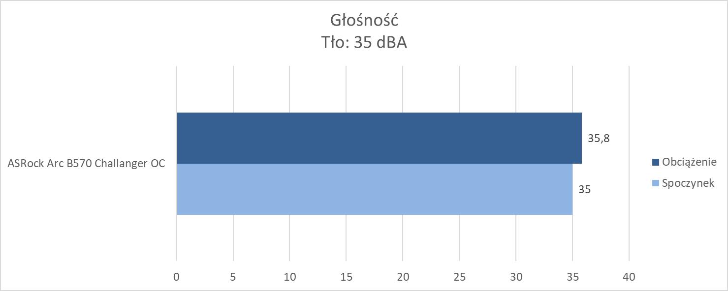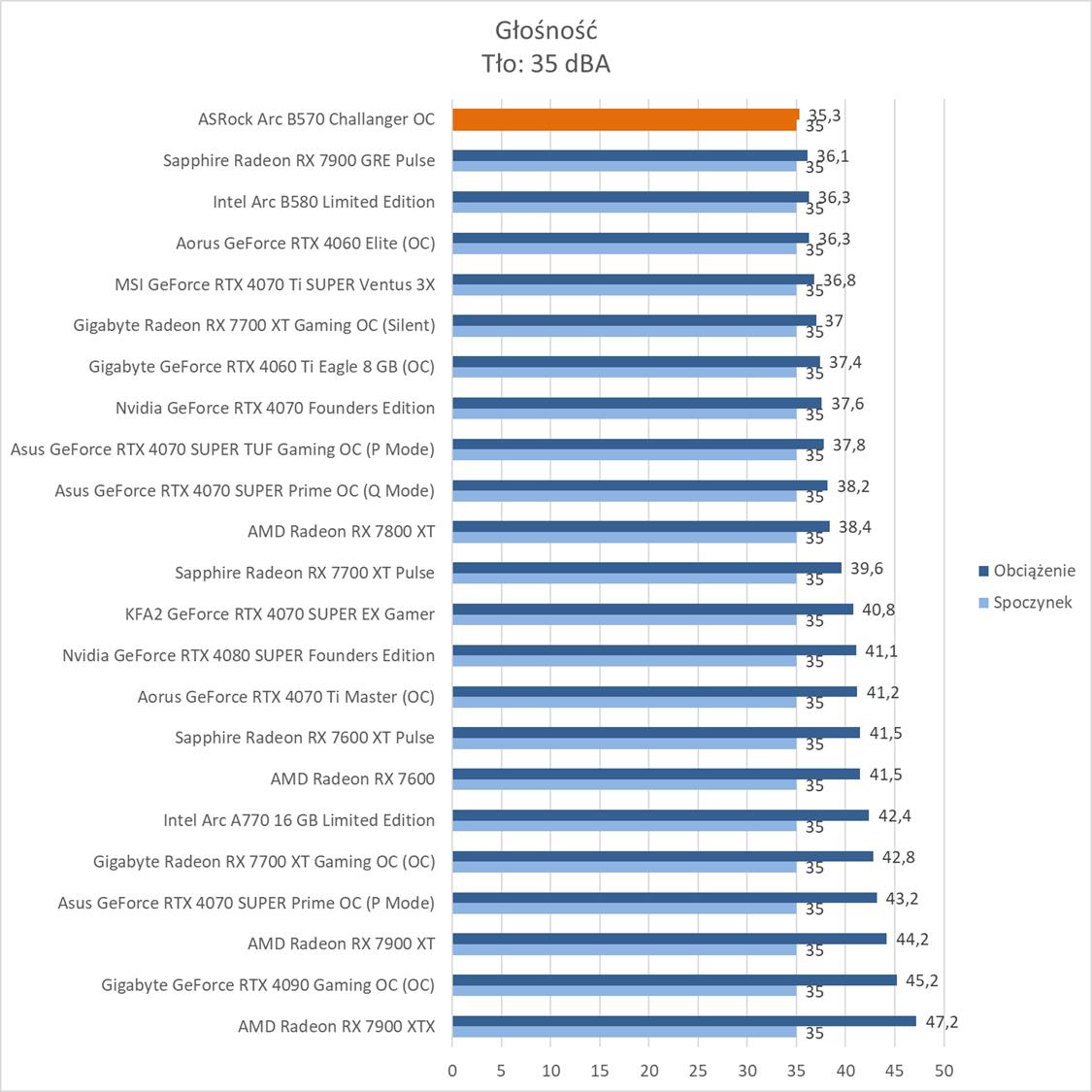 W spoczynku ASRock Arc B570 Challanger OC działa pasywnie. Pod obciążeniem wentylatory już się kręcą, ale grafika pozostaje niesłyszalna. Jest wręcz najcichszą spośród wszystkich obecnych na wykresach.