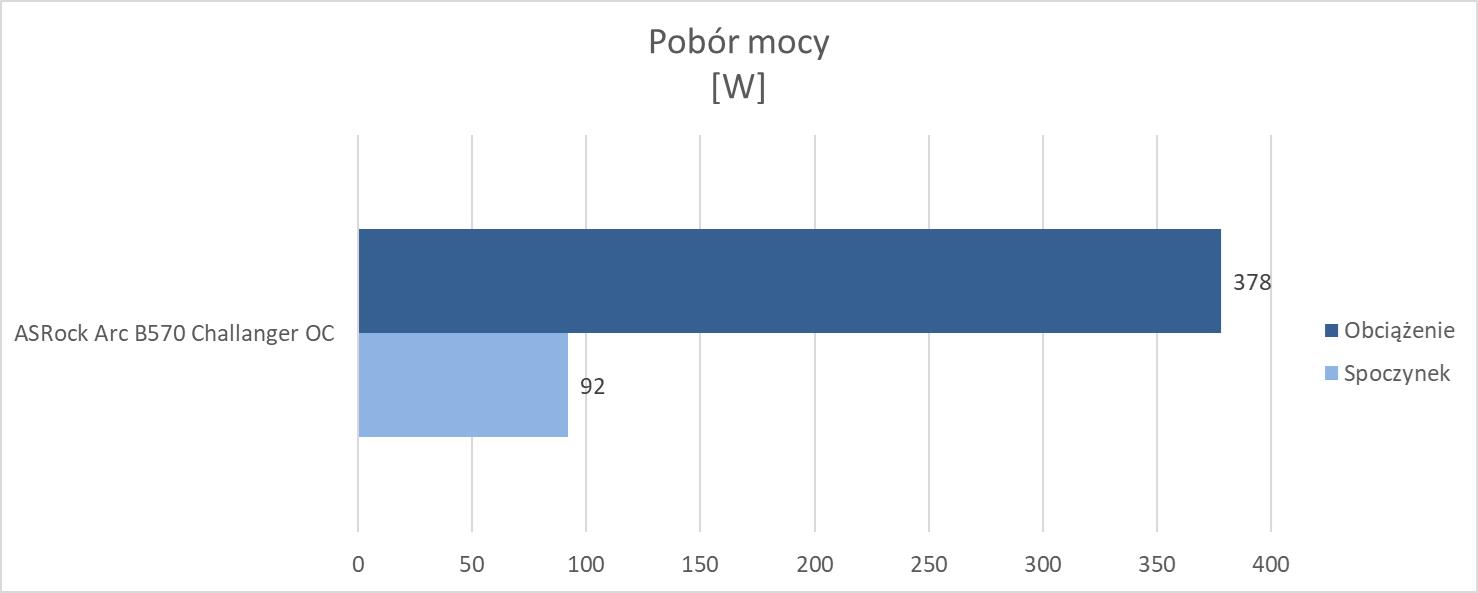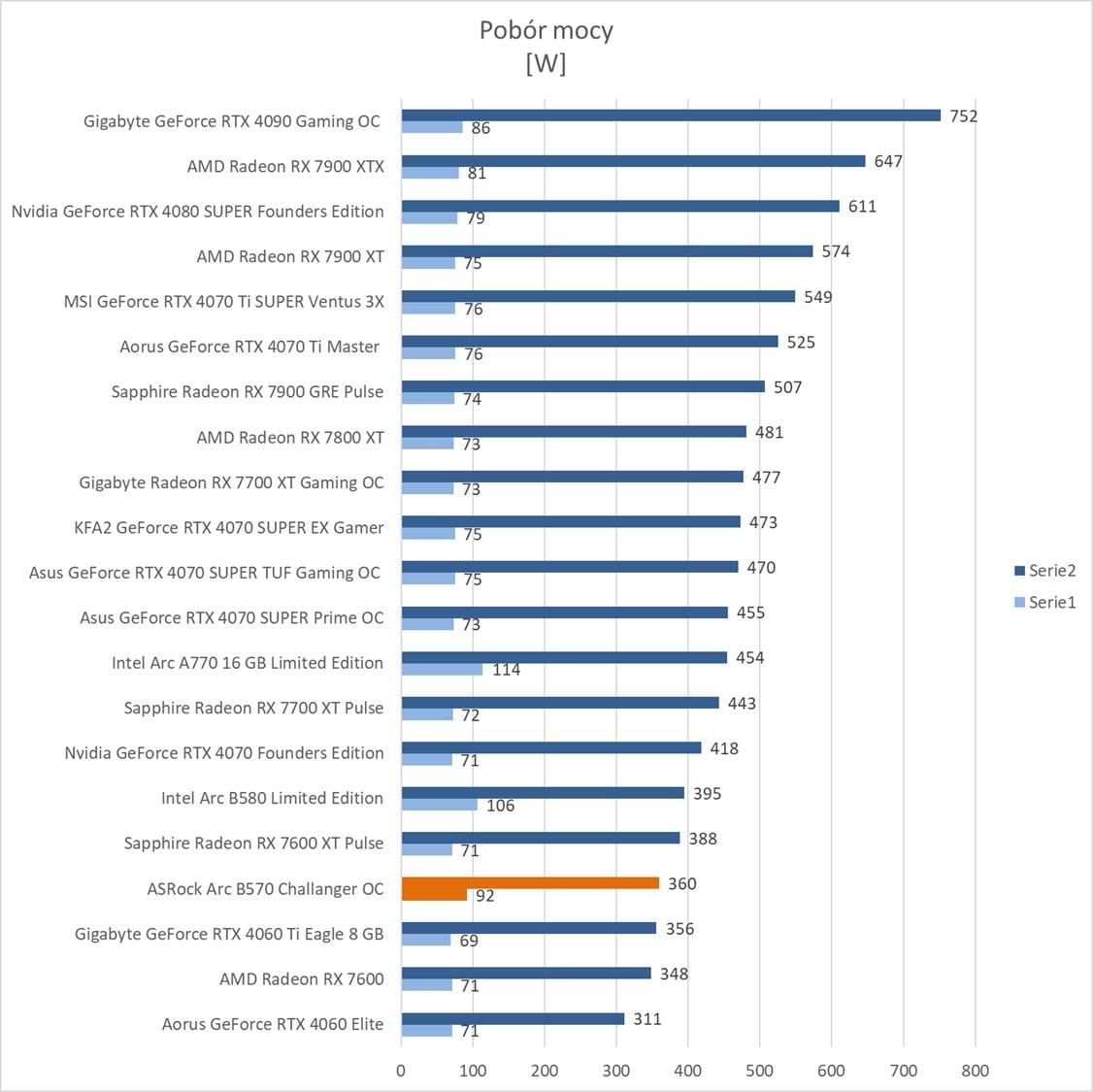 W spoczynku mamy wyższy pobór mocy od konkurencji. Ale gdy włączymy w BIOS ASPM oraz w Windowsie zarządzanie energią w zależności od stanu linku na maksymalny poziom to spada ono na poziom ok. 64 W i jest już bardzo dobrze. Pod obciążeniem karta pobiera trochę więcej mocy niż RX 7600, natomiast strata do RTX 4060 jest spora – tutaj mamy wynik na poziomie RTX 4060 Ti.