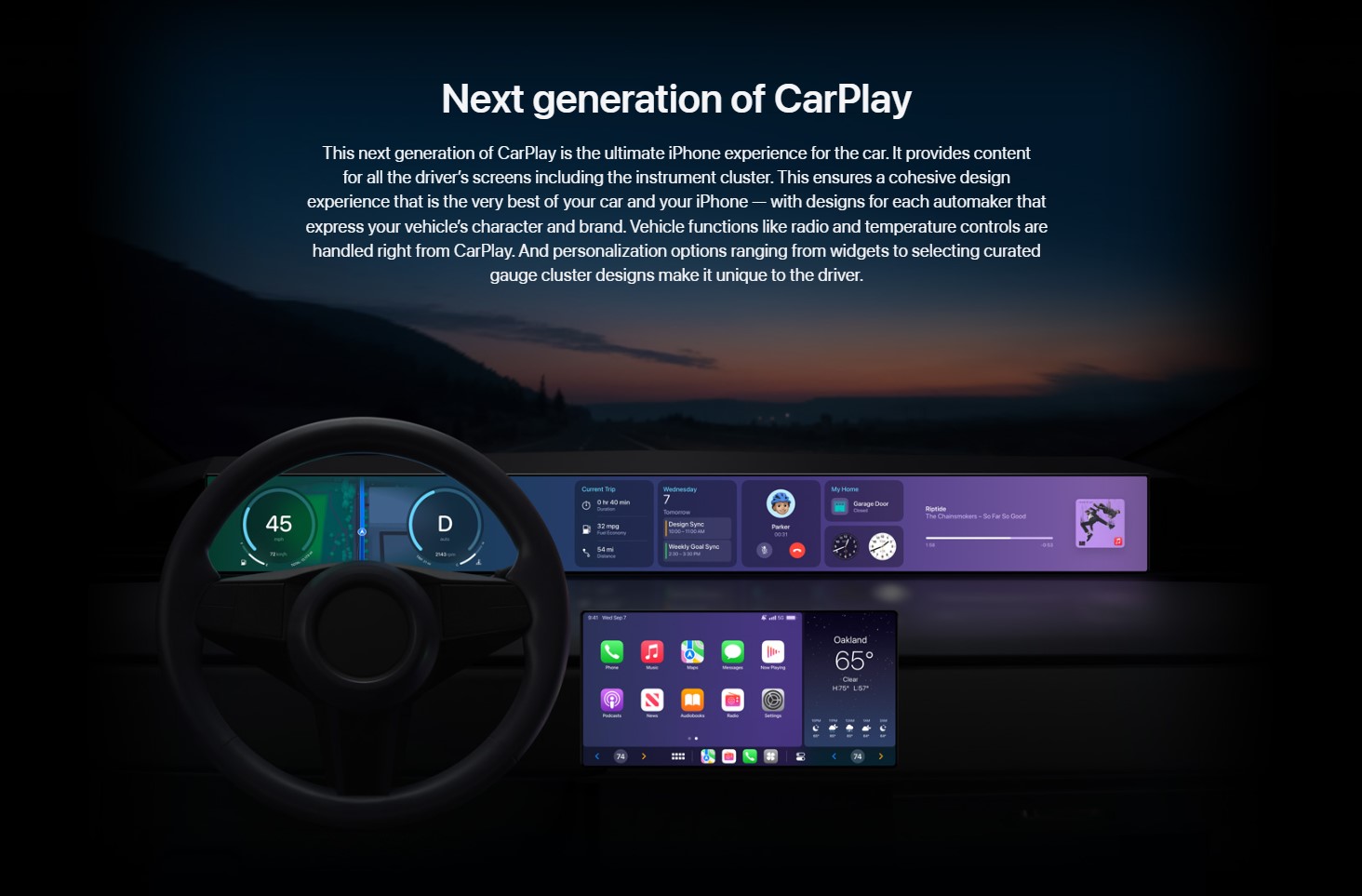 Następna generacja CarPlay bazuje na latach sukcesów i spostrzeżeń zdobytych dzięki CarPlay, oferując najlepsze cechy Apple i producenta samochodów w głęboko zintegrowanym i konfigurowalnym doświadczeniu. Nadal ściśle współpracujemy z kilkoma producentami samochodów, umożliwiając im zaprezentowanie ich unikalnej marki i filozofii wizualnego projektowania w kolejnej generacji CarPlay. Każda marka samochodowa podzieli się większą ilością szczegółów, gdy zbliży się do ogłoszenia swoich modeli, które będą obsługiwać następną generację CarPlay.