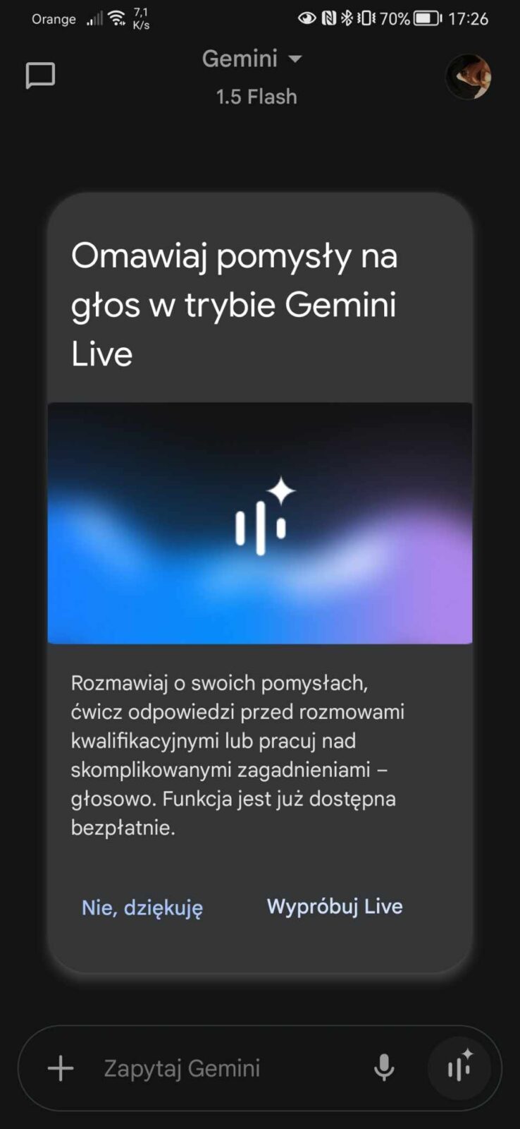 Pierwszym krokiem do przybliżenia nam Gemini Live było przeniesienie go do darmowej wersji, ale tak naprawdę najbardziej znaczące ulepszenie trafiło w nasze ręce teraz. Model sztucznej inteligencji zaczął bowiem rozmawiać po polsku. Udostępnianie obsługi naszego języka jest stopniowe, więc działa raczej na zasadzie ruletki – jedni dostają, inni muszą jeszcze troszkę poczekać i to niezależnie od modelu. U mnie – na Huawei P30 Pro – Gemini Live już działa.